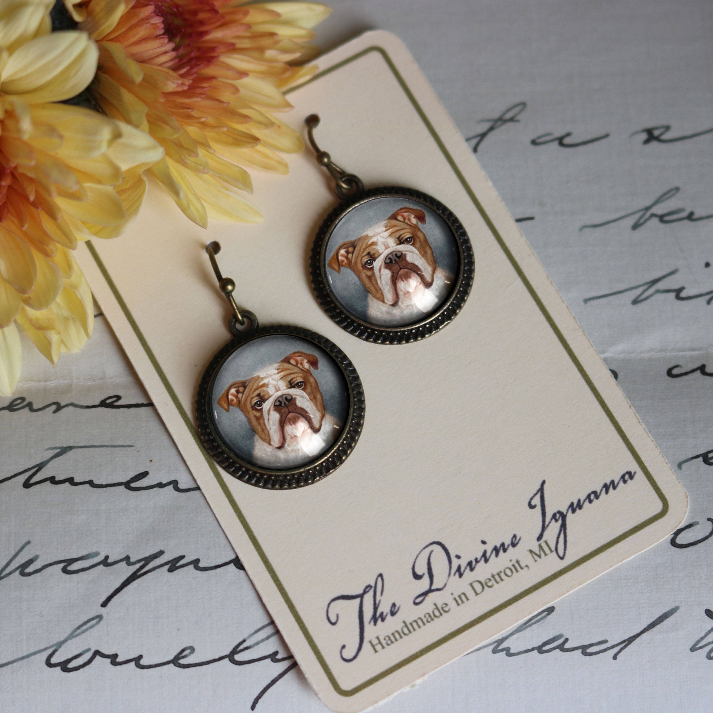 Our reversed decoupage glass cabochons are lovingly hand made in a home studio in Detroit, MI. The cabochons are carefully color matched and set in hand wrapped findings. This handmade process makes each set of bulldog earrings unique; expect subtle variations in color and clarity from pair to pair.