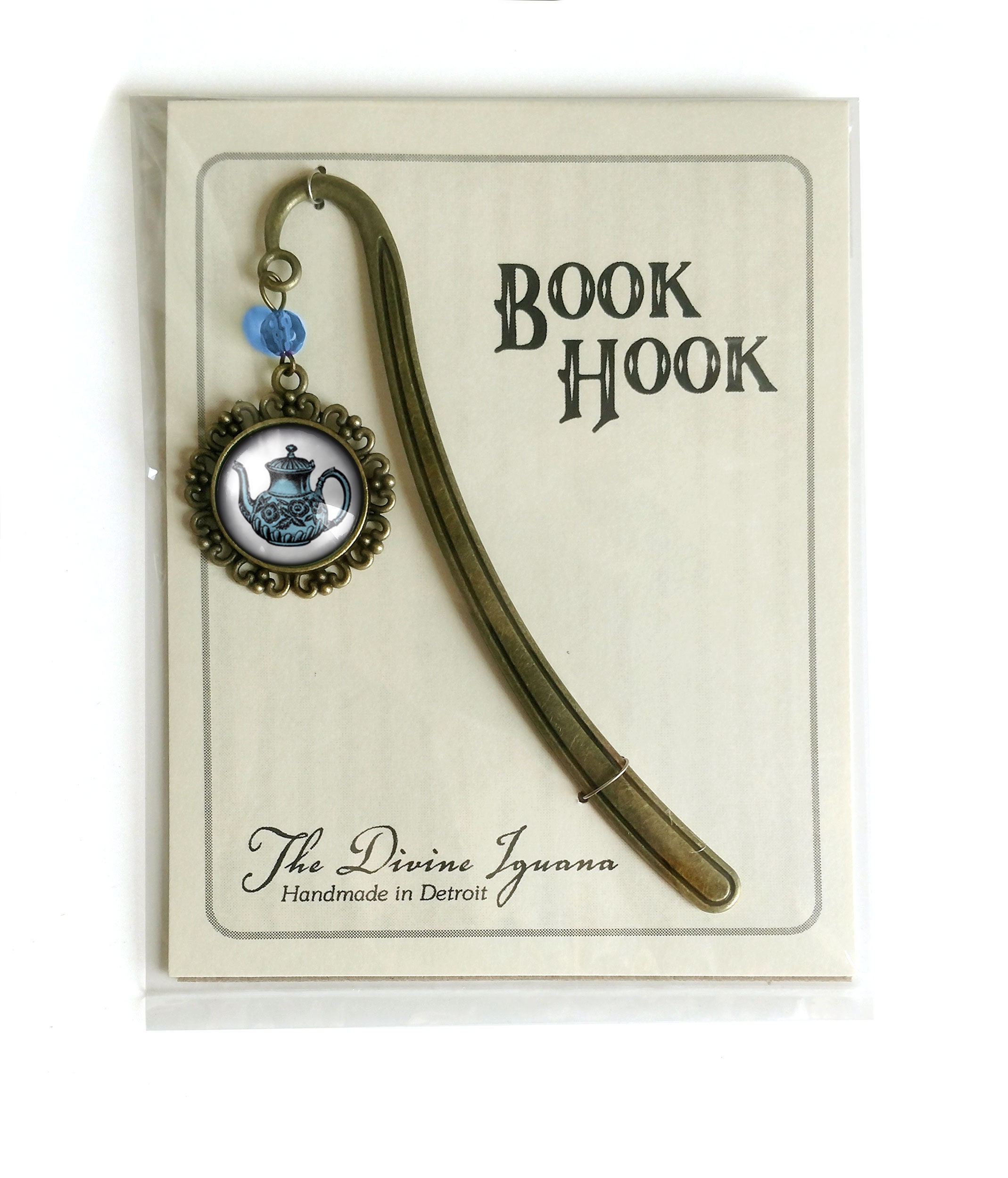 The teapot book hook comes packaged for easy gift giving.