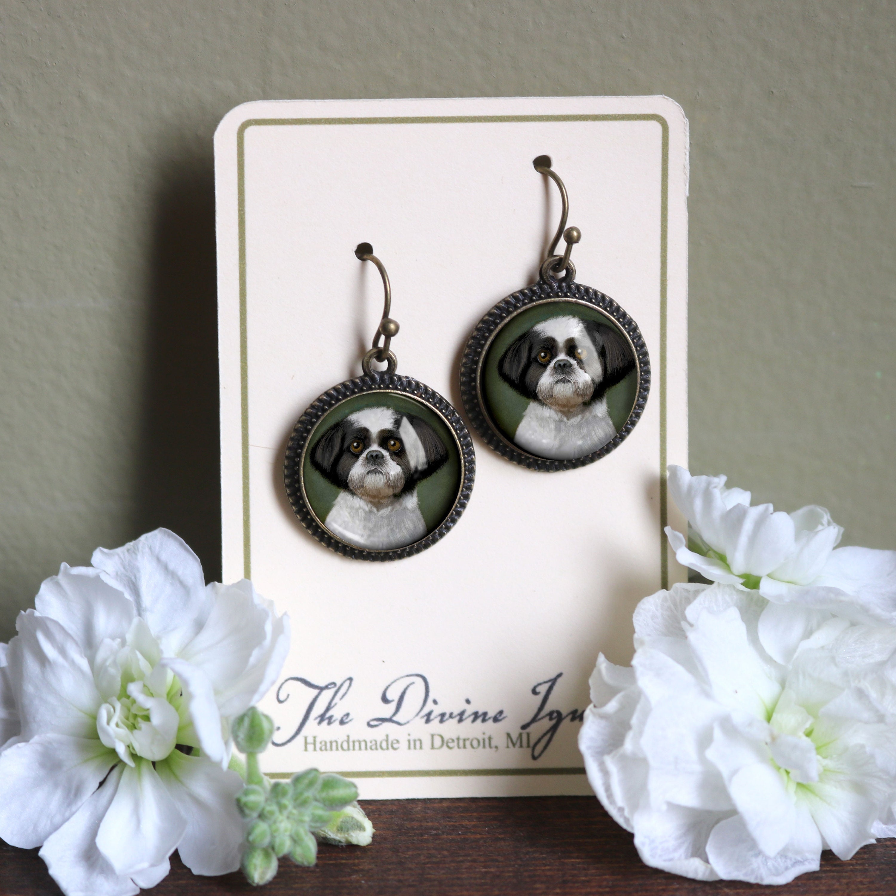 Our reversed decoupage glass cabochons are lovingly hand made in a home studio in Detroit, MI. The cabochons are carefully color matched and set in hand wrapped findings. This handmade process makes each set of shitzu earrings unique; expect subtle variations in color and clarity from pair to pair.