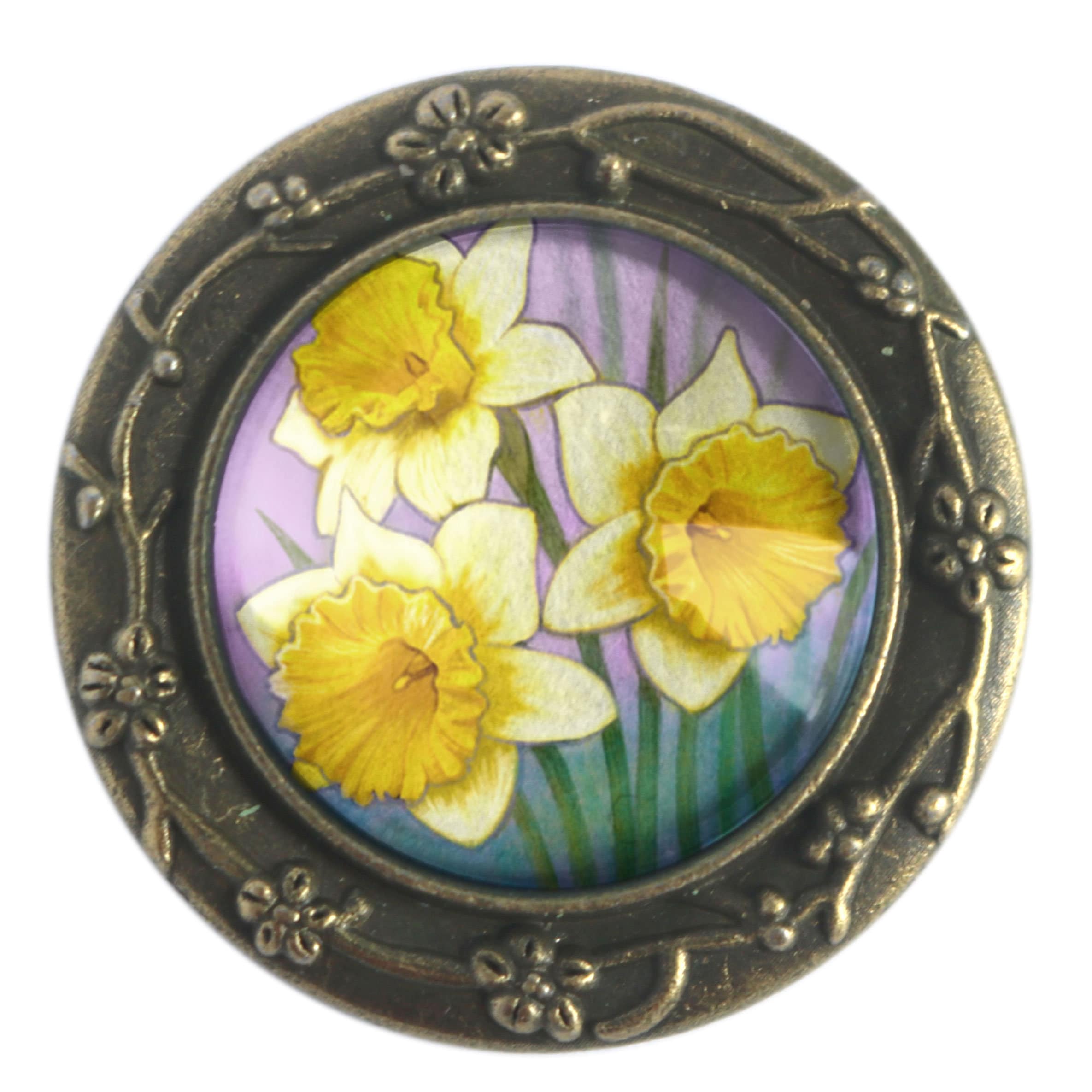 Elegant Art Nouveau Daffodil brooch with reversed decoupage glass cabochon. Our daffodil brooch has an antiqued bronze finish for a warm, heirloom appearance.