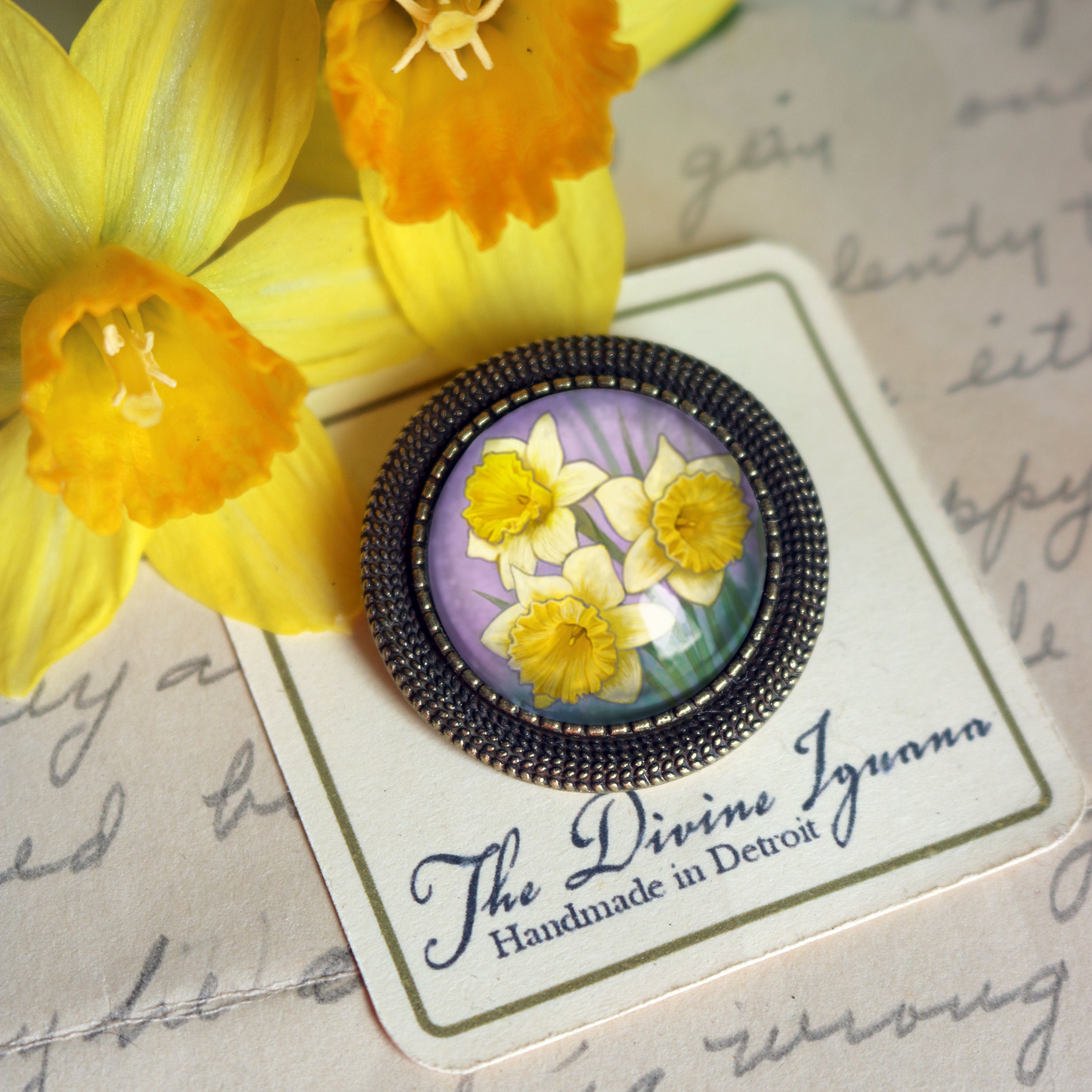 NOTE: The floral bordered backing for this brooch is currently OUT OF STOCK. The daffodil brooch will ship with a simpler backing, like our other brooches.
