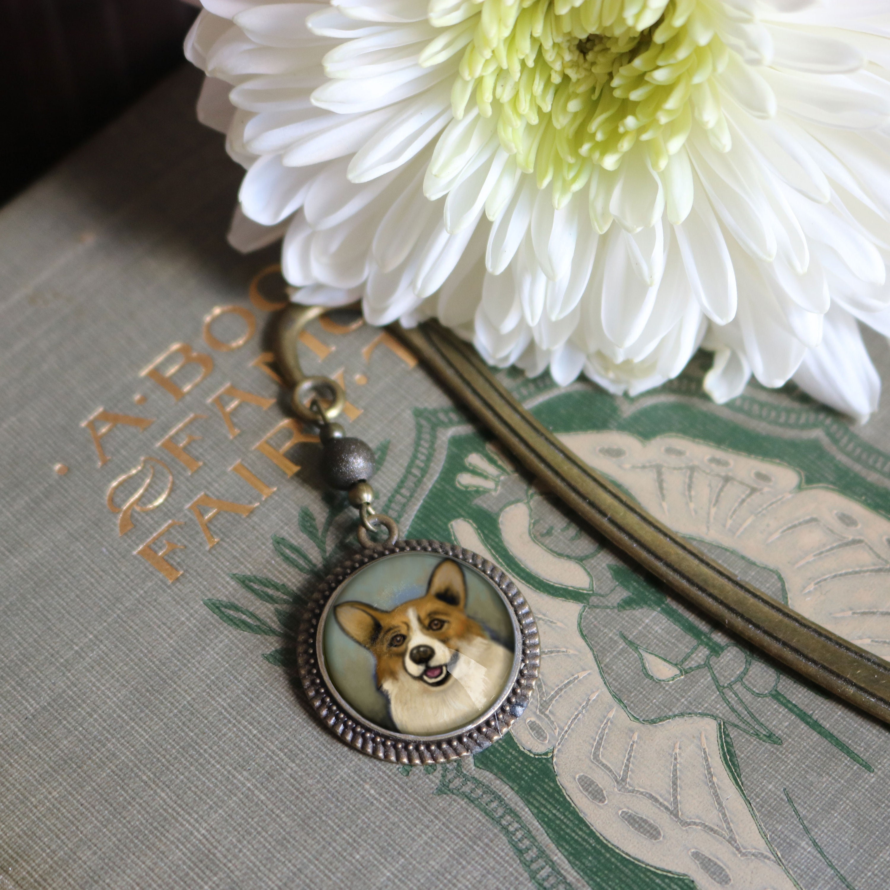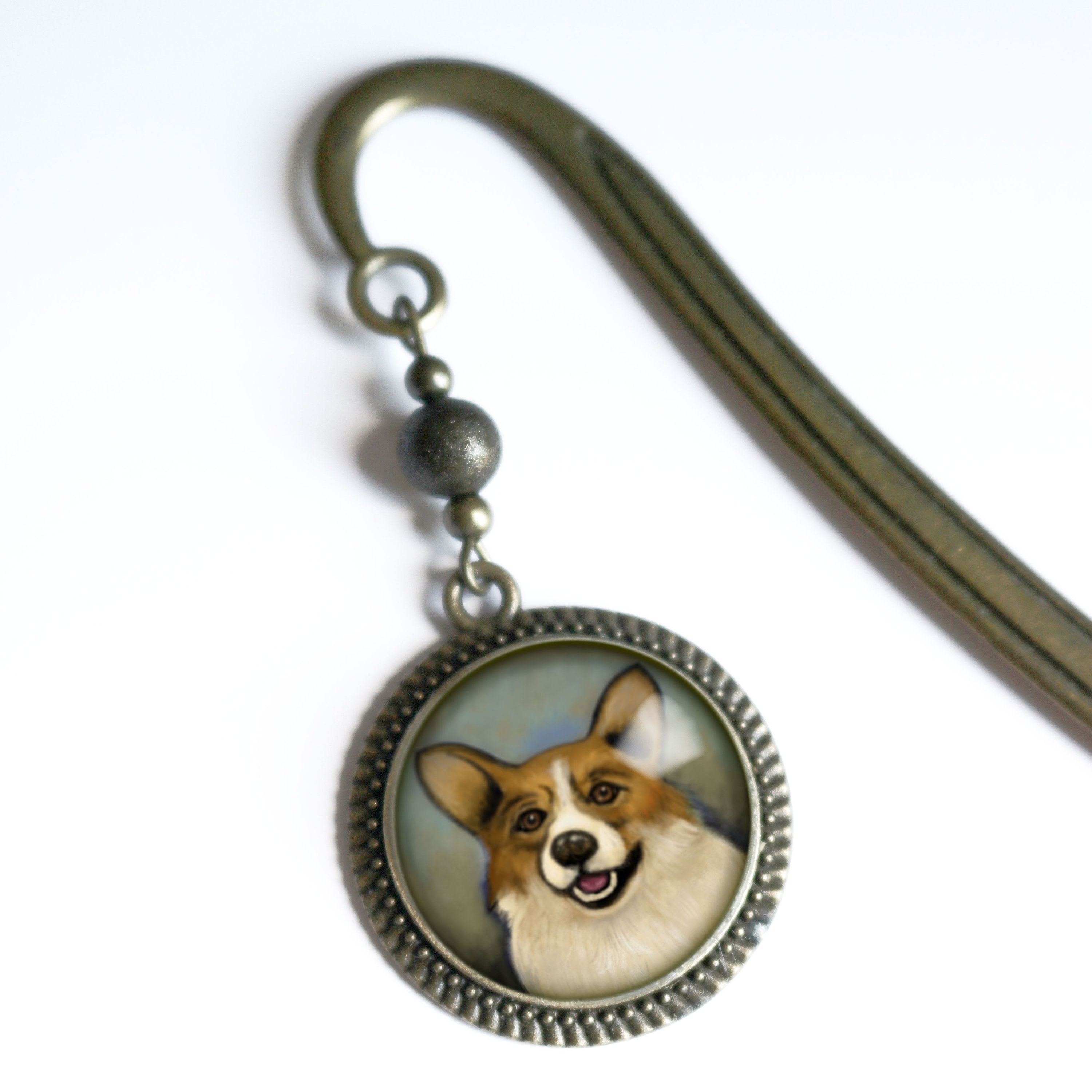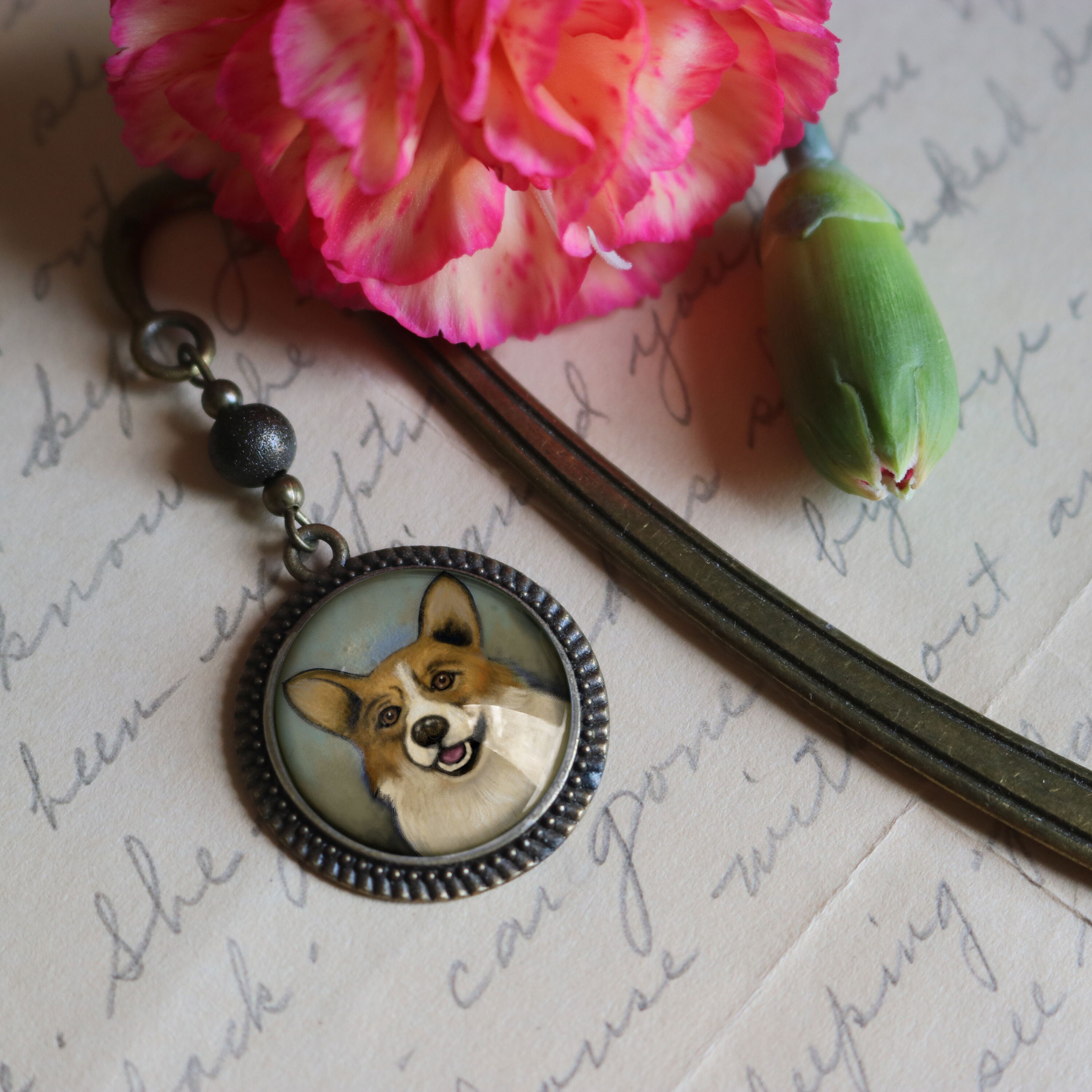 An elegant gift for your favorite pleasure reader, teacher, or author. Our sturdy brass book mark slides down between the pages of your book with the ornamental reverse decoupage brass and glass accent dangles along the spine.