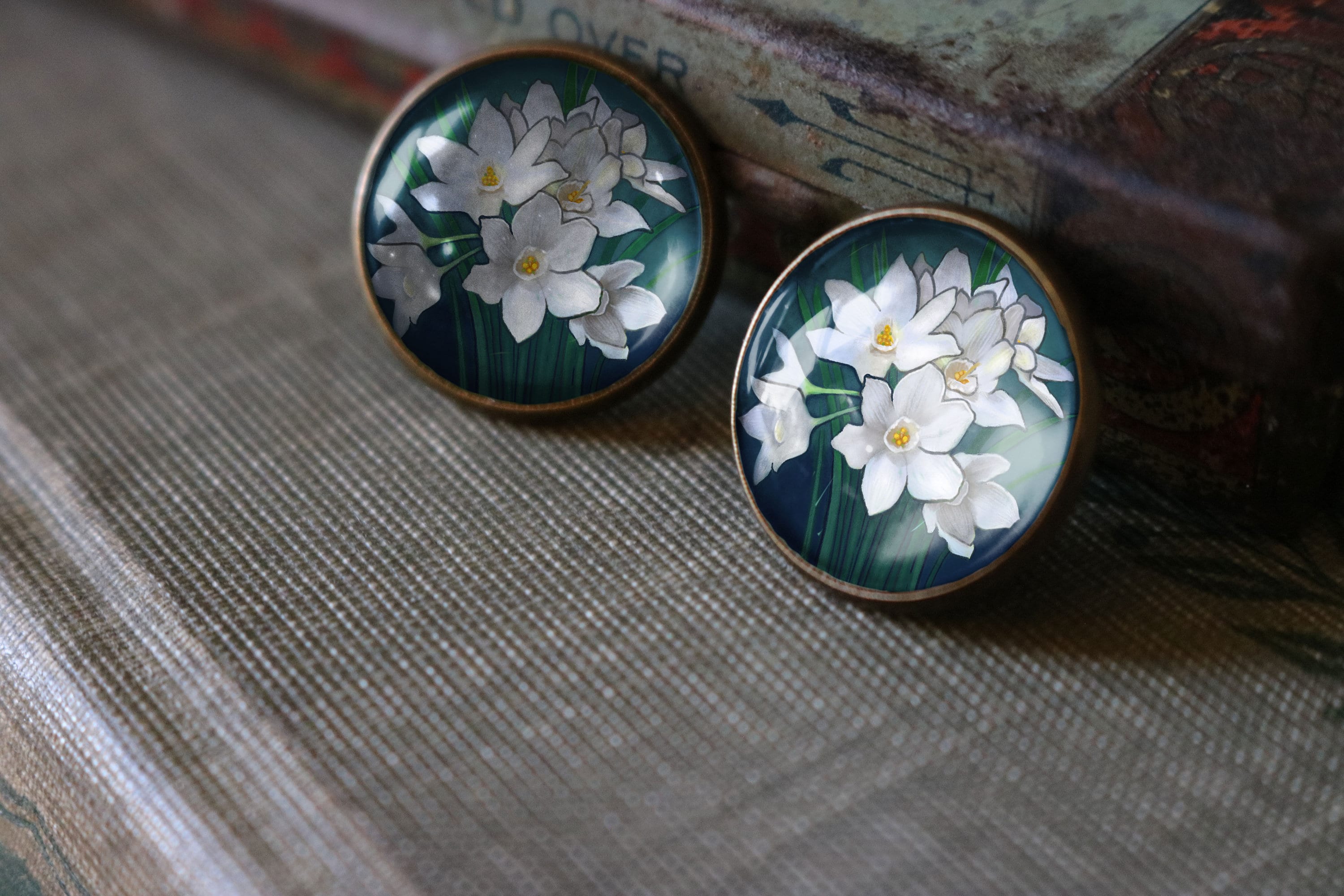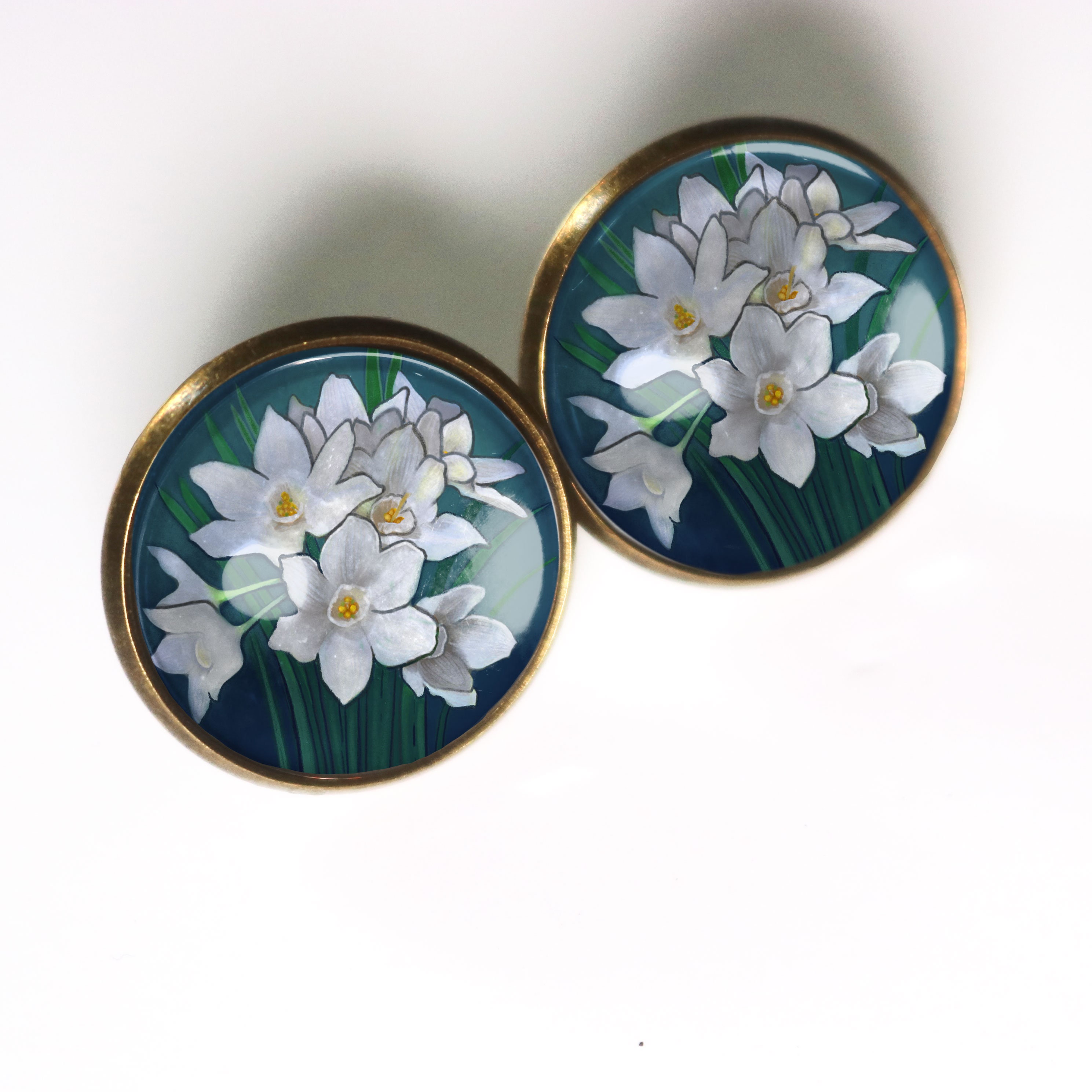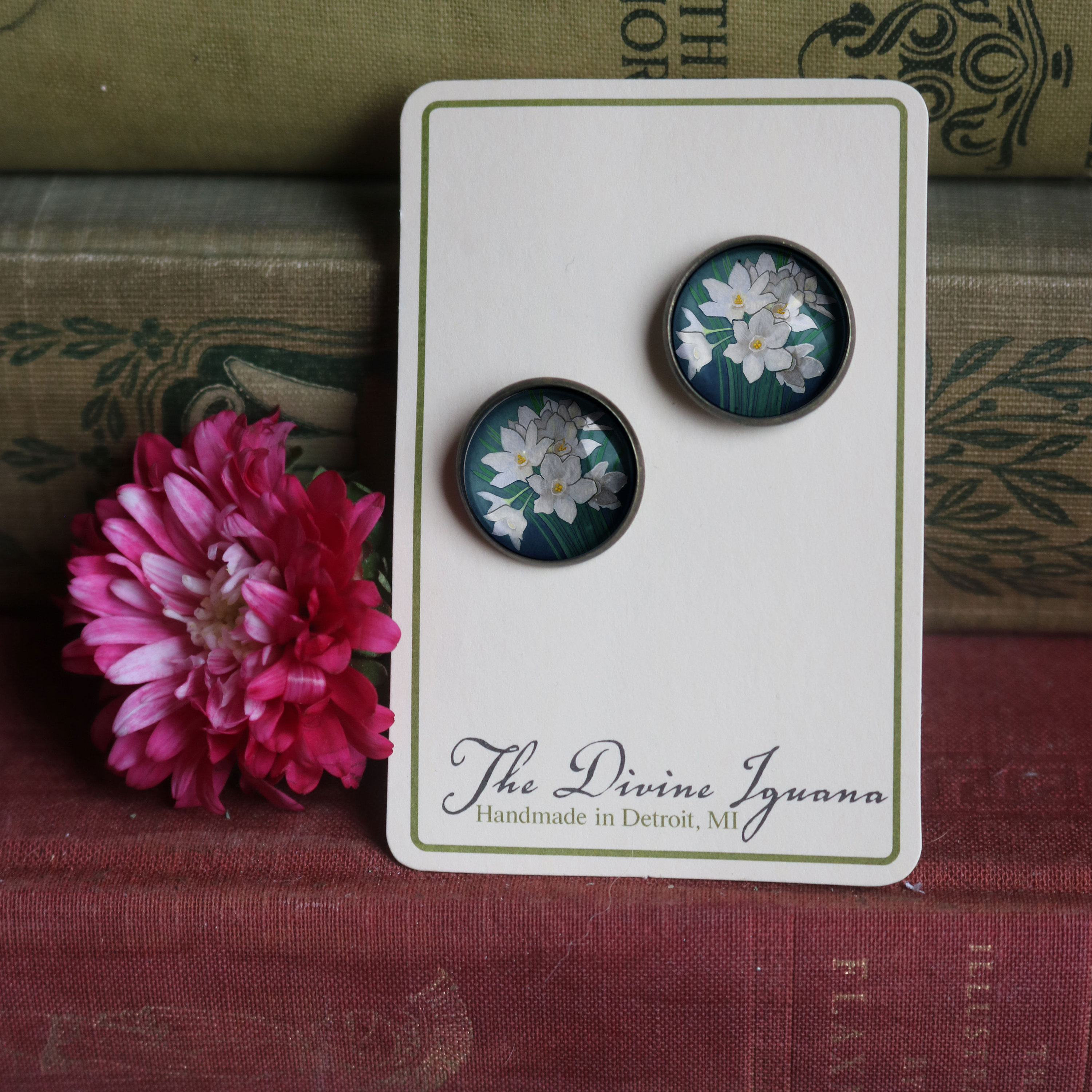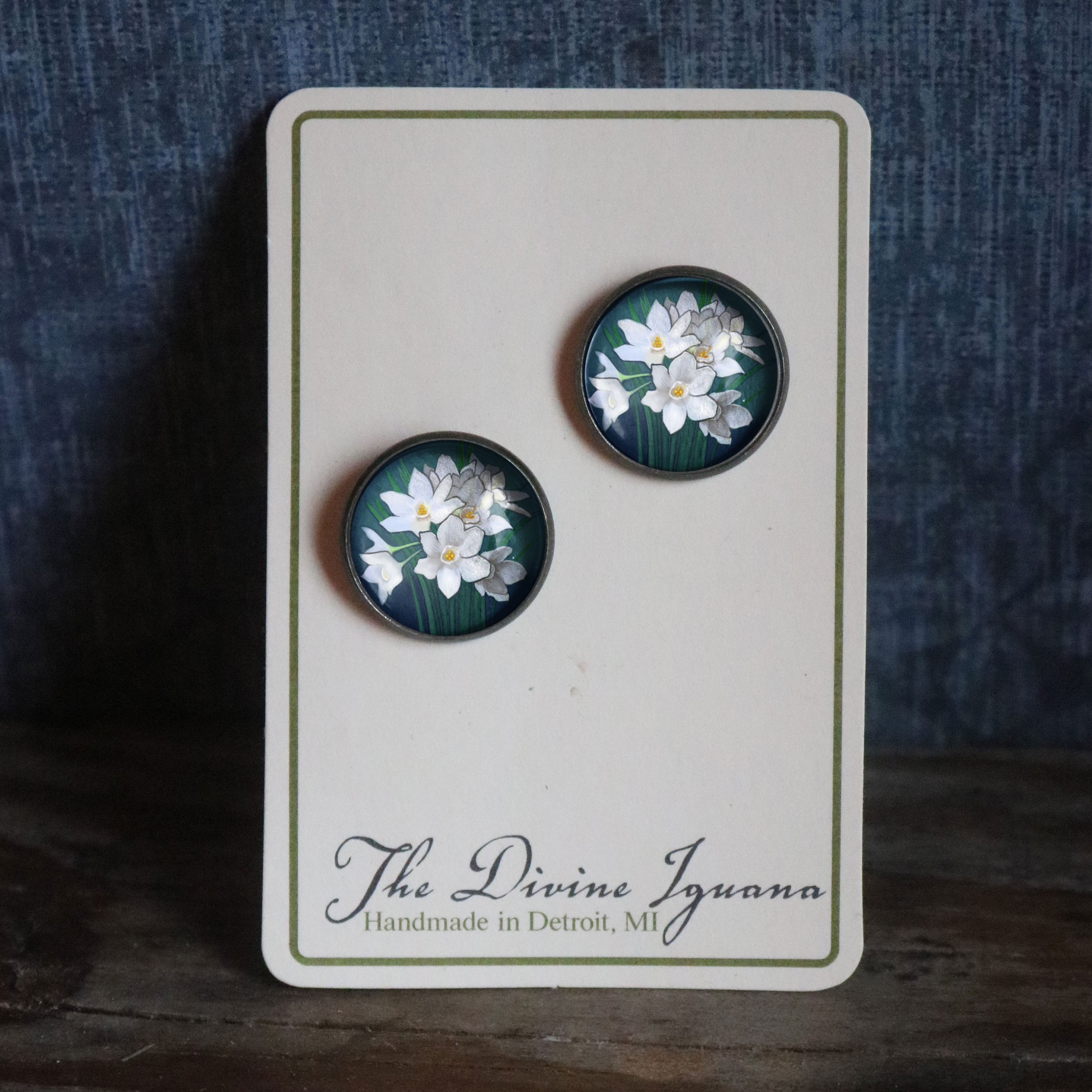 Lovely limited run earrings with an elegant paperwhite narcissus design exclusively available through the Divine Iguana.