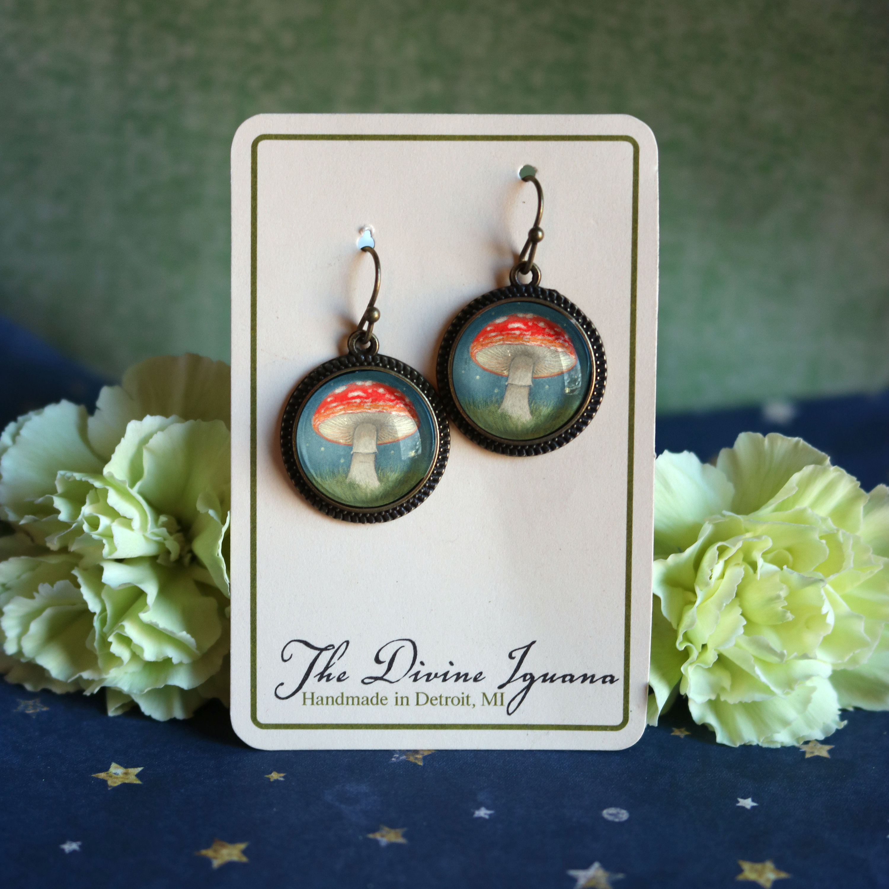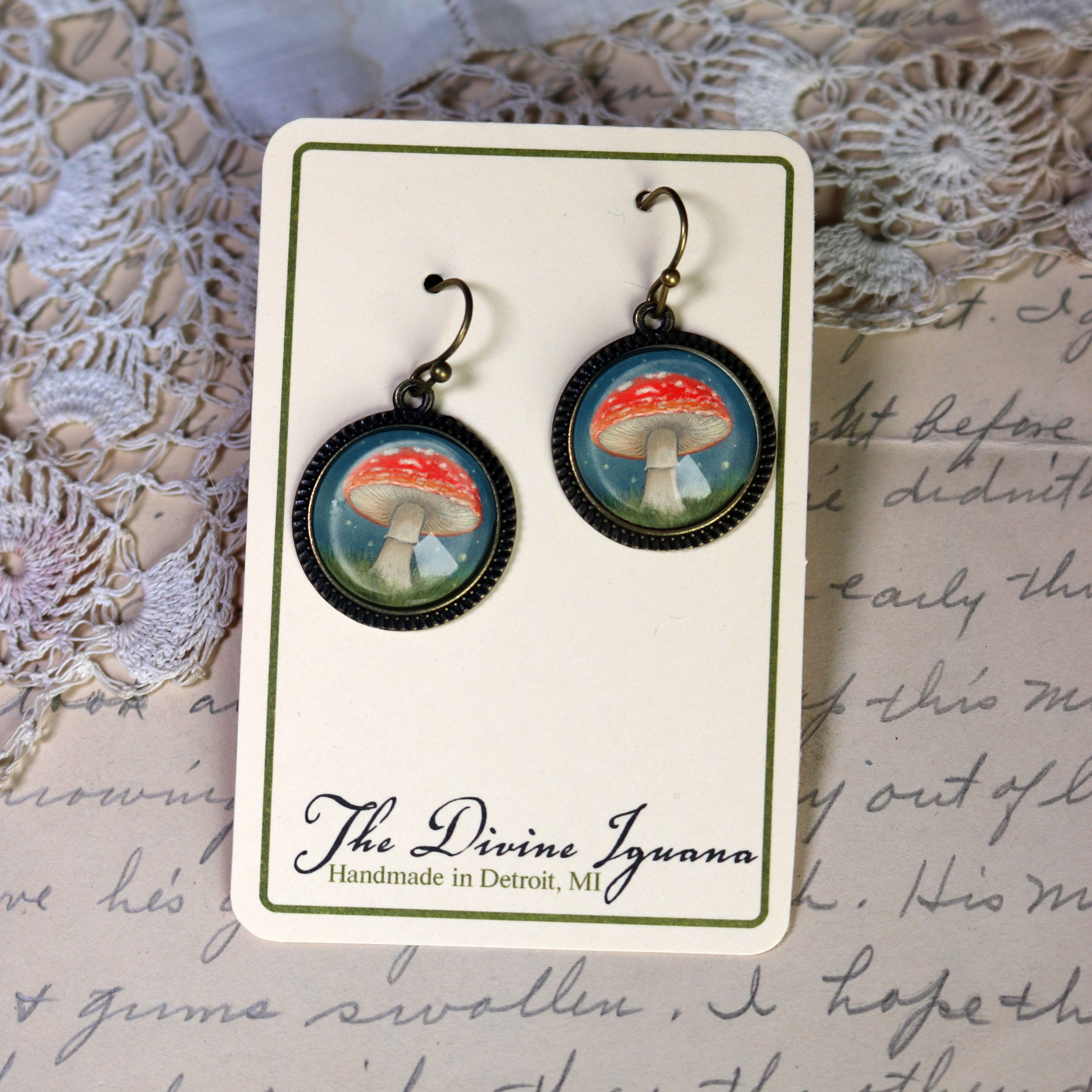 Our reversed decoupage glass cabochons are lovingly hand made in a home studio in Detroit, MI. The cabochons are carefully color matched and set in nickel-free bronze findings.