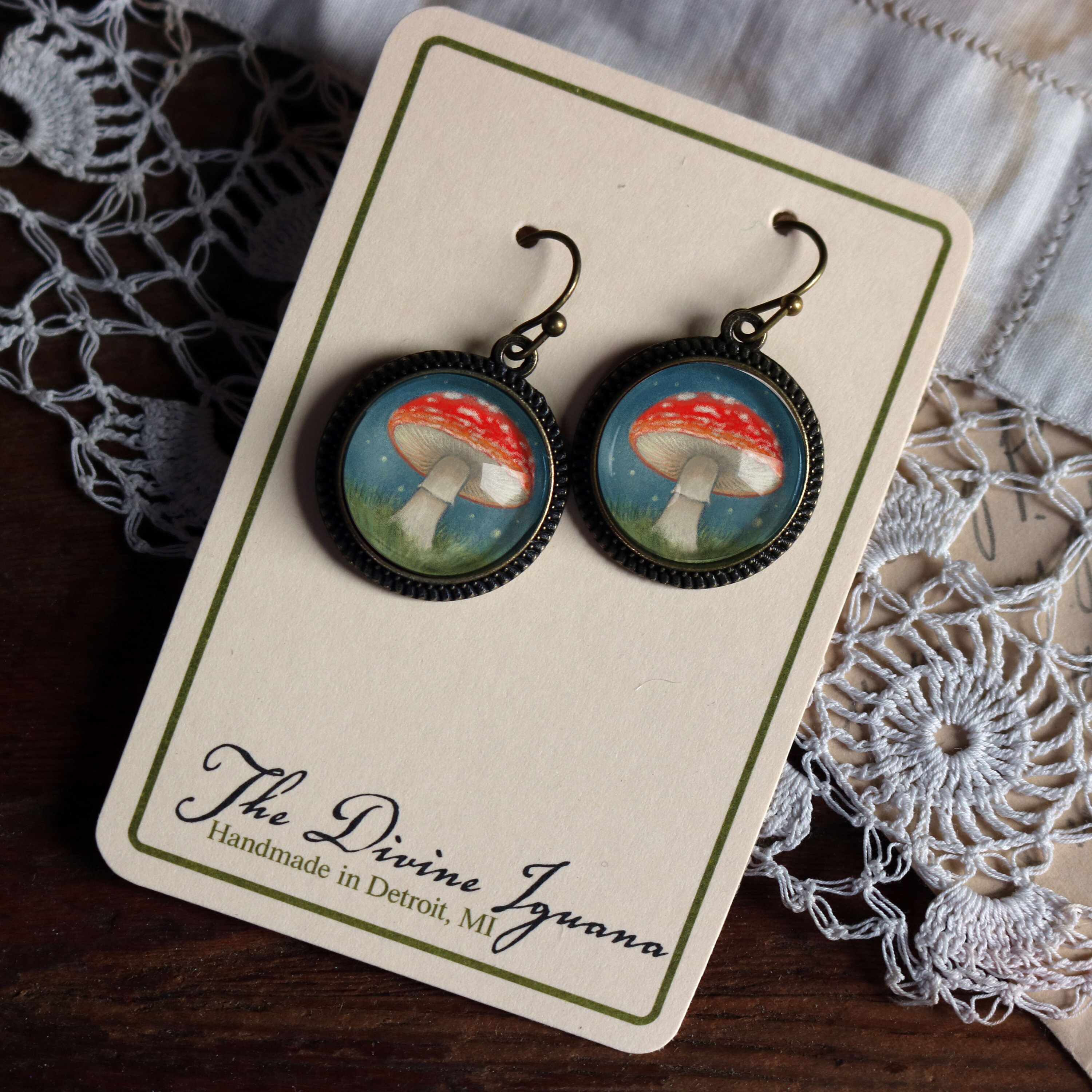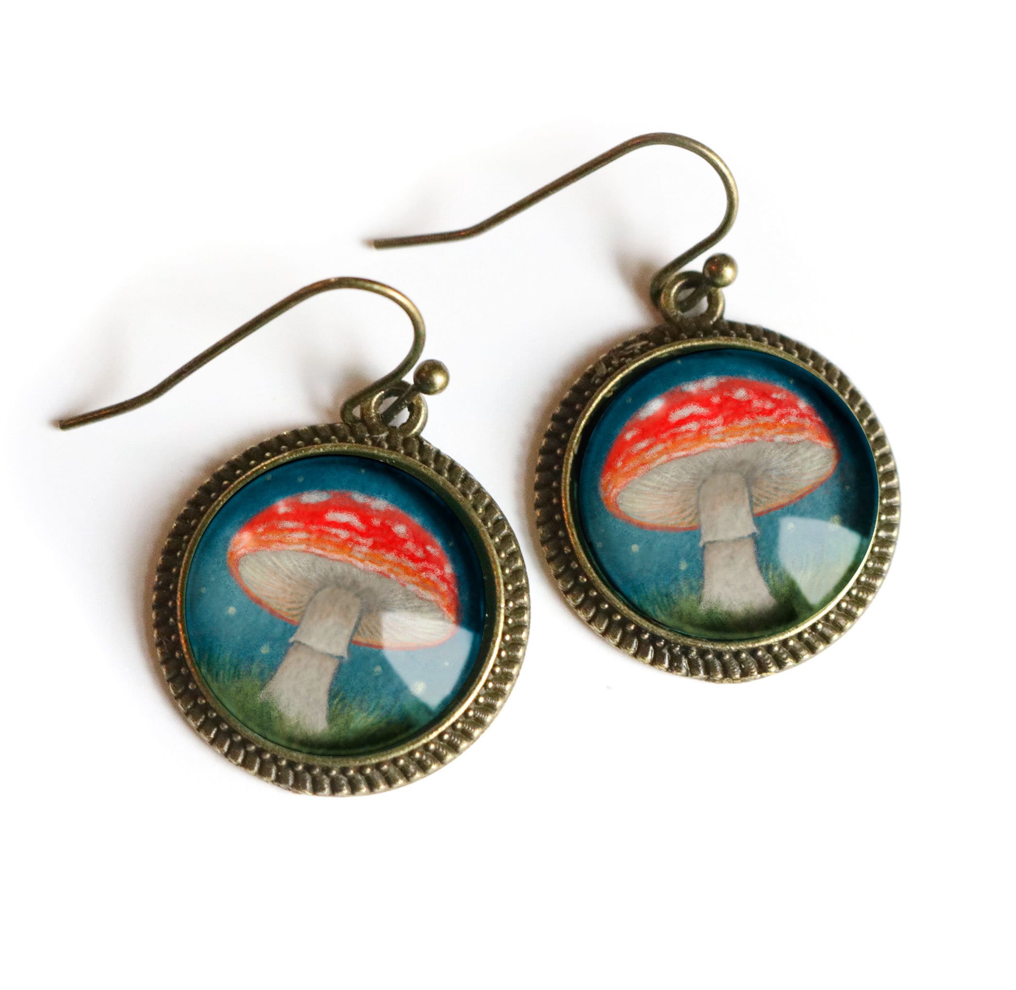 Whimsical amanita mushroom earrings in simple bronze bezel. Original artwork by Rena Hopkins, inspired by Edwardian children's fairytale illustrations.