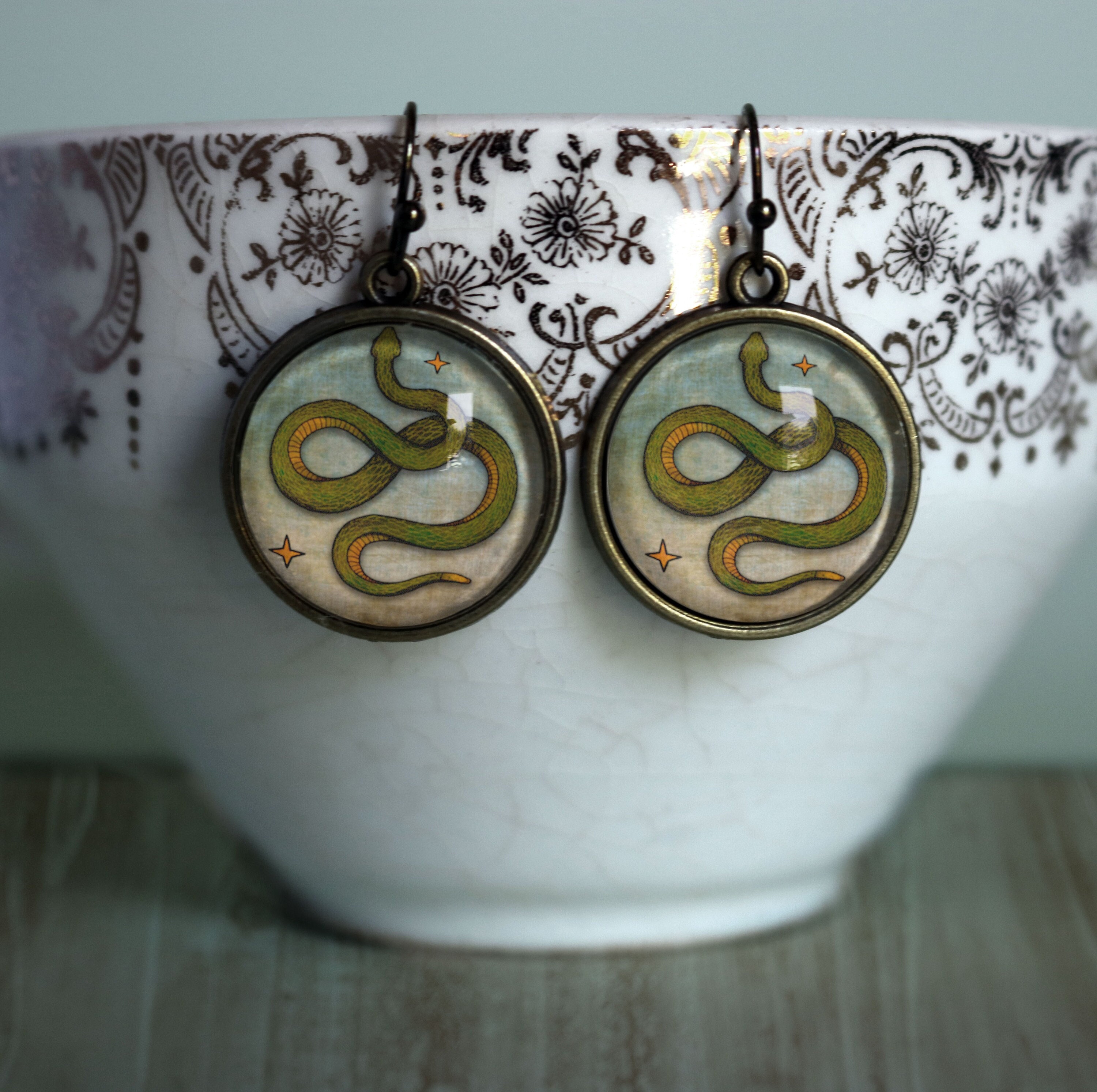 Reverse decoupage glass cabochon items, like these snake earrings, are water resistant but not water proof. Do not wear while bathing or swimming. Wipe clean with a soft cloth.