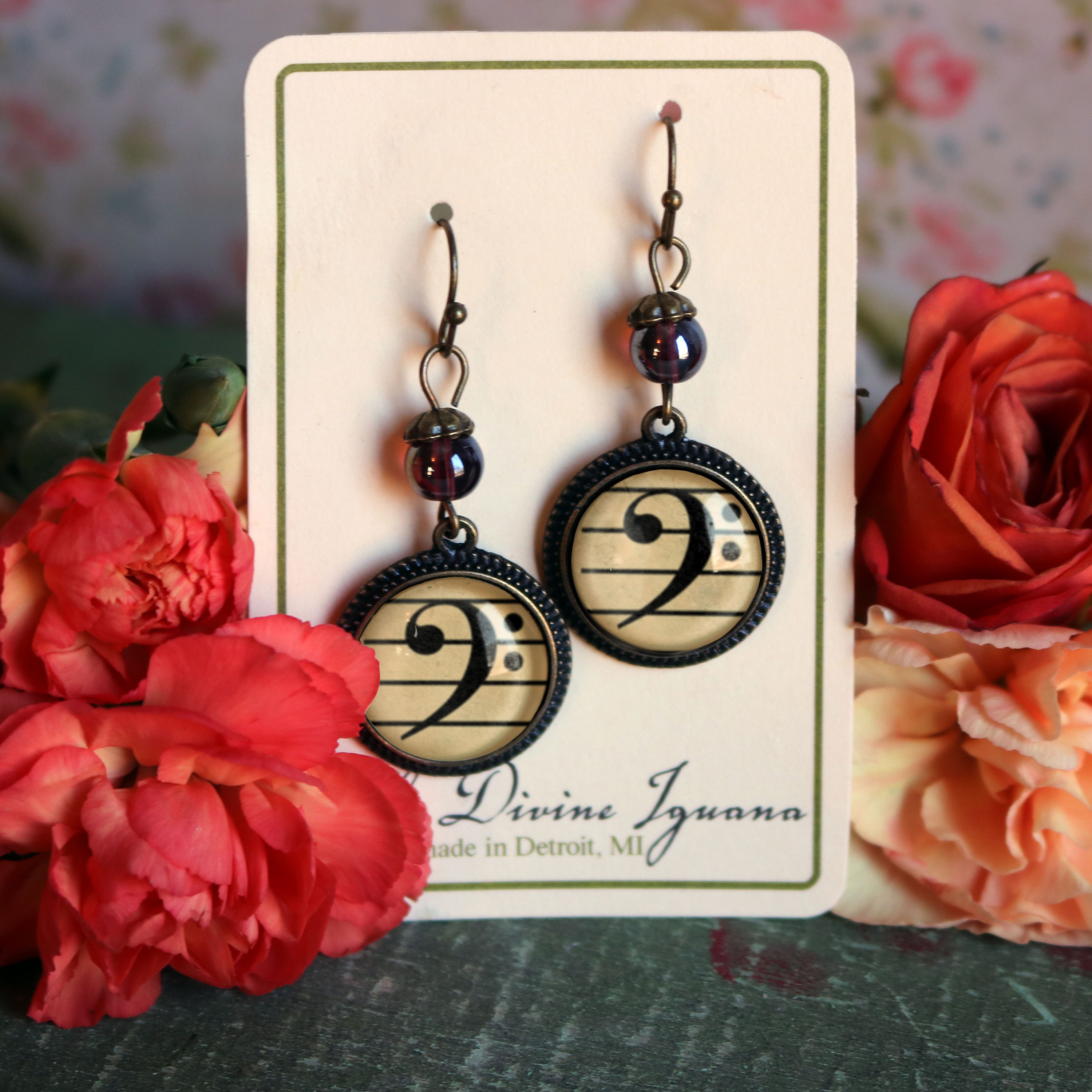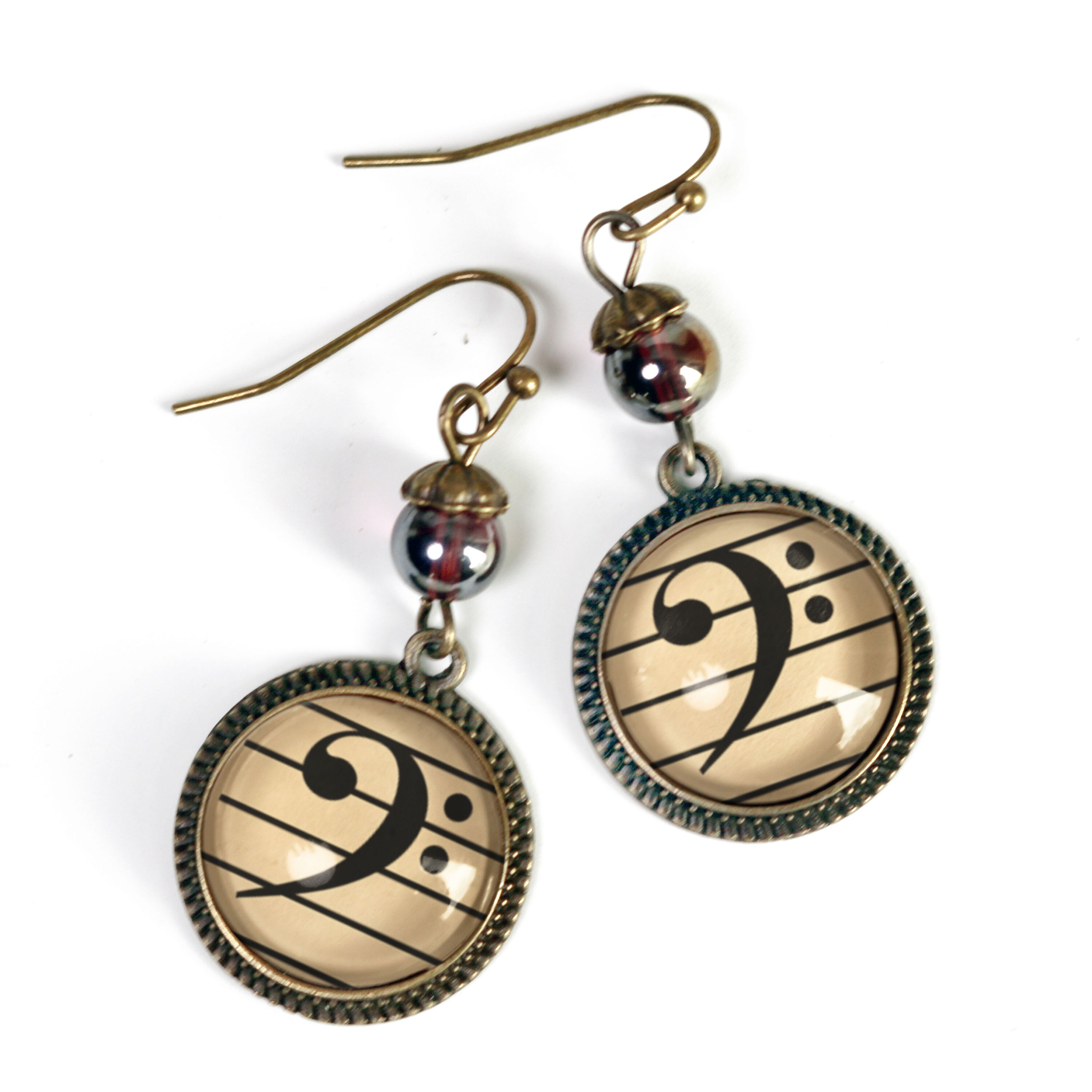 Discover the elegance of our handcrafted earrings, made from nickel-free bronze with an antiqued finish for a timeless, vintage look. These lightweight earrings feature reverse decoupaged glass cabochons showcasing antique sheet music with a striking Bass clef design, set beneath a beautiful iridescent purple and brown glass bead.