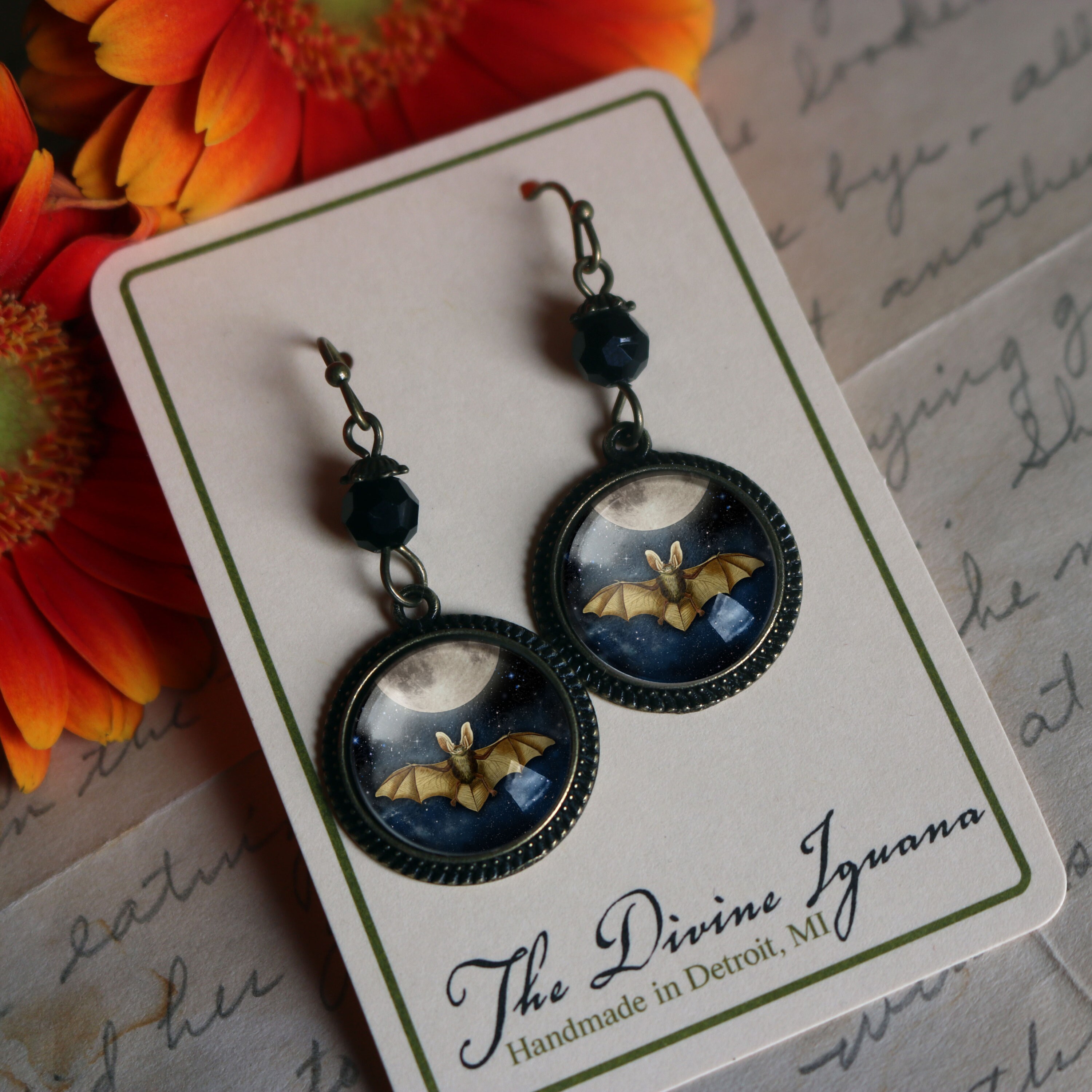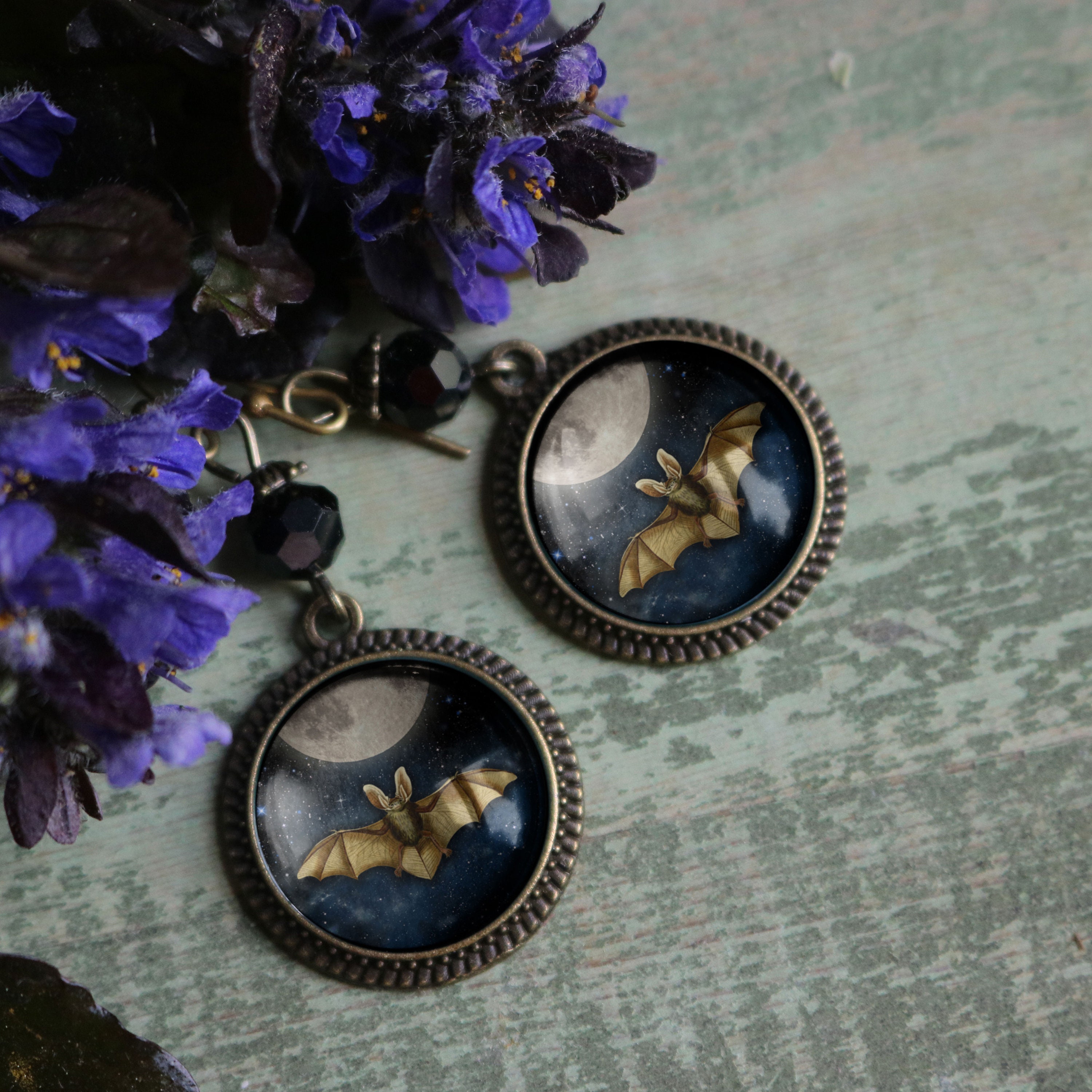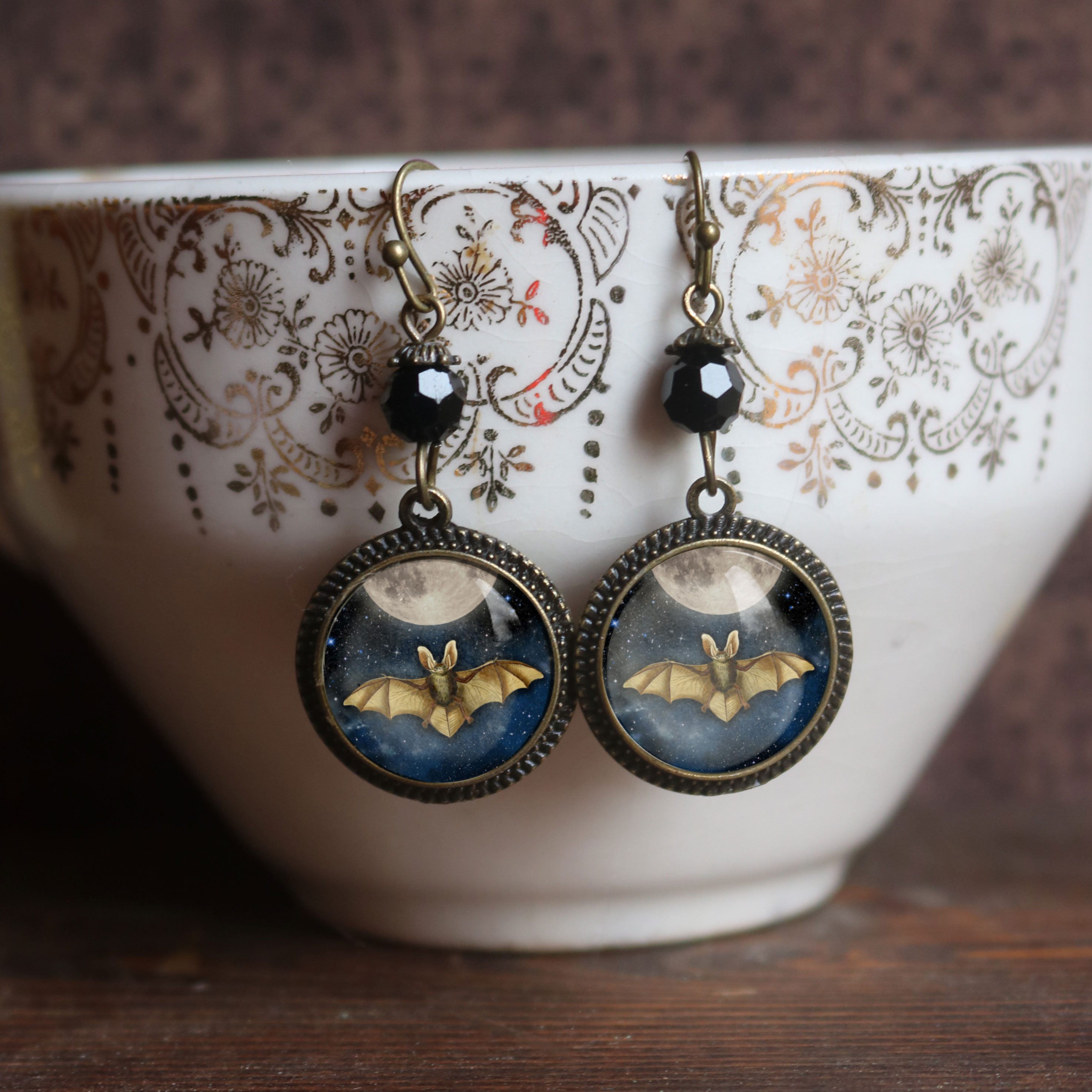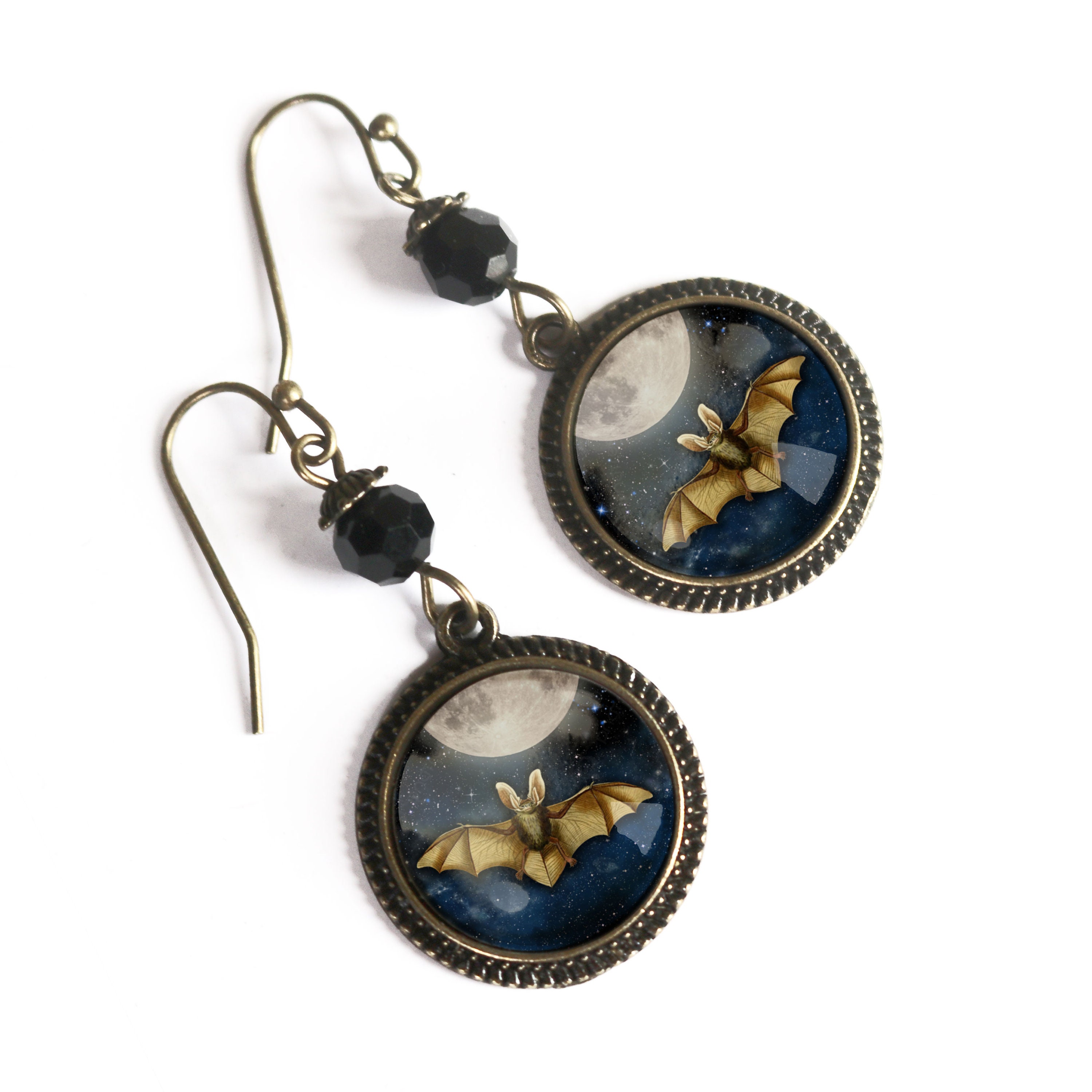 Wear a bit of magic with our Moonlit Bat earrings. Fluttering bats poised beneath the full moon, encased behind a dome of glass and then set into simple bronze bezels. Each earring is hand made in a home studio.
