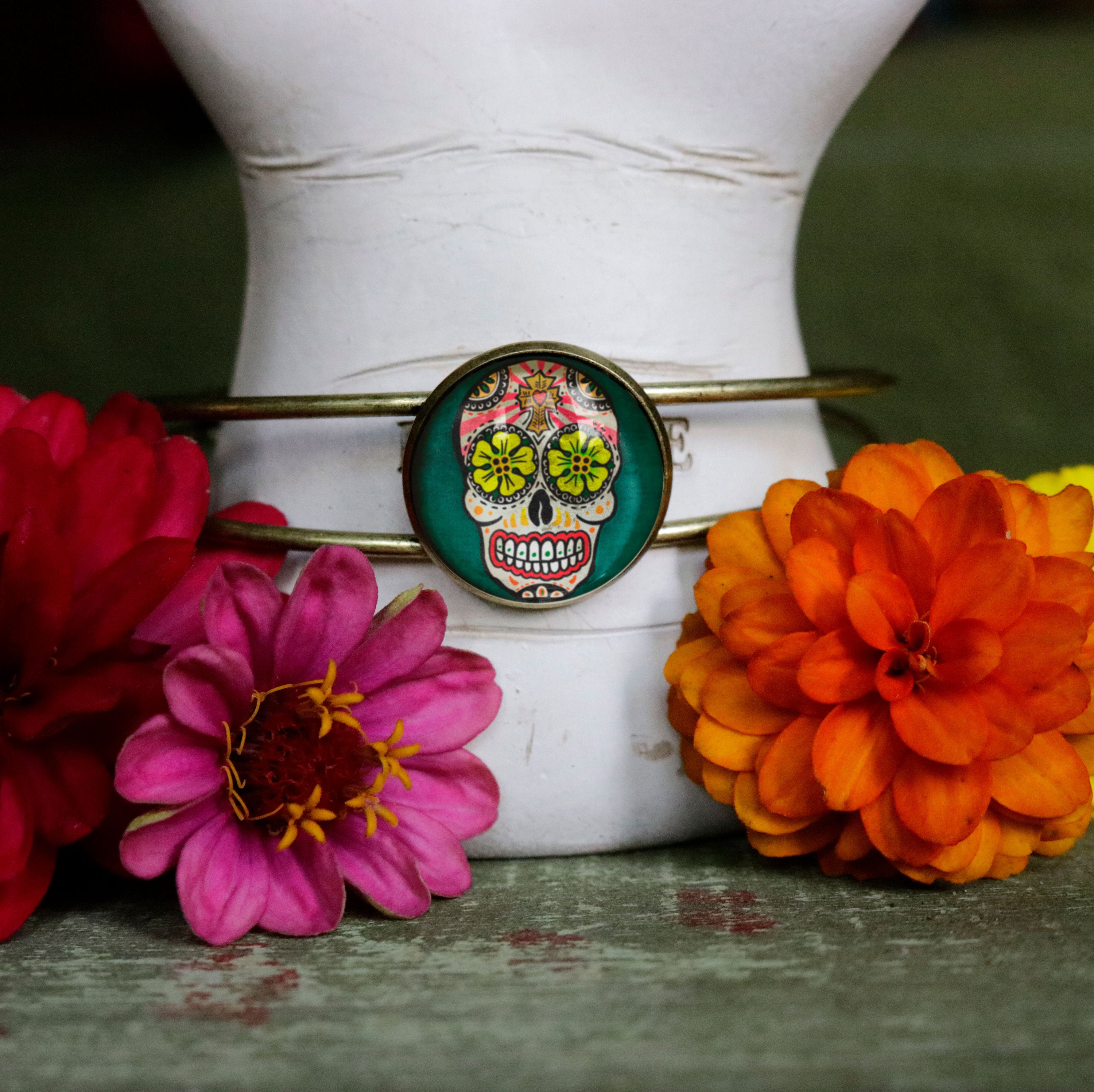 Celebrate the Dia de Los Muertos with our lovely sugar skull bangle. Our Day of the dead bracelet features an original Sugar Skull illustration by Rena Hopkins of the Divine Iguana.