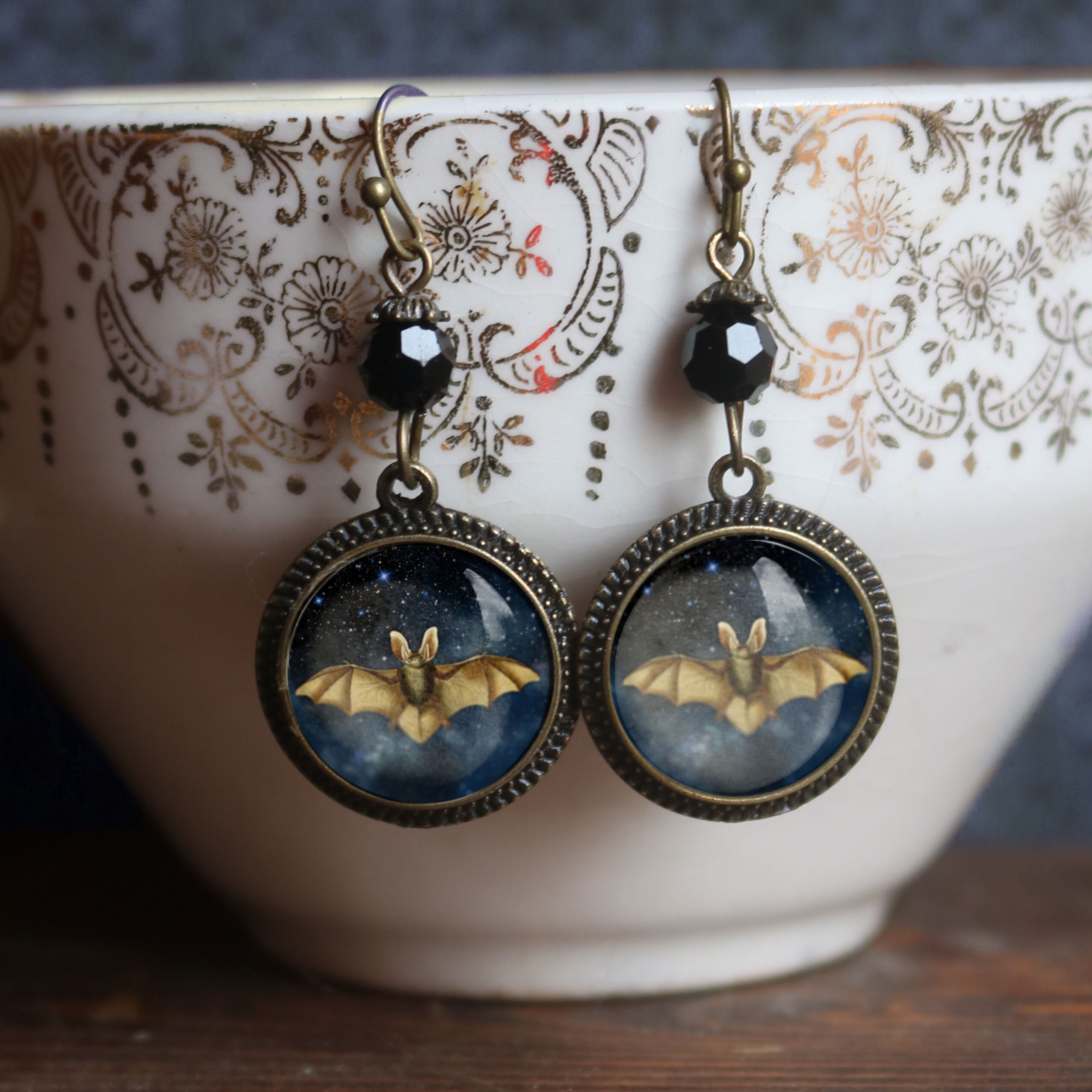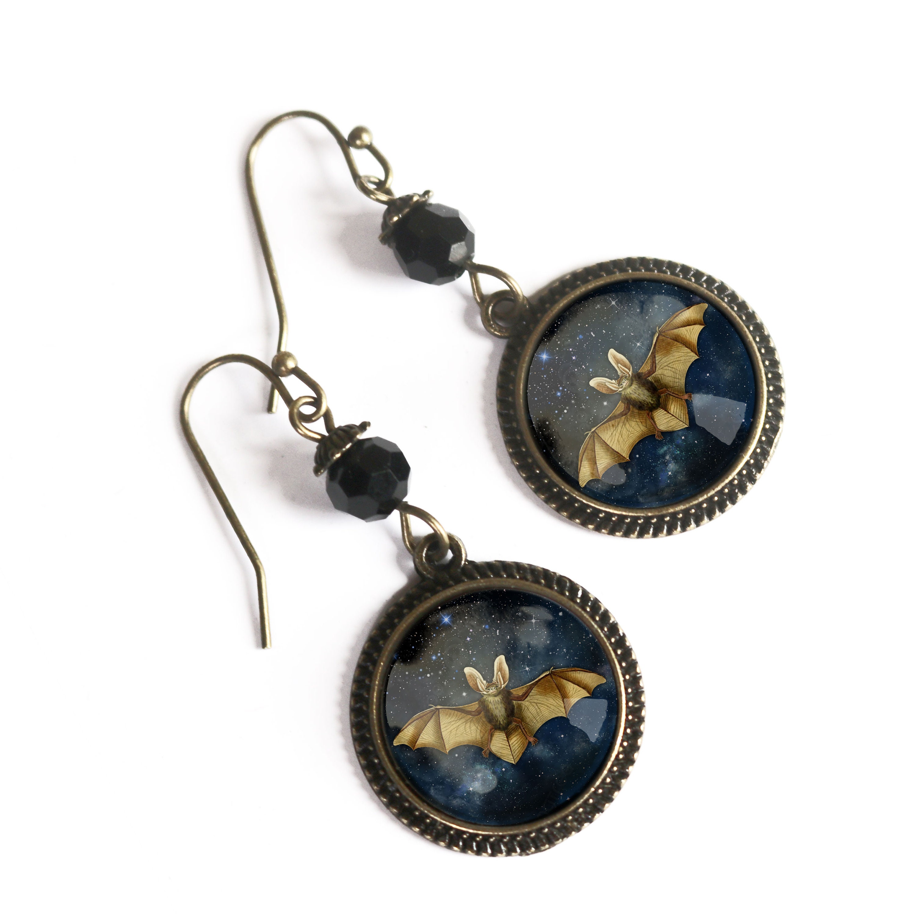 Wear a bit of magic with our Moonlit Bat earrings. Fluttering bats poised before a star-filled sky, encased behind a dome of glass and then set into simple bronze bezels. Each earring is hand made in a home studio.