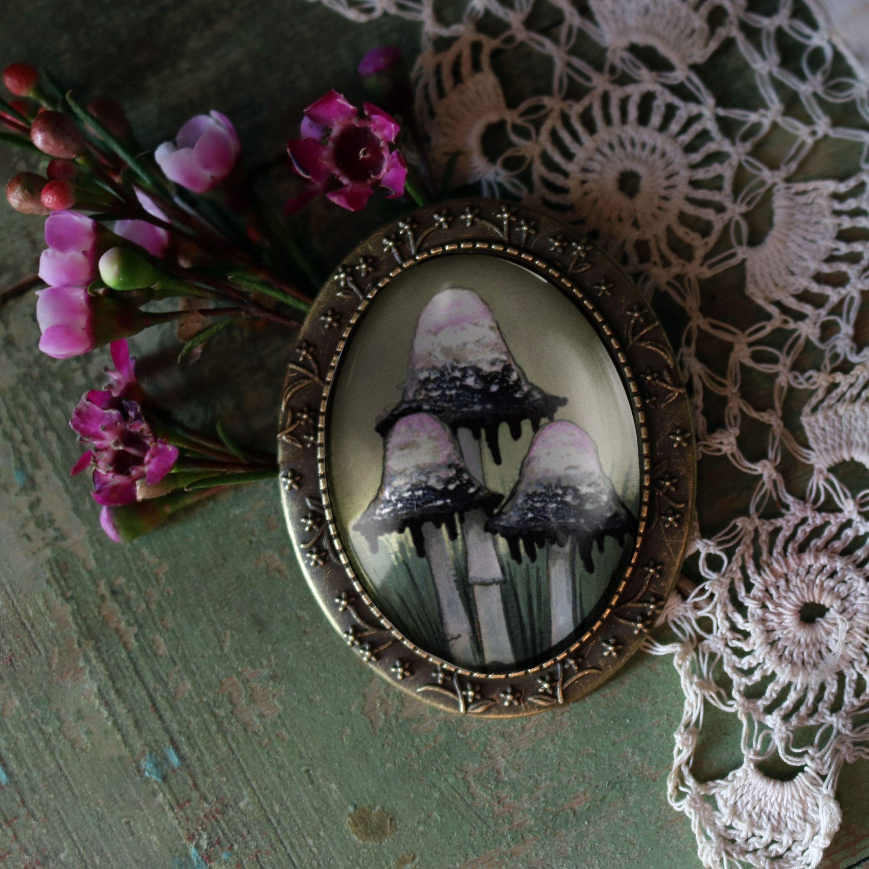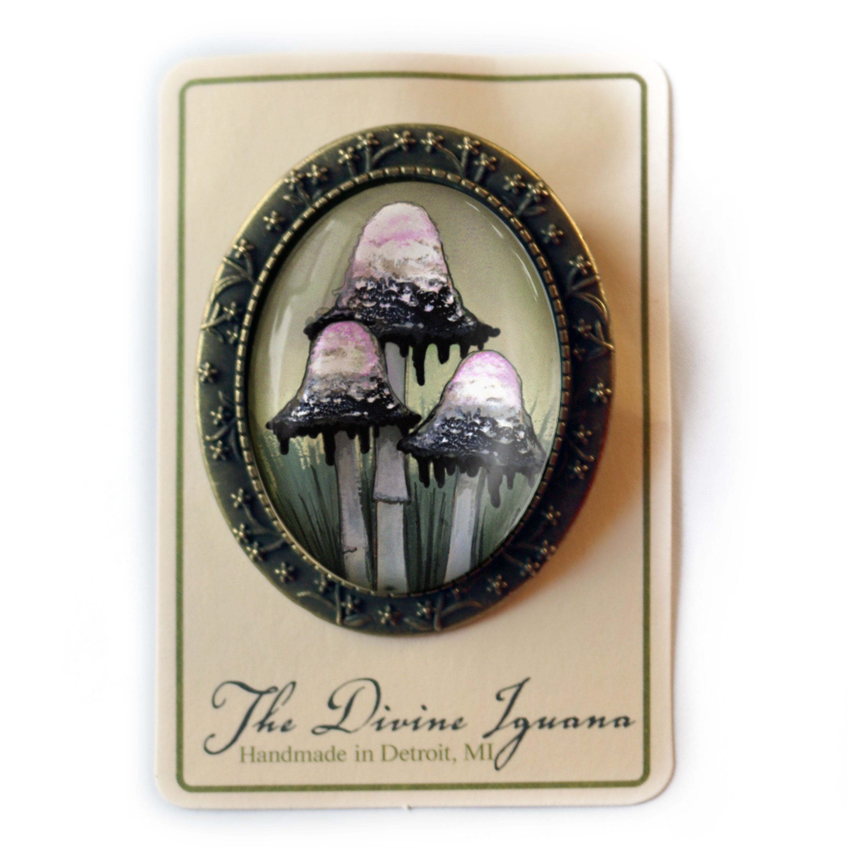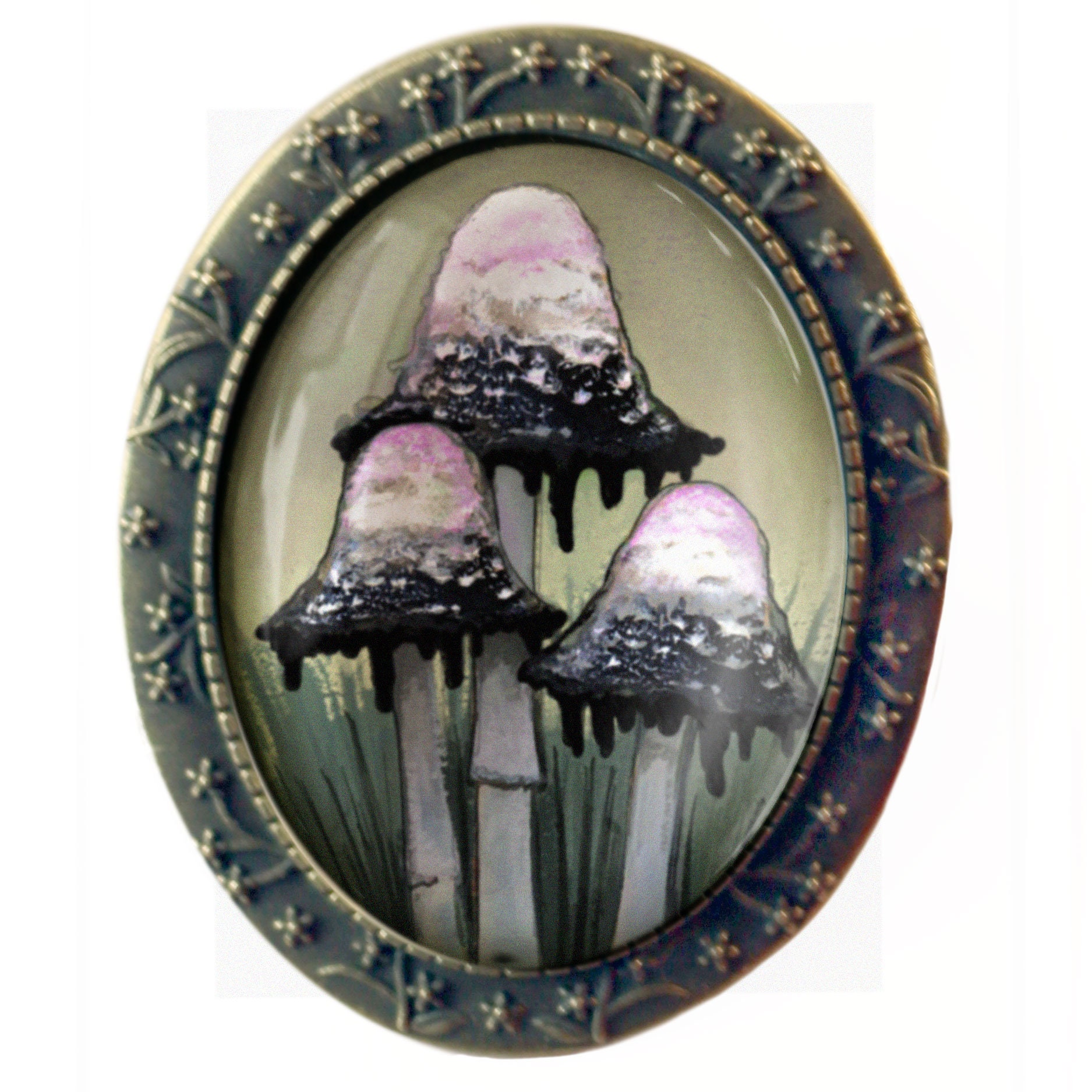 Inky Cap Mushroom brooch with reversed decoupage glass cabochon. Our mushroom brooch has an antiqued bronze finish for a warm, heirloom appearance.