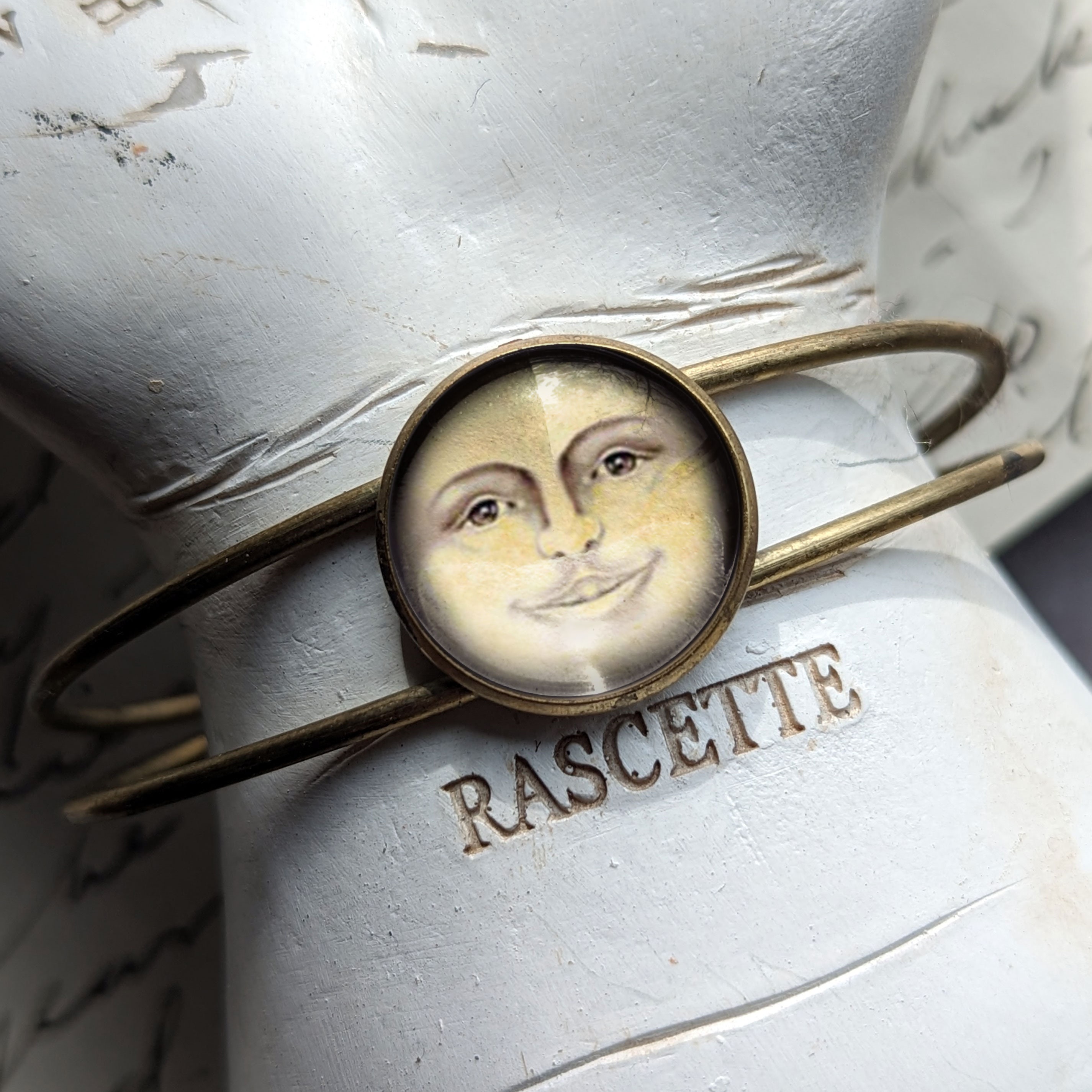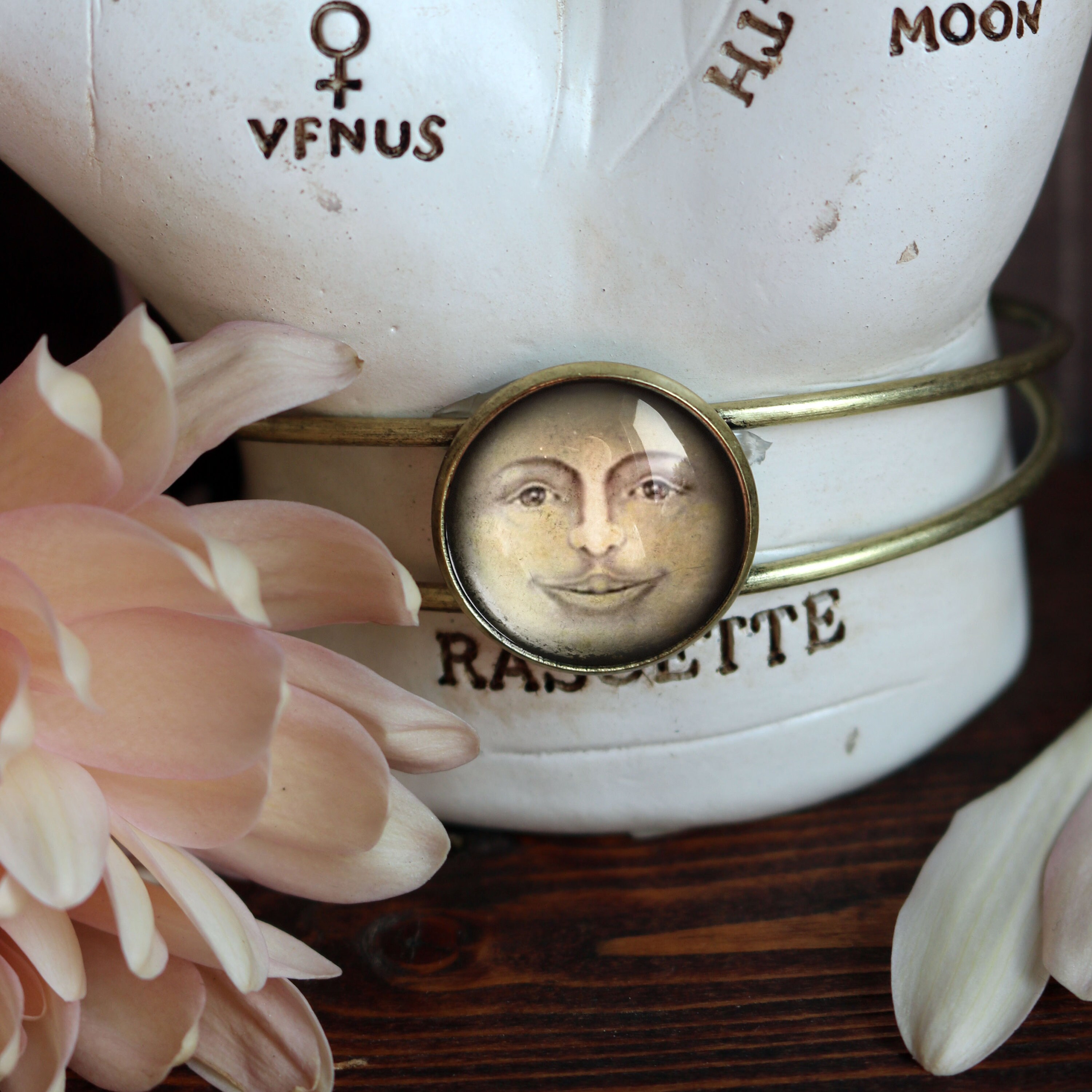 To create your man in the moon bracelet the image was first printed onto archival fine art paper, then cut to size and applied by hand to the back of a glass cabochon. This process makes every piece of Divine Iguana jewelry unique. Expect subtle changes in color and clarity from item to item.