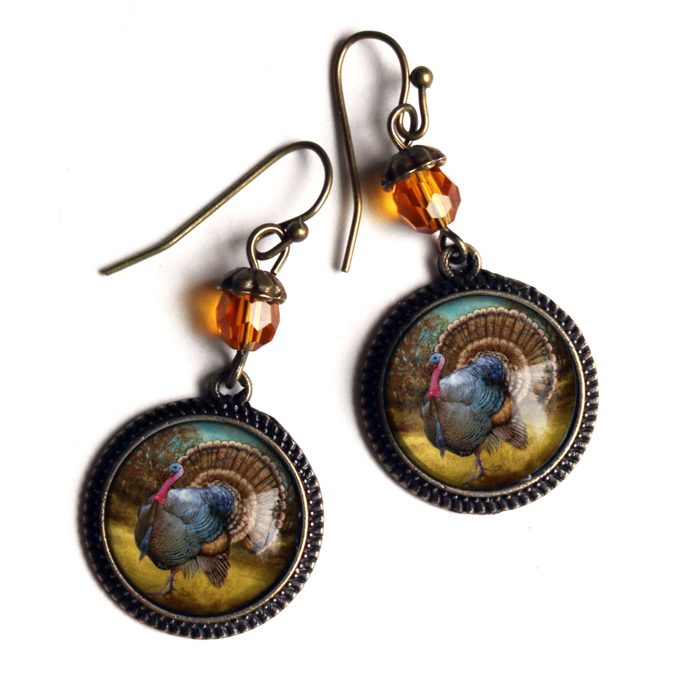 Classic Thanksgiving turkey earrings with amber glass accent beads. Each earring is hand made in a home studio.