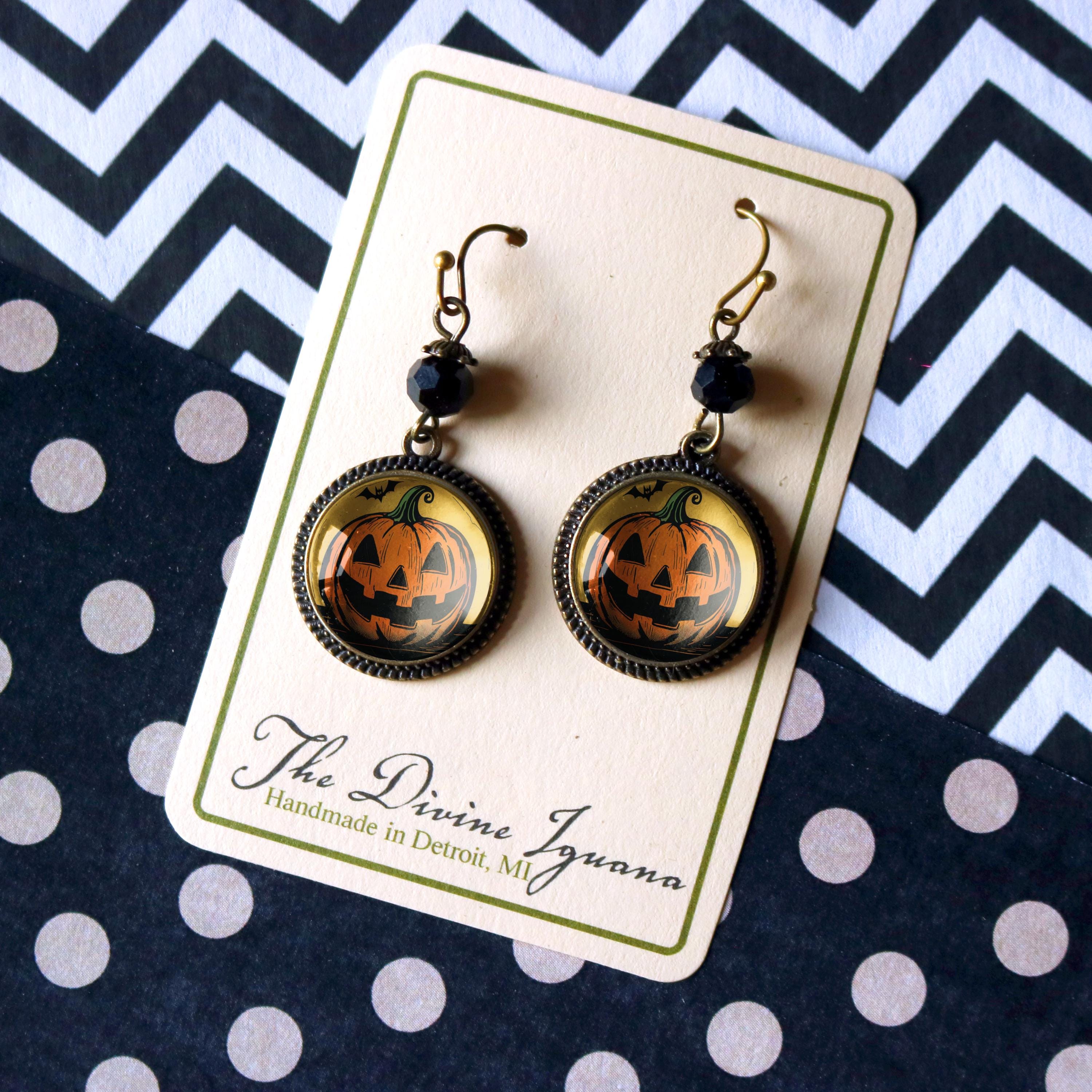 Adorable Jack O Lantern Earrings designed in the spirit of retro mid century Halloween decor. Our Pumpkin with bat earrings are the perfect way to add a touch of whimsy to your fall wardrobe.