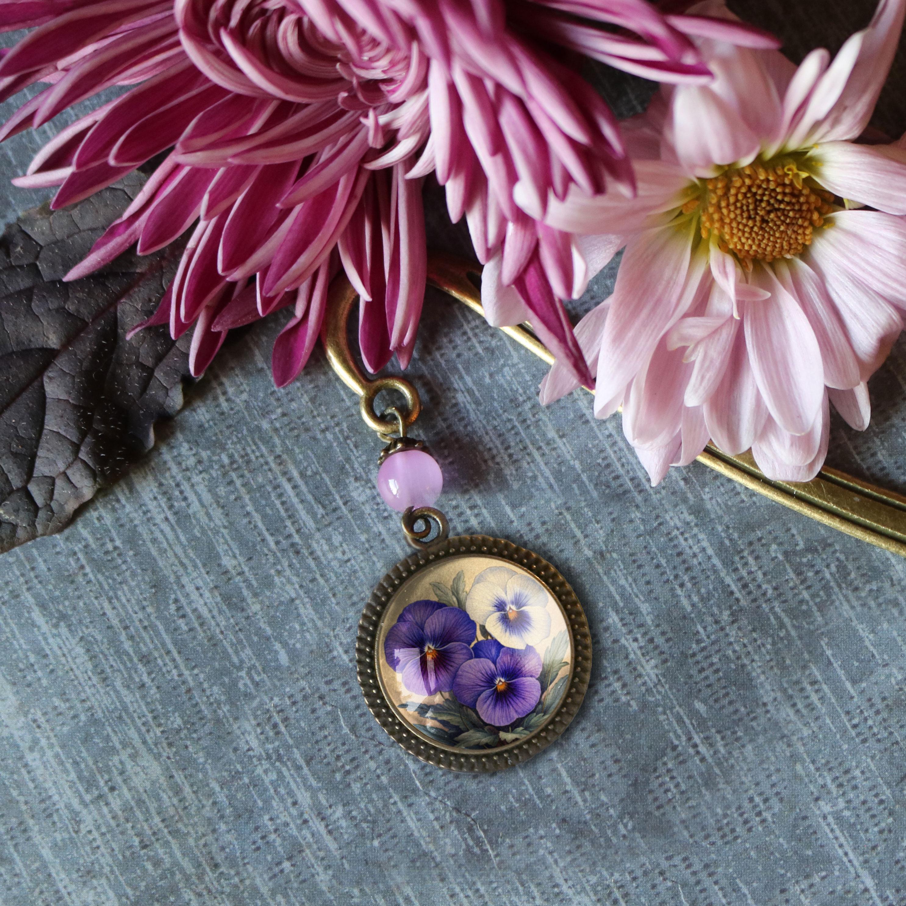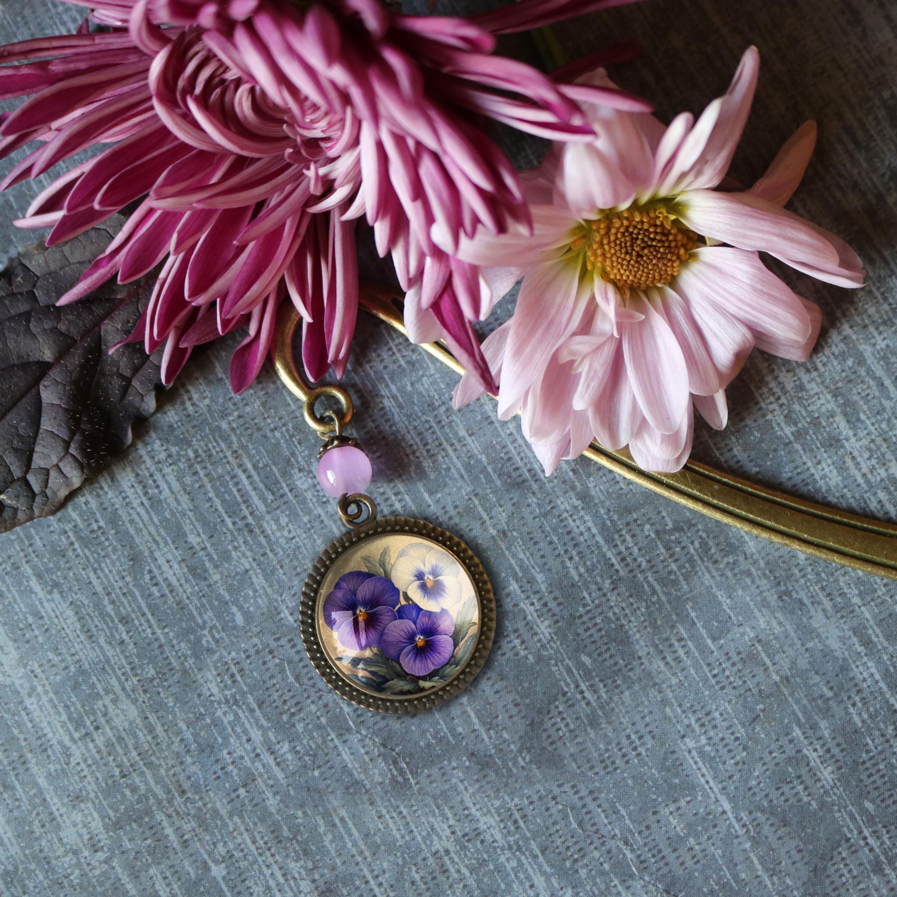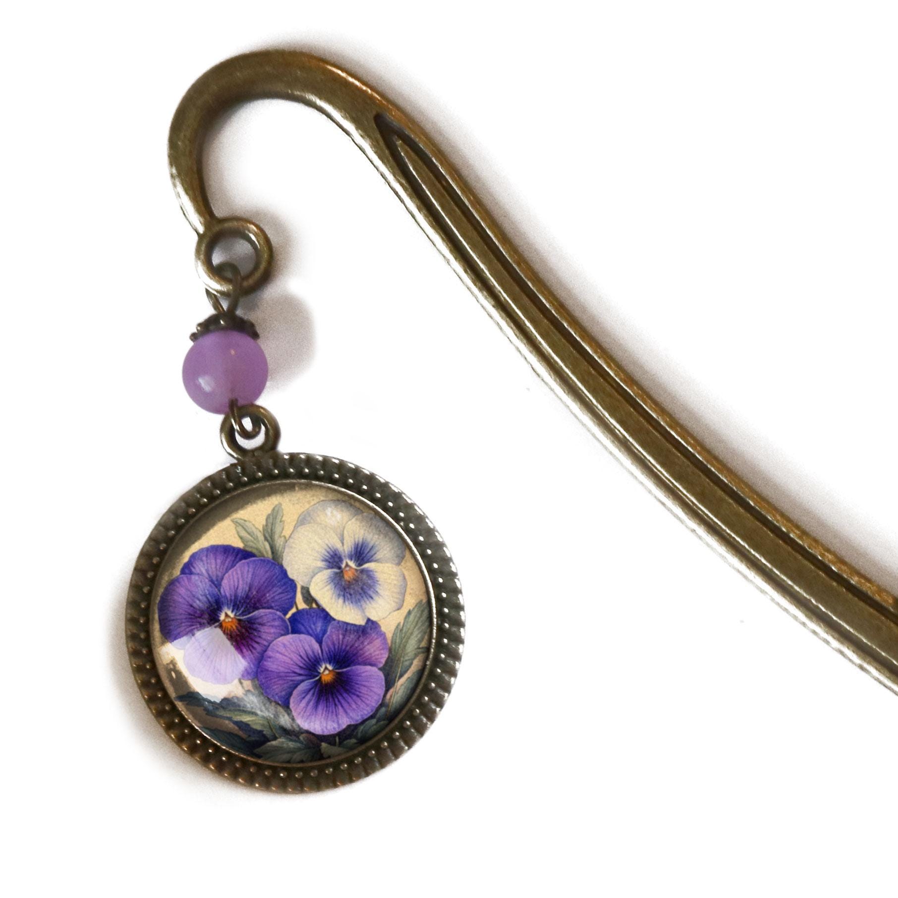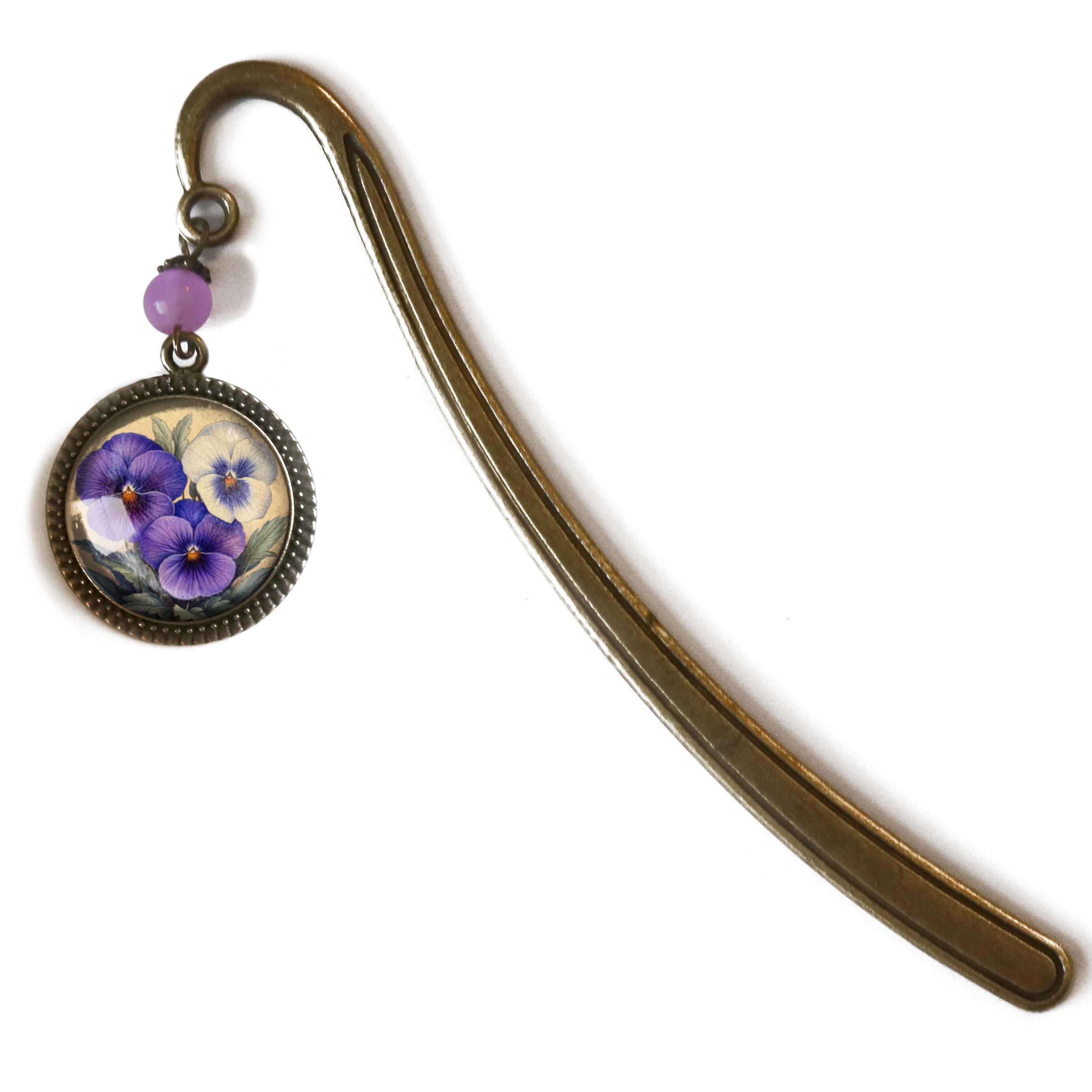 Keep your place with this elegant brass book hook style bookmark. The slender brass hook slides down between the pages while the ornate brass ornament dangles along the spine. The Pansy book hook comes packaged for easy gift giving. Hook is about 5" long Ornament is about 1.25" in diameter Cabochon is 20mm.----Bead style and color may vary slightly---