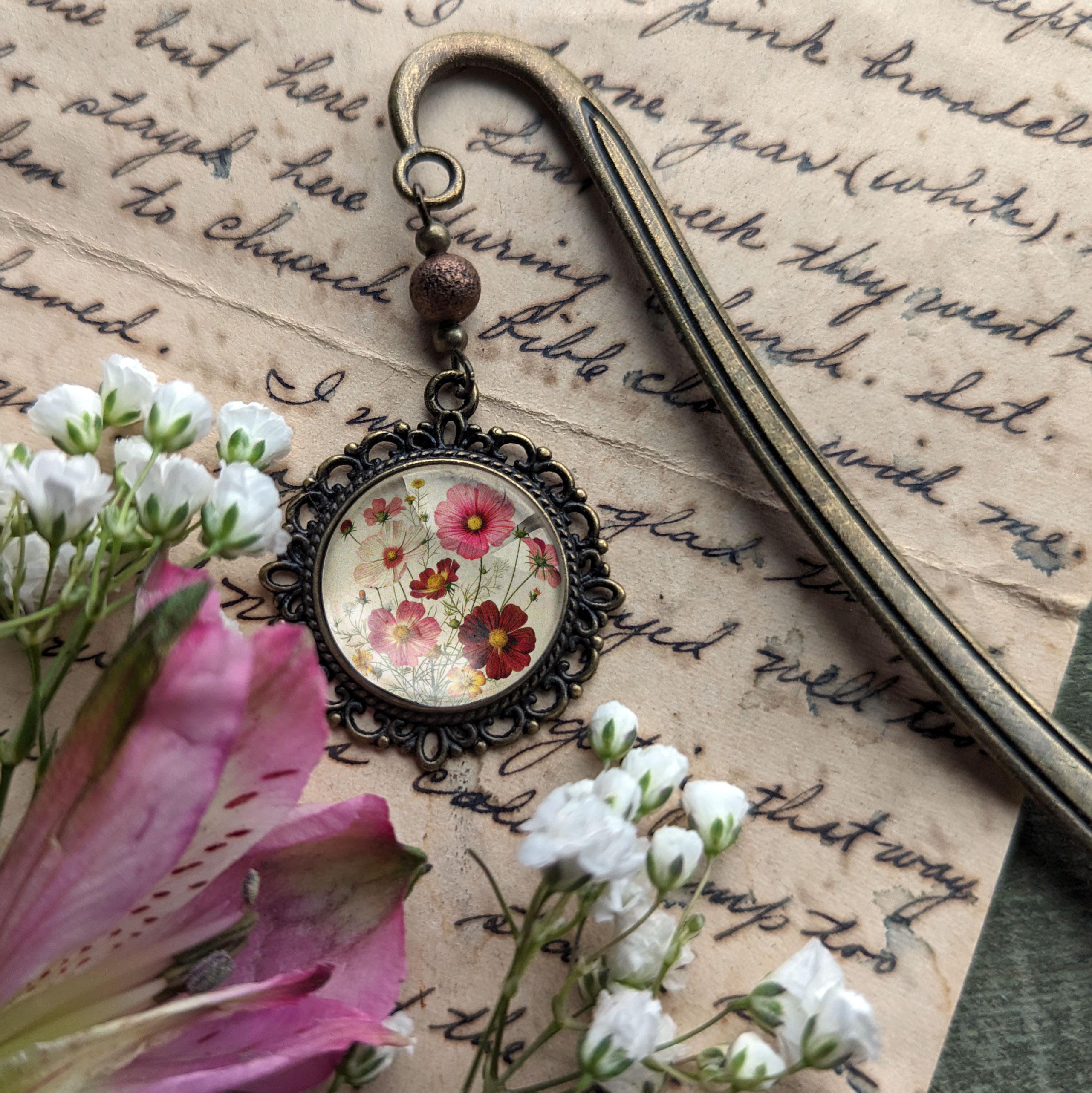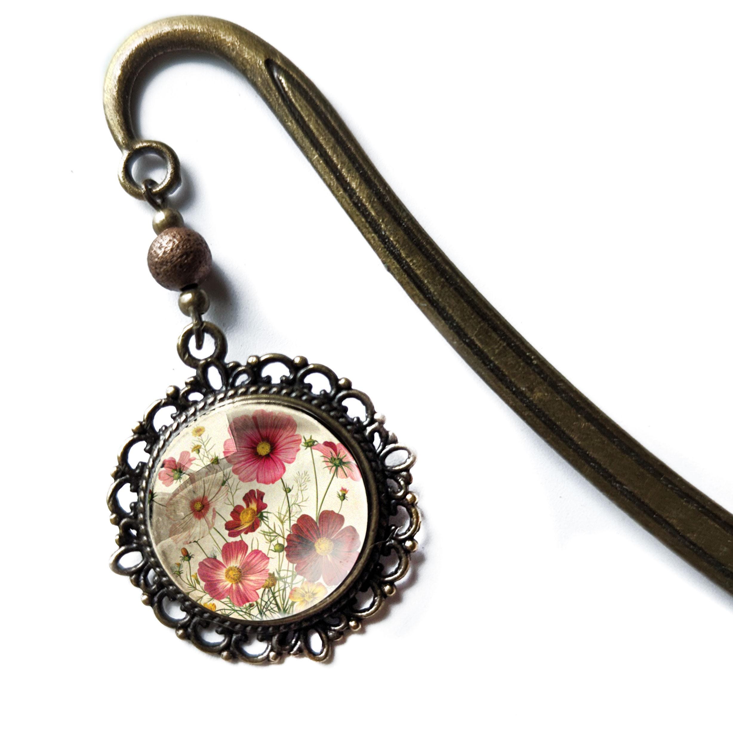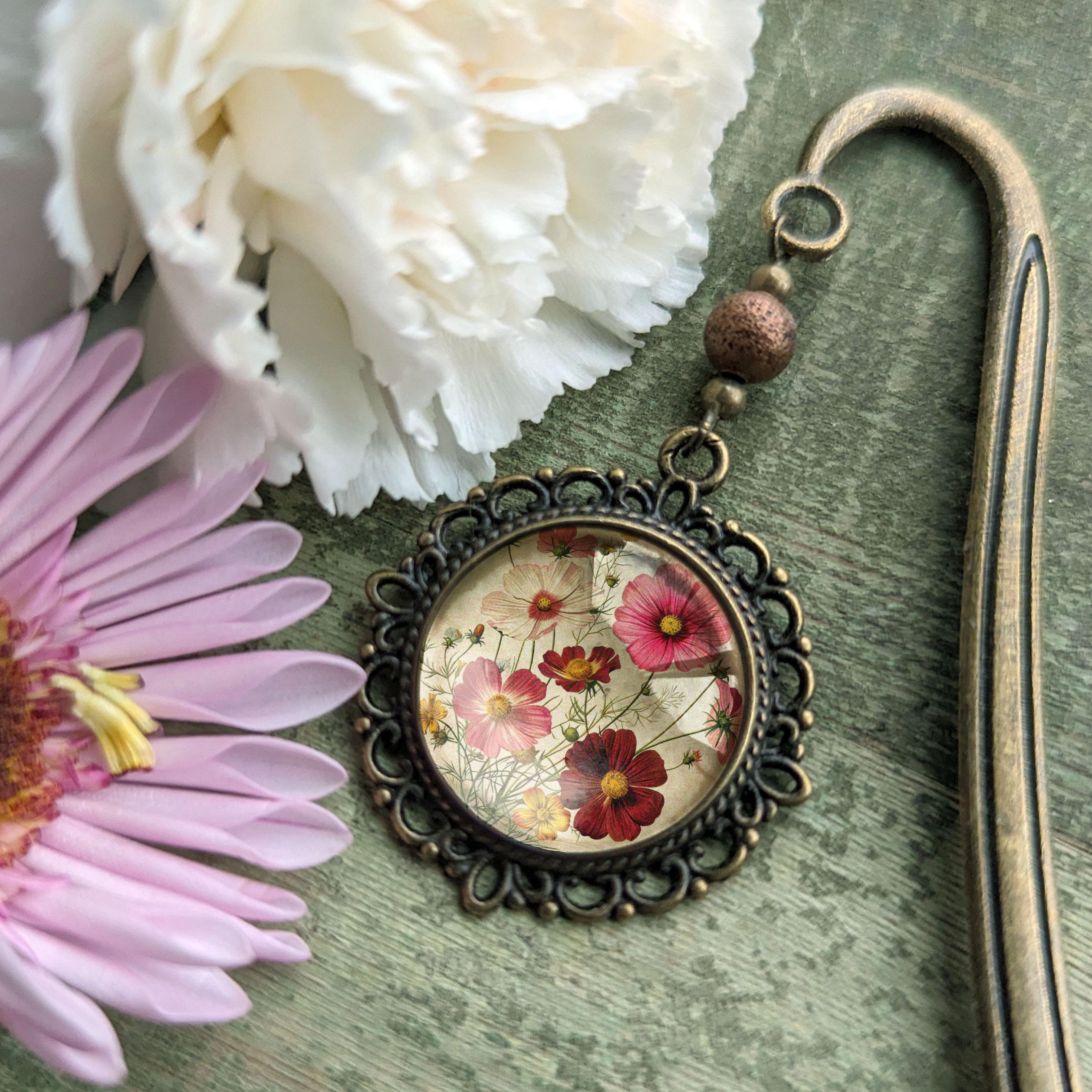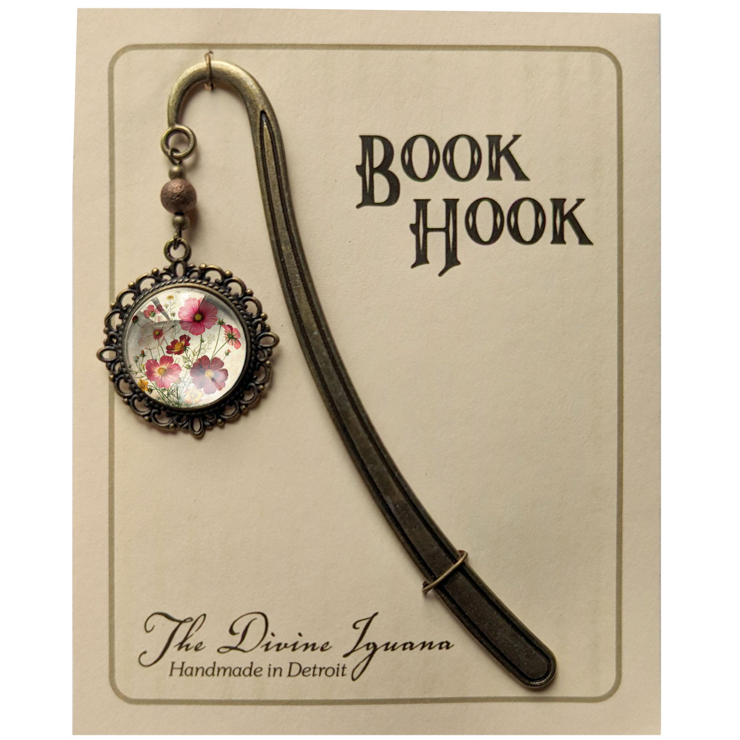 Softly feminine Cosmo flowers adorn this sturdy bronze bookmark.