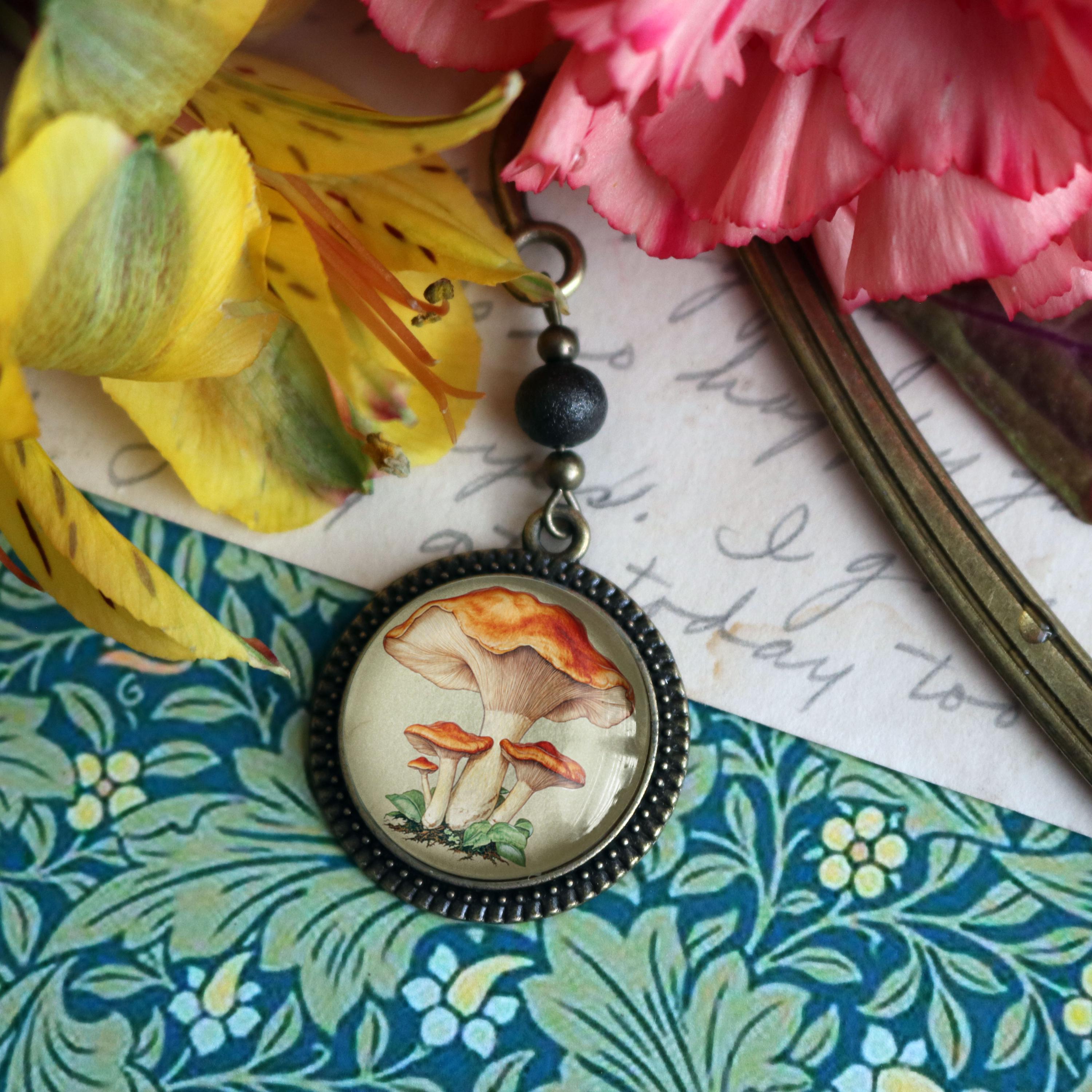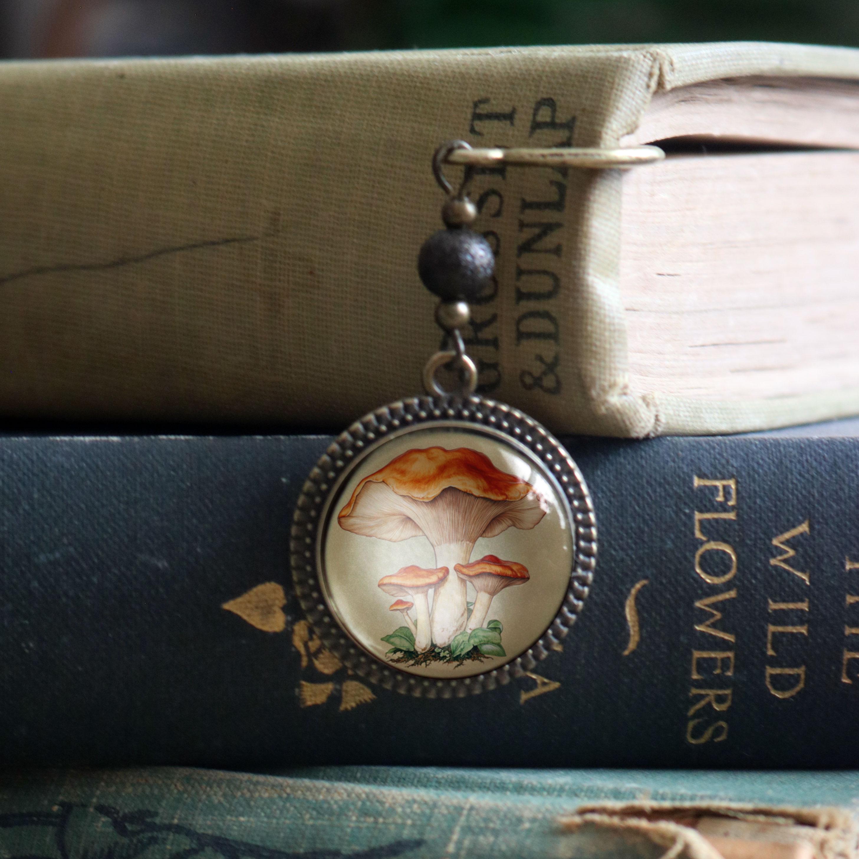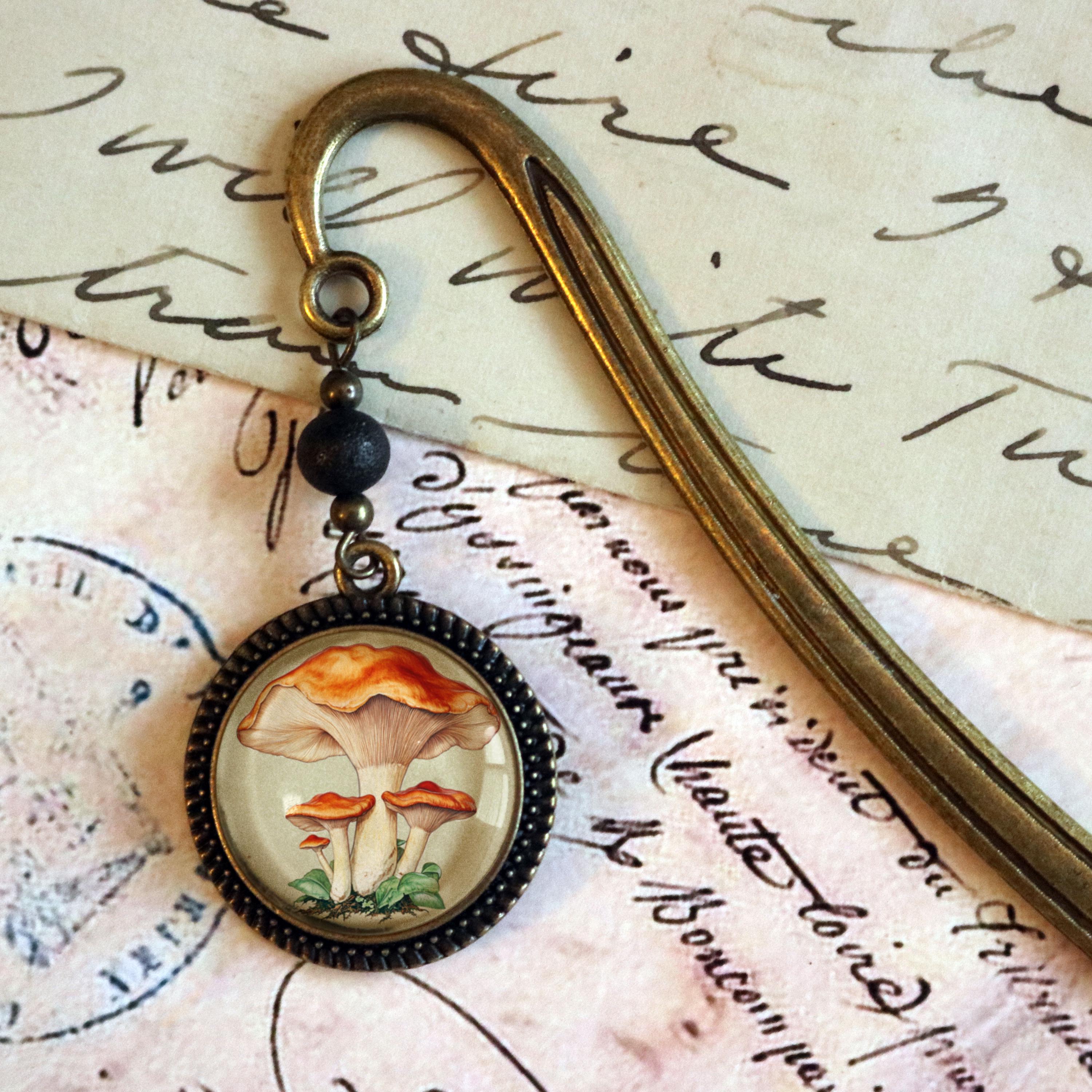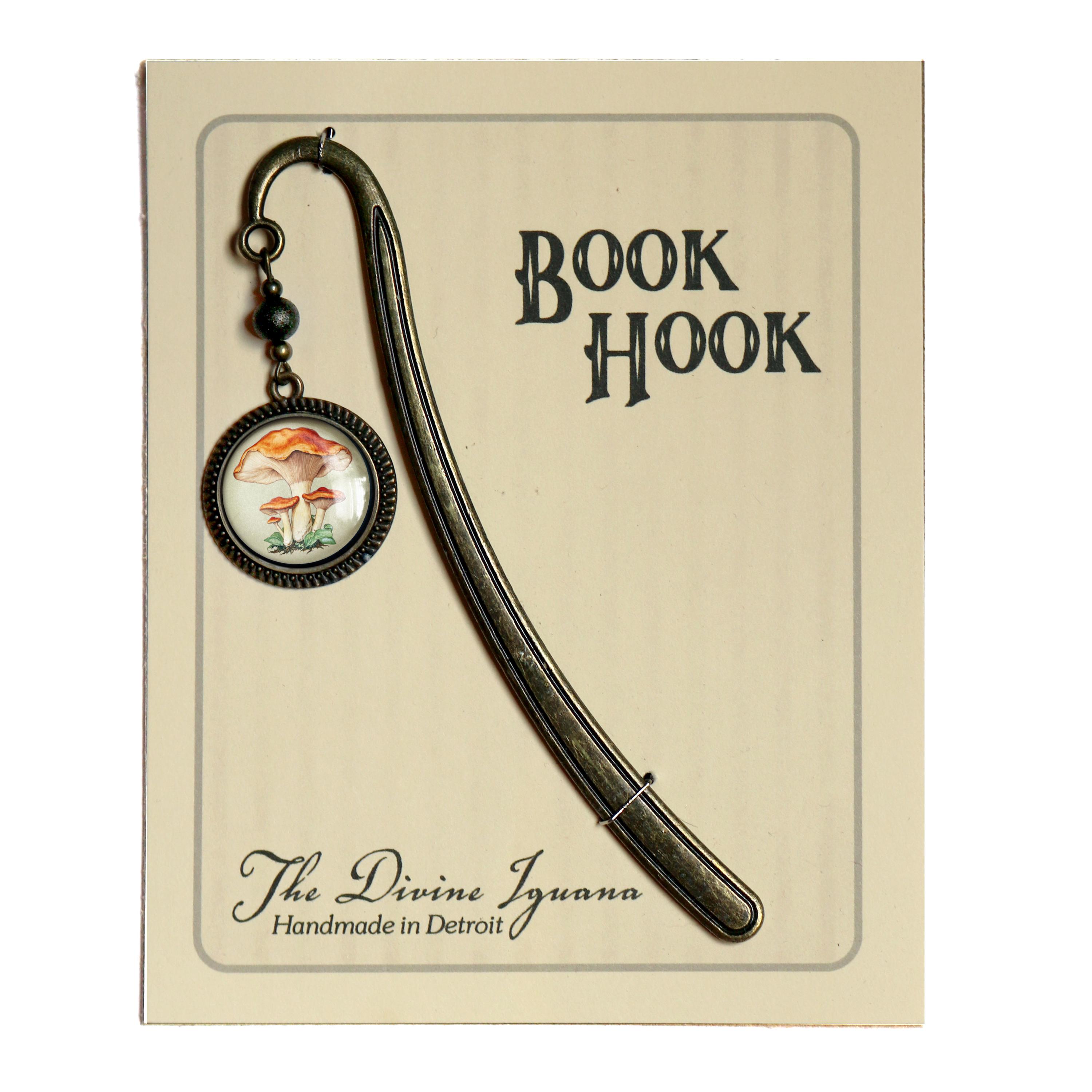 Keep your place with this elegant brass book hook style bookmark. The slender brass hook slides down between the pages while the ornate brass ornament dangles along the spine. The Chantarelle Mushroom book hook comes packaged for easy gift giving. Hook is about 5" long Ornament is about 1.25" in diameter Cabochon is 20mm.----Bead style and color may vary slightly---