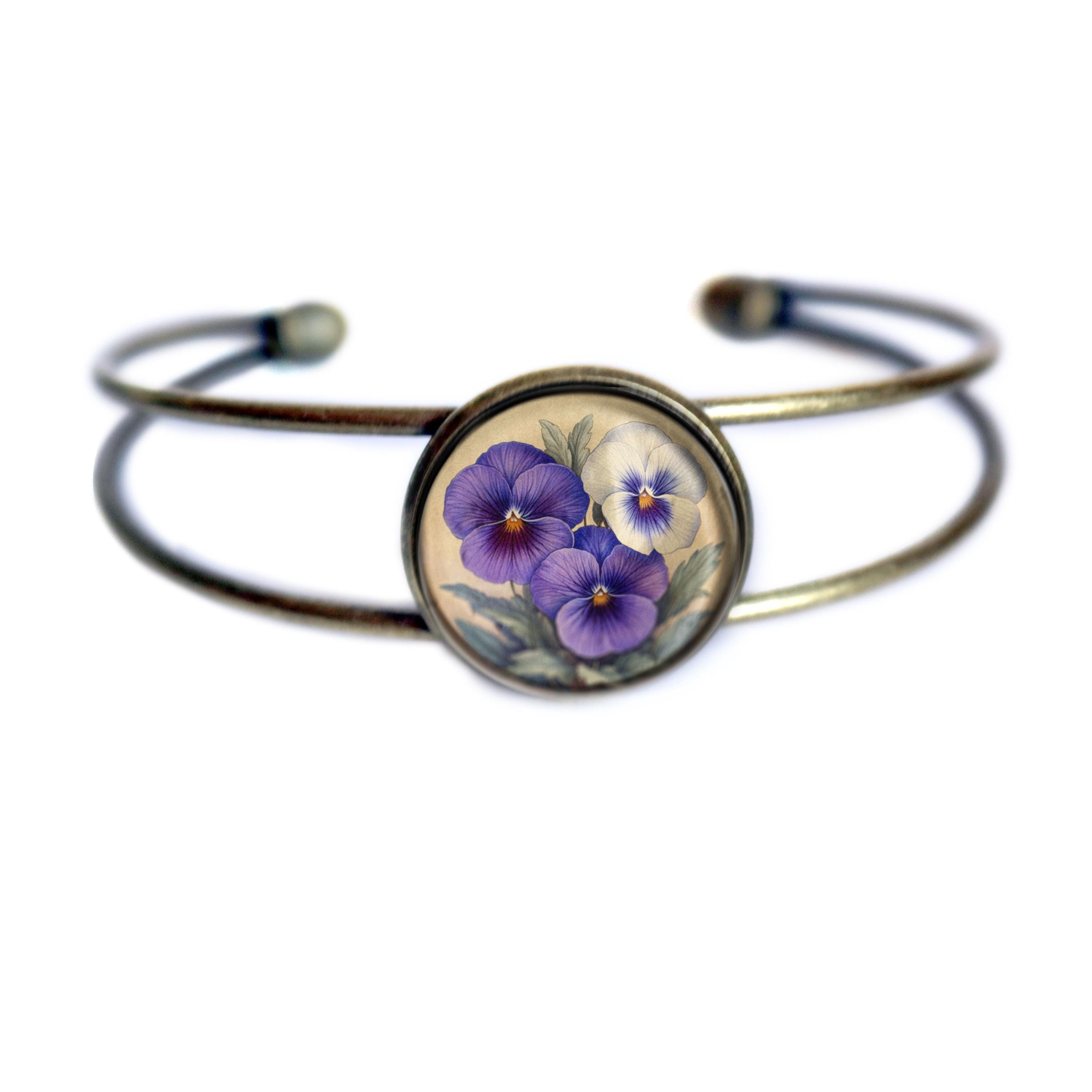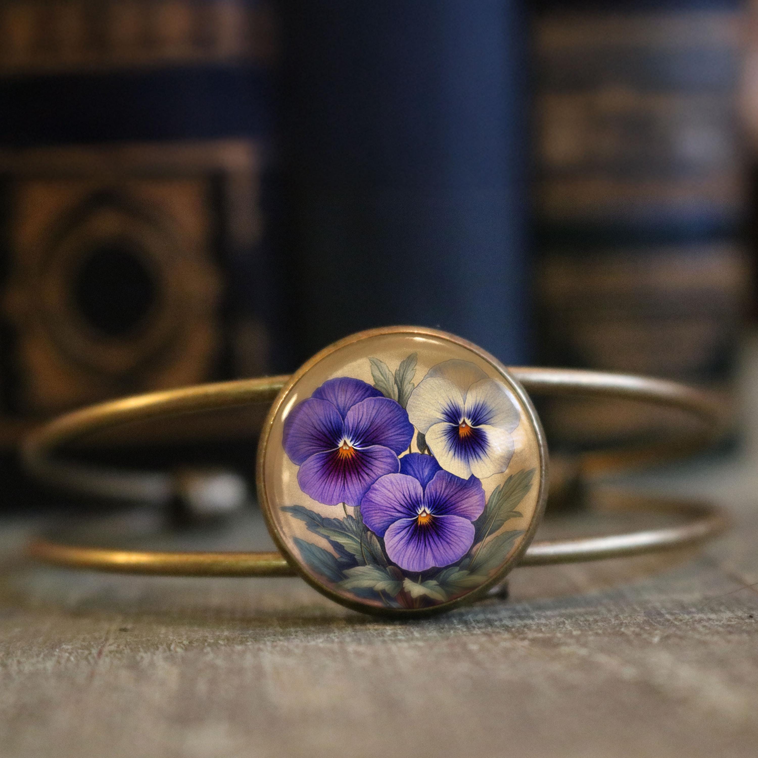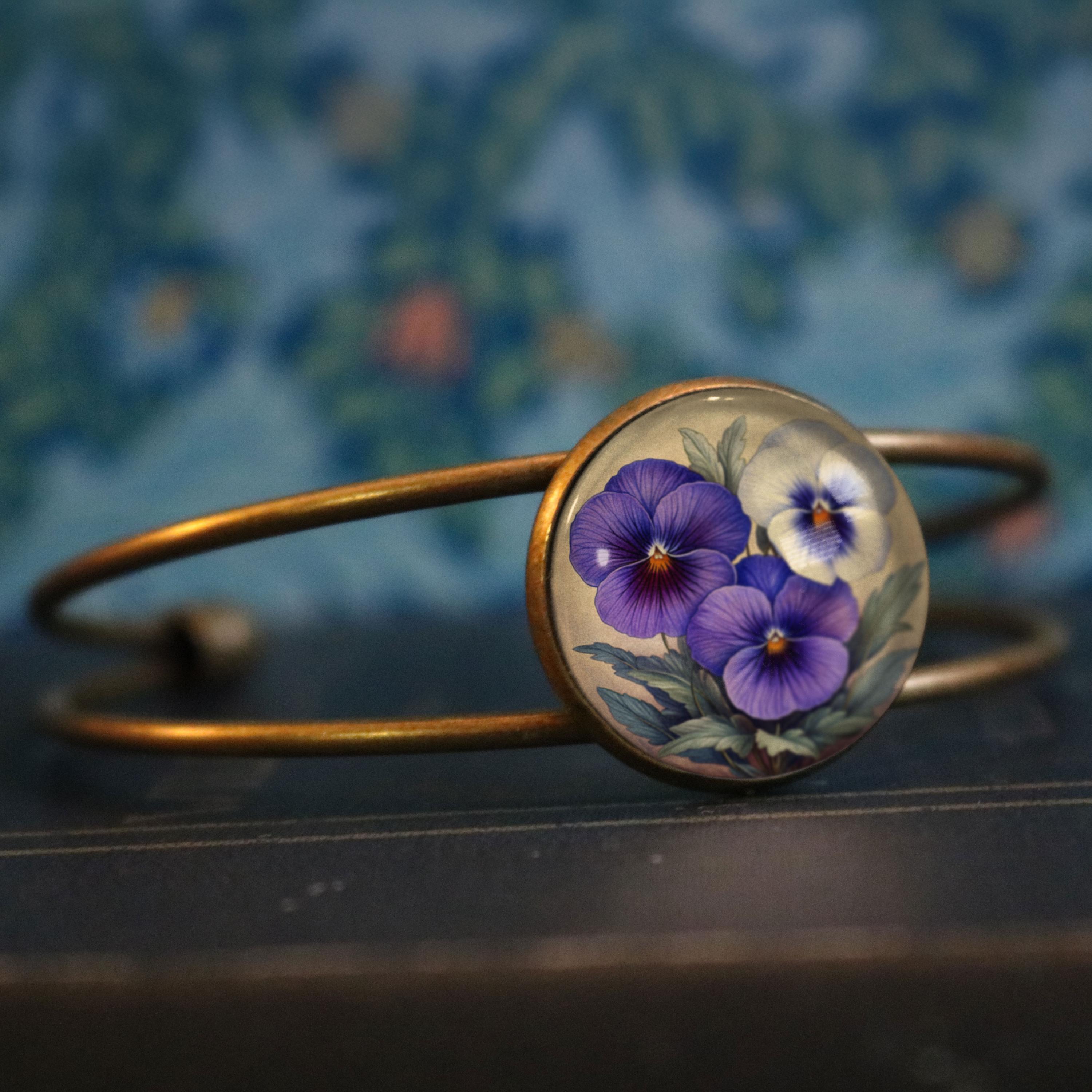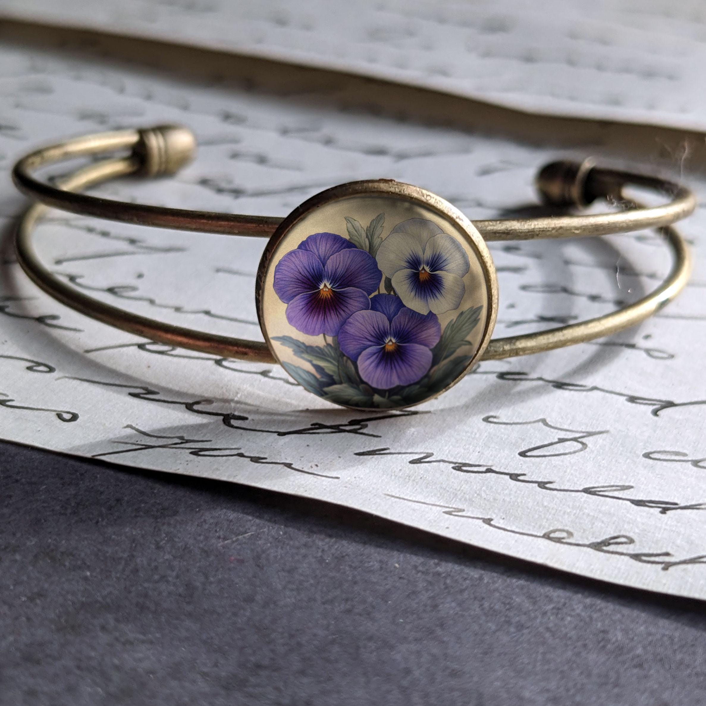 To create your pansy bracelet the image was first printed onto archival fine art paper, then cut to size and applied by hand to the back of a glass cabochon. This process makes every piece of Divine Iguana jewelry unique. Expect subtle changes in color and clarity from item to item.