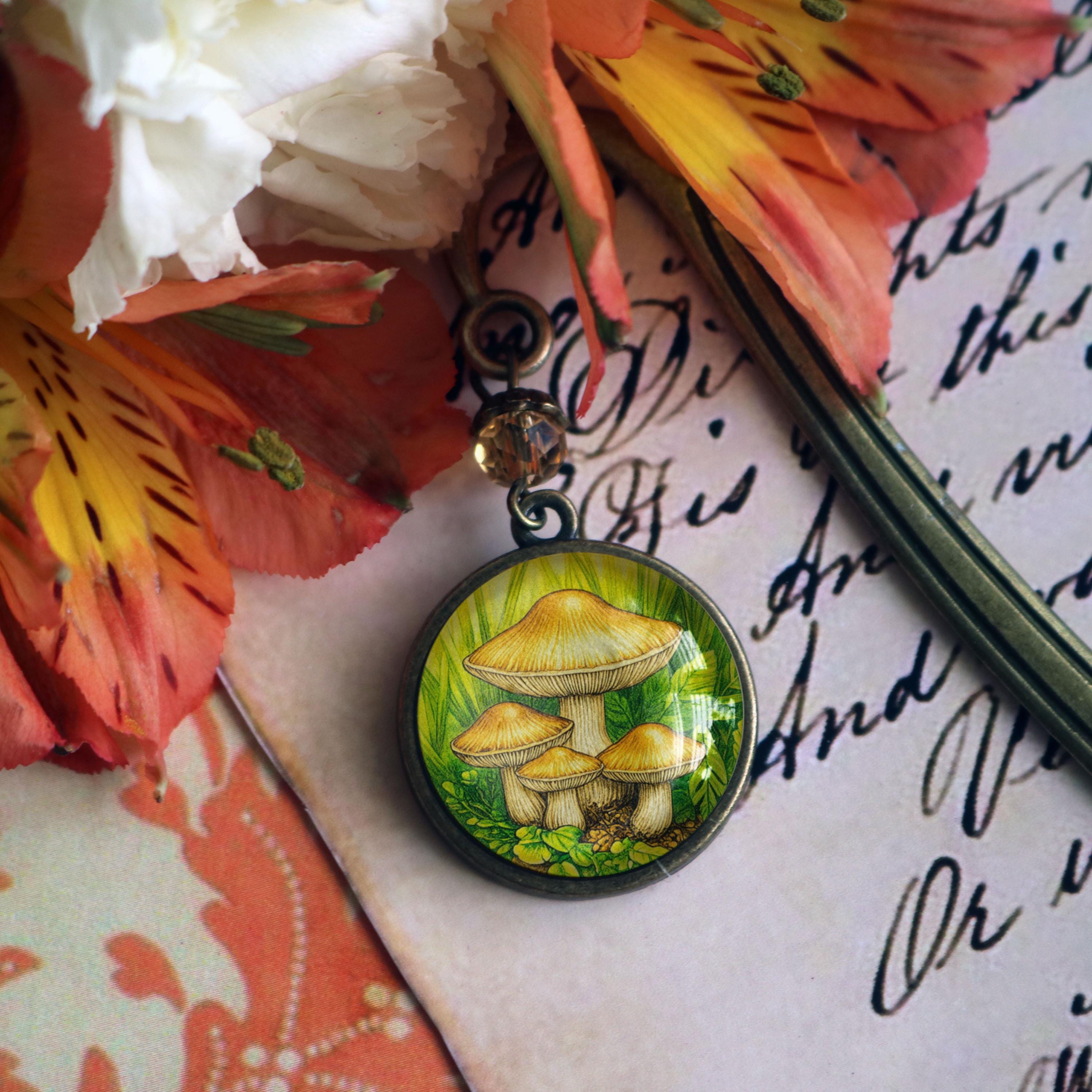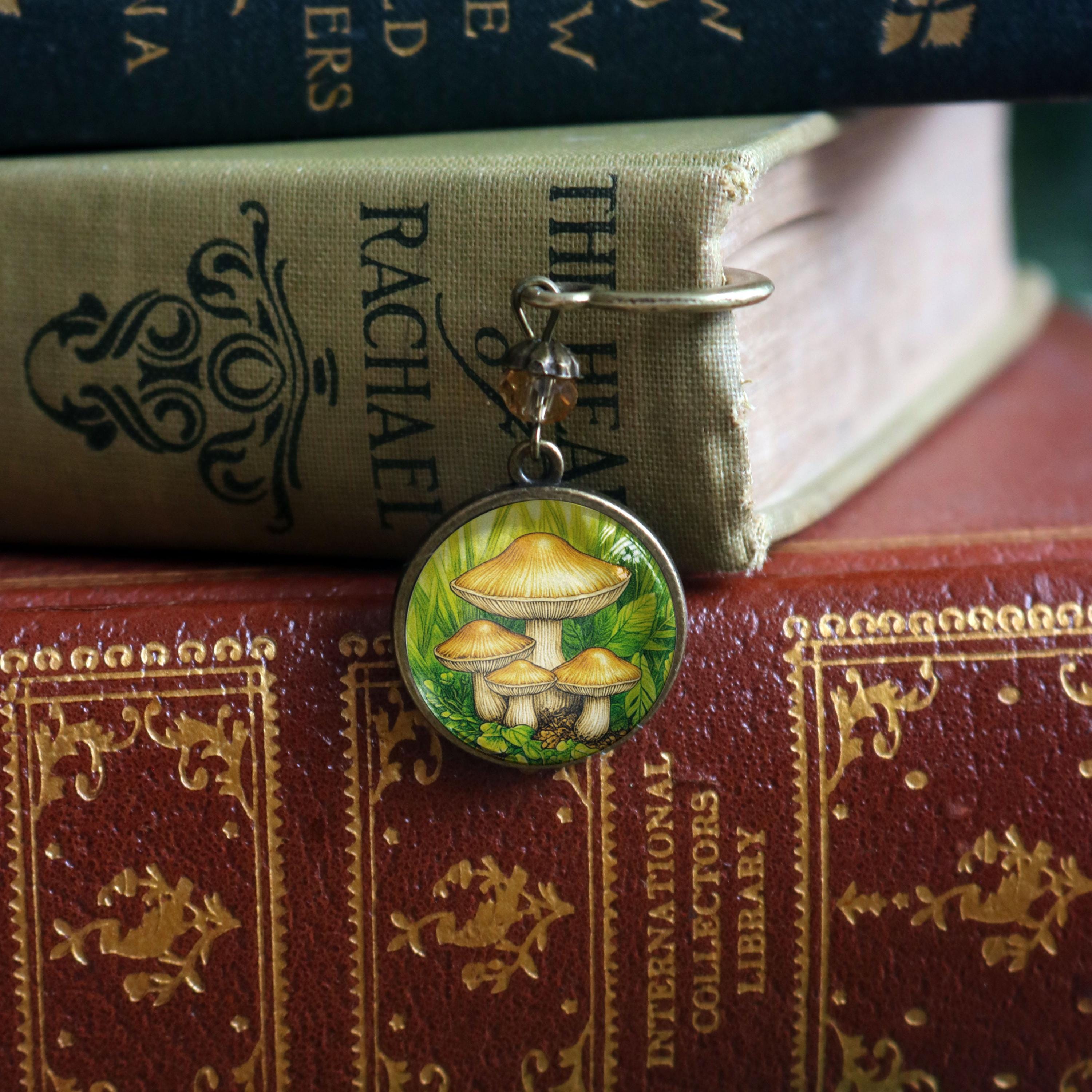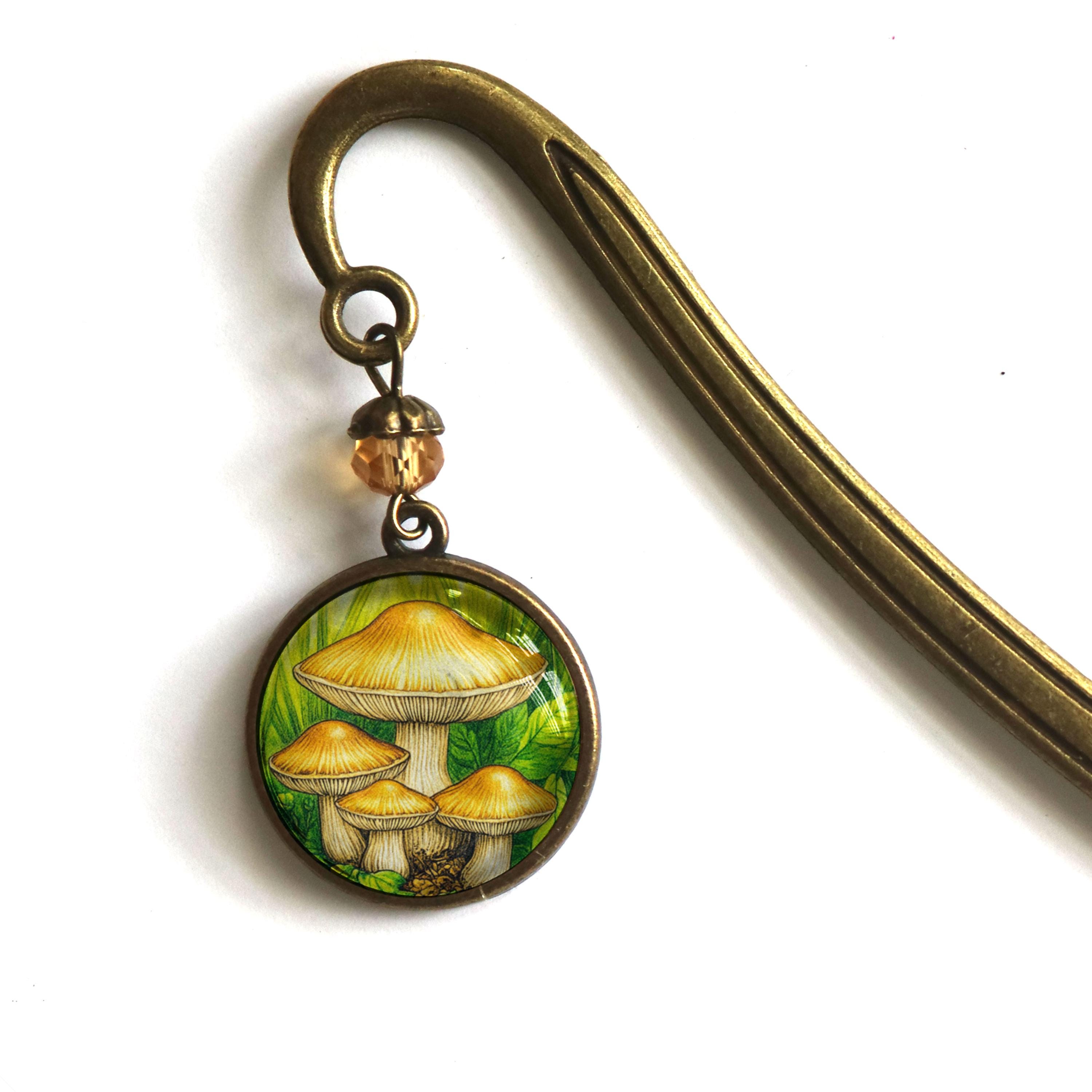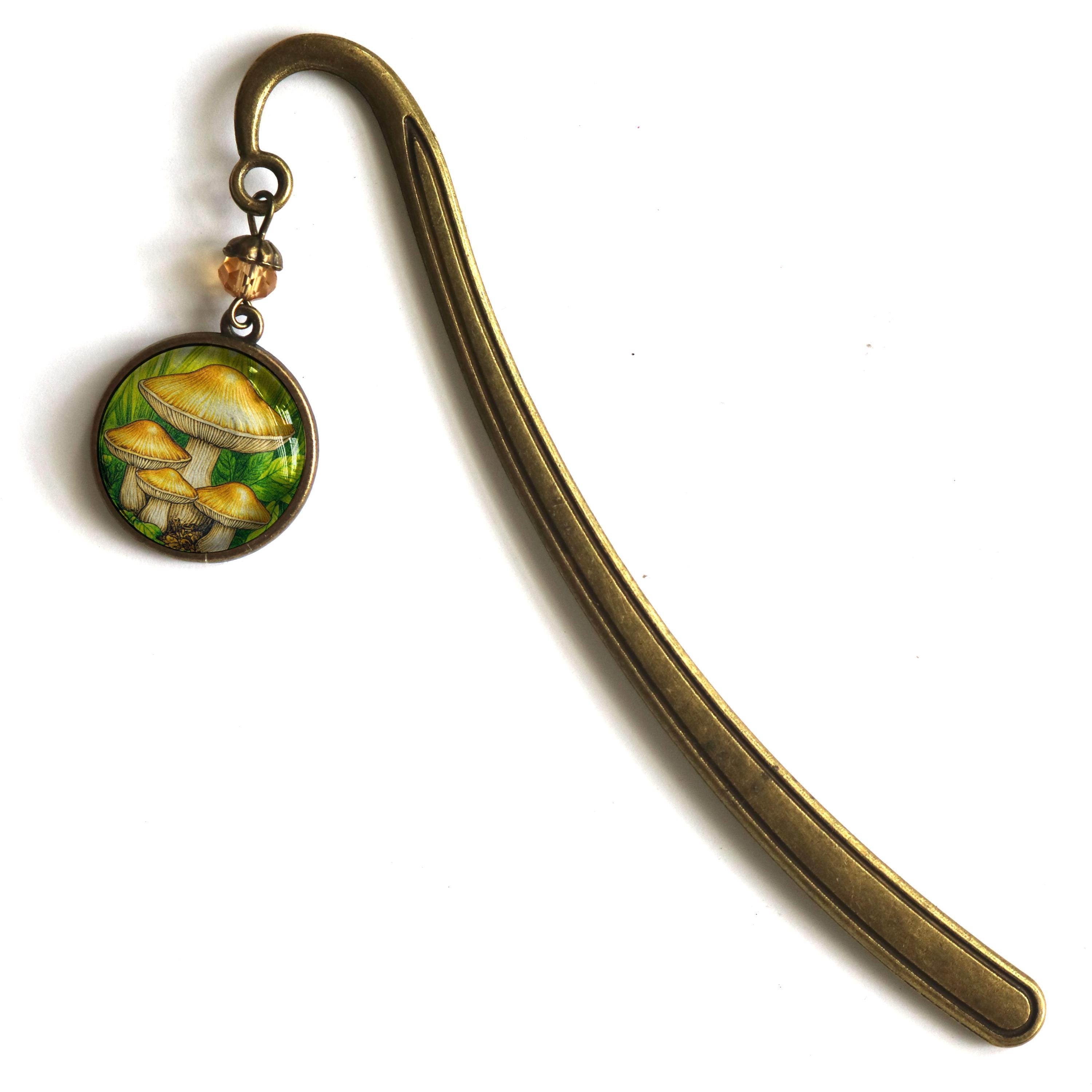 Keep your place with this elegant brass book hook style bookmark. The slender brass hook slides down between the pages while the ornate brass ornament dangles along the spine. The Honey Mushroom book hook comes packaged for easy gift giving. Hook is about 5" long Ornament is about 1.25" in diameter Cabochon is 20mm.----Bead style and color may vary slightly---