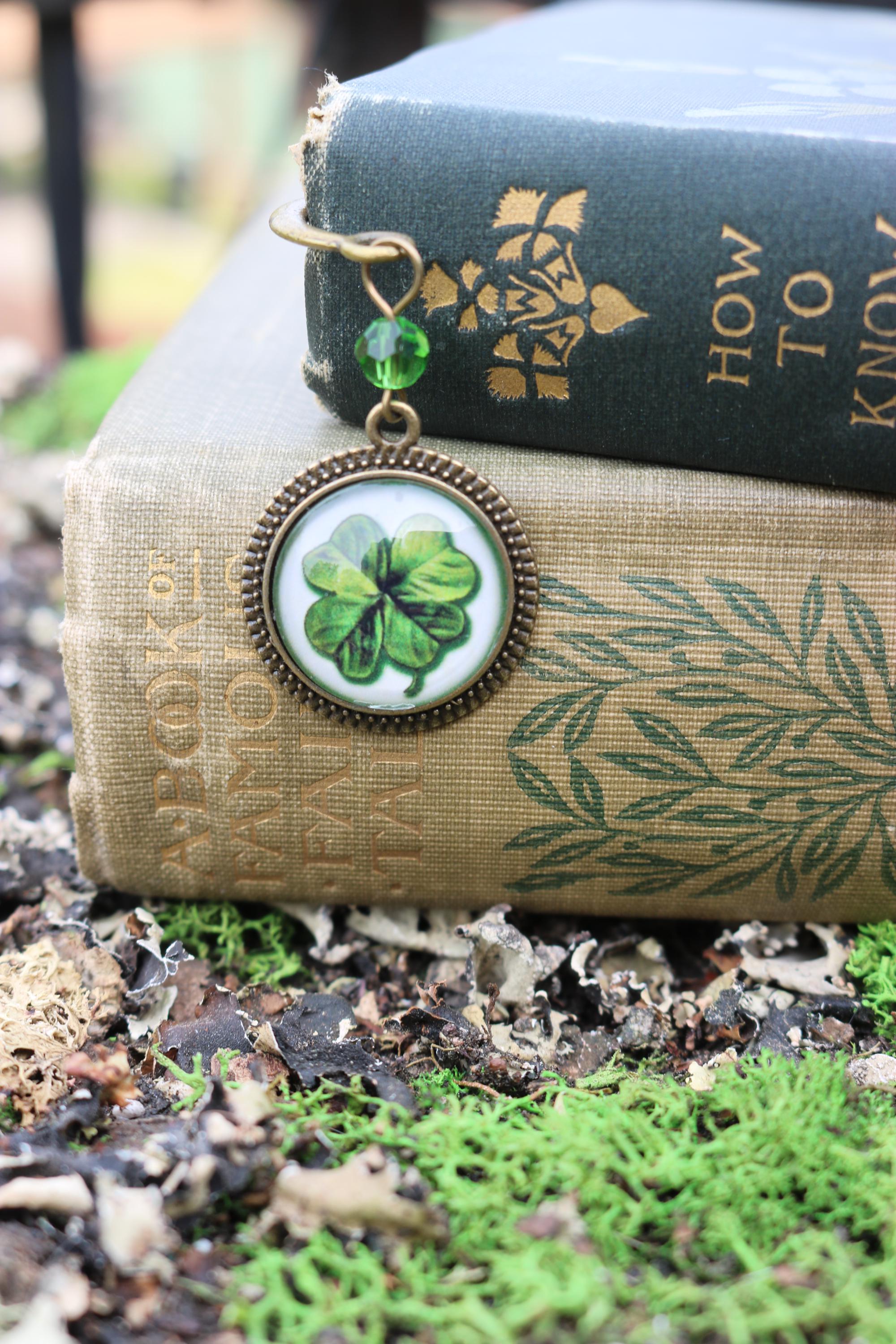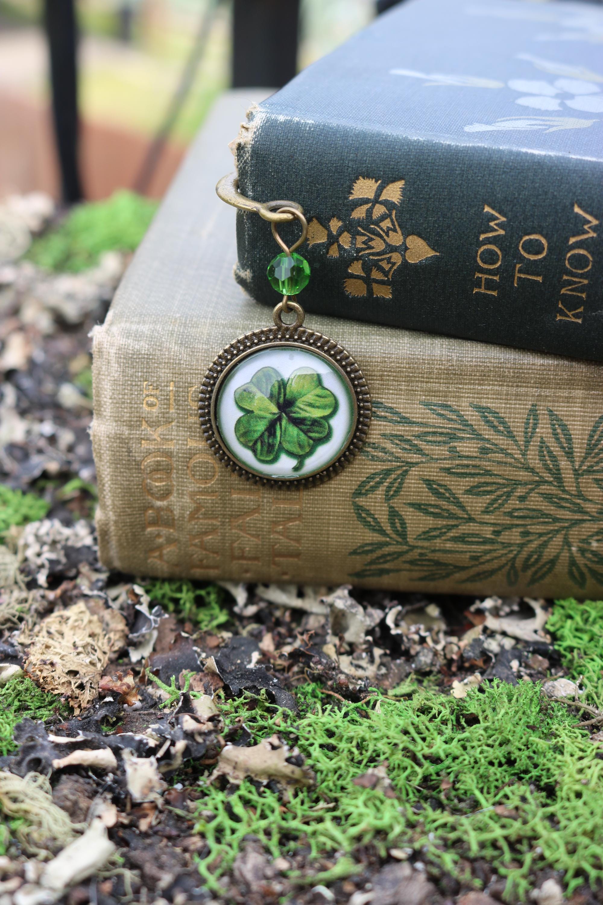 Keep your place with this elegant brass book hook style bookmark. The slender brass hook clover book hook comes packaged for easy gift giving. Hook is about 5" long Ornament is about 1.25" in diameter Cabochon is 20mm.----Bead style and color may vary slightly---