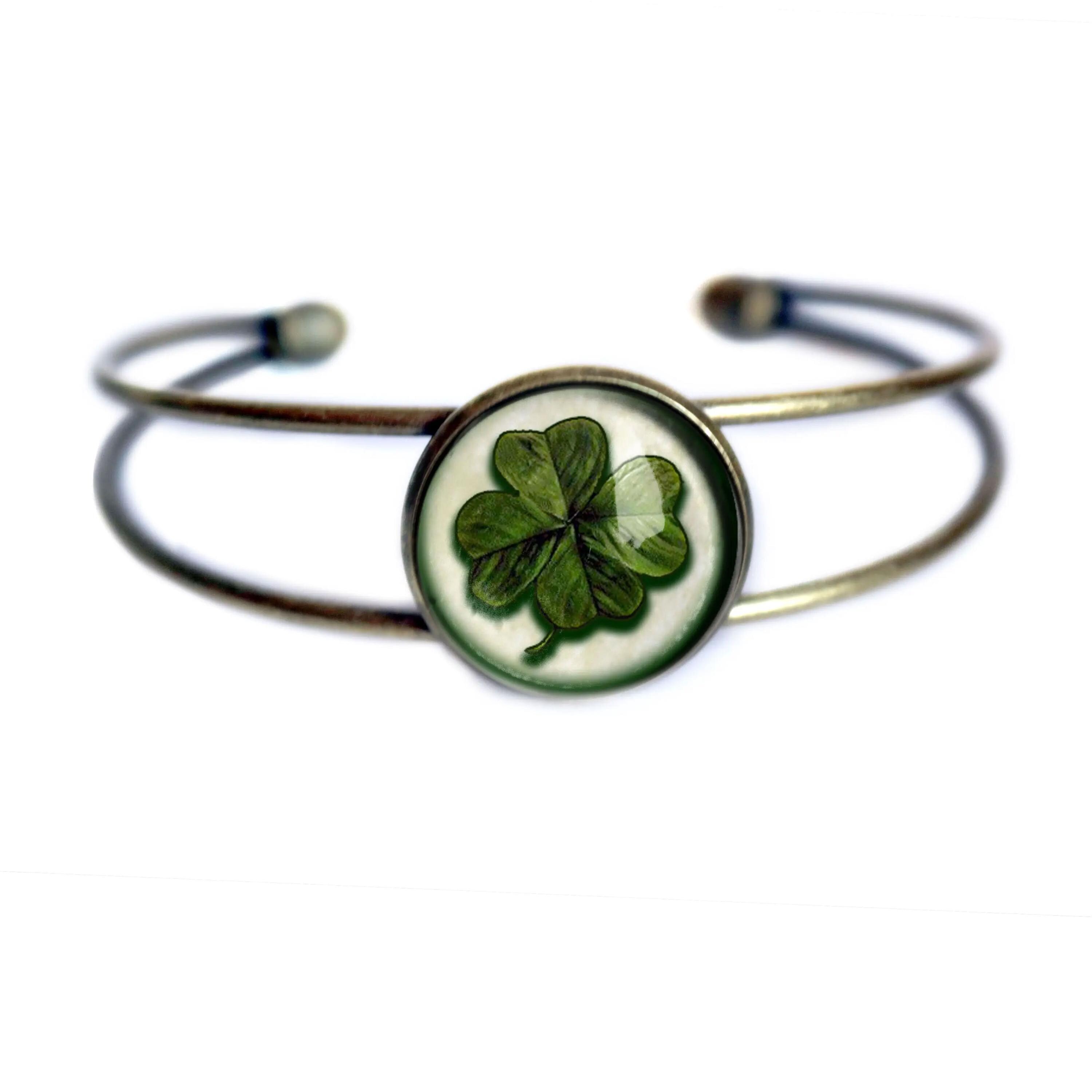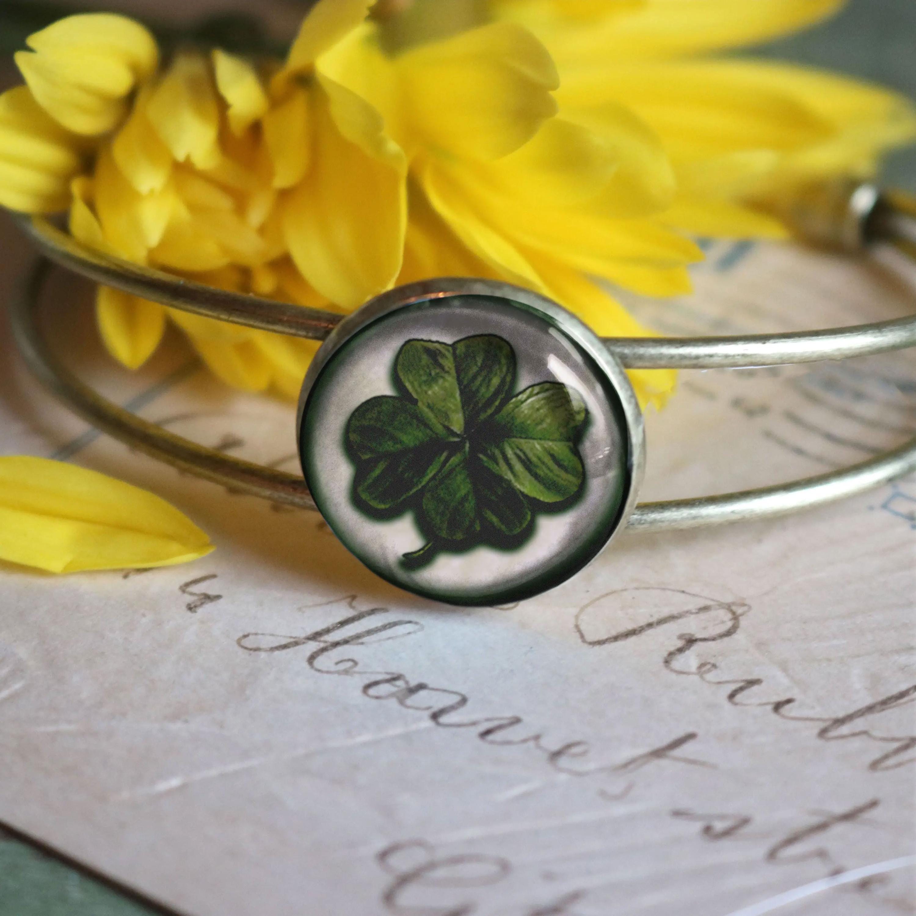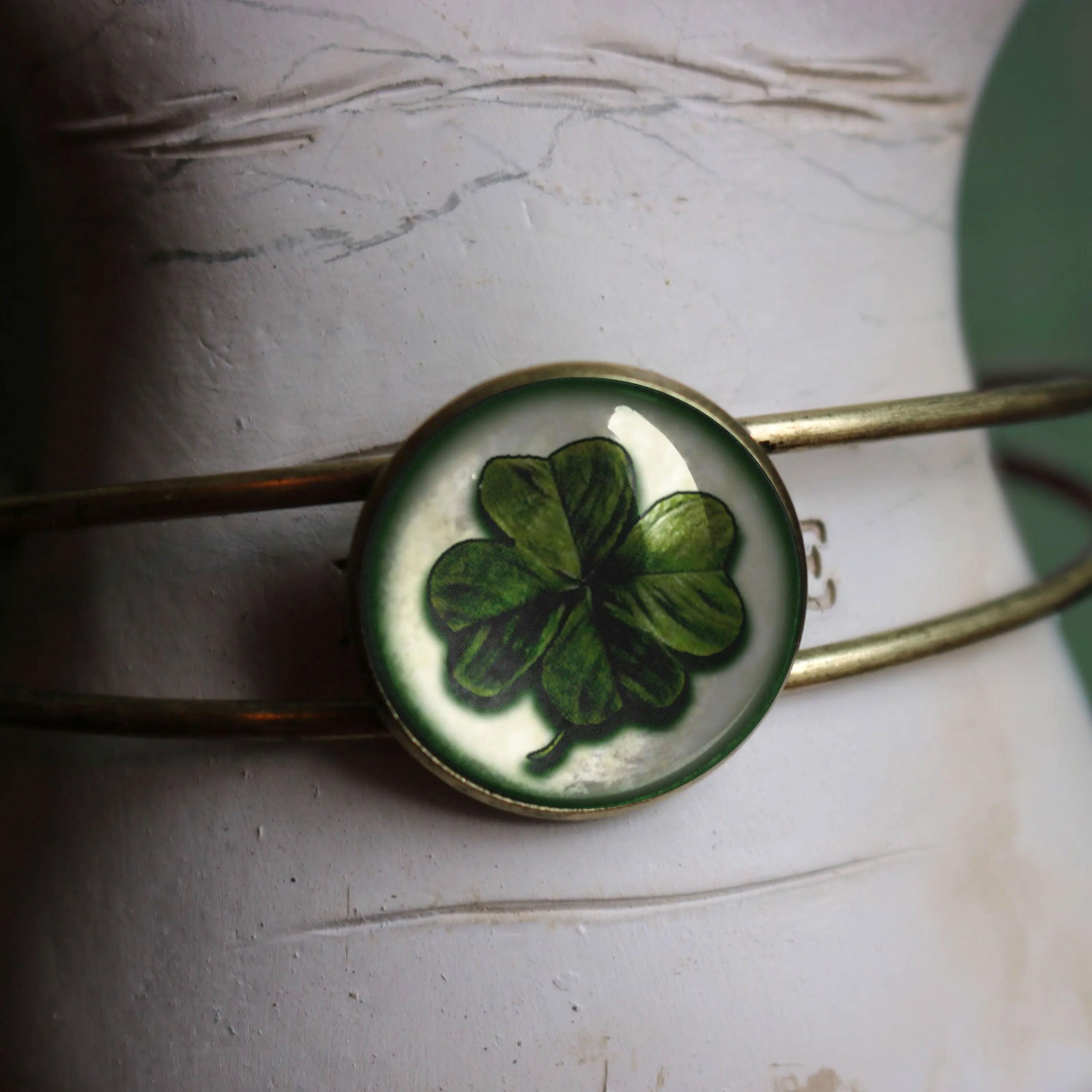 Four Leaf Clover Brass and Glass Cabochon Wire Cuff Cottagecore Bracelet