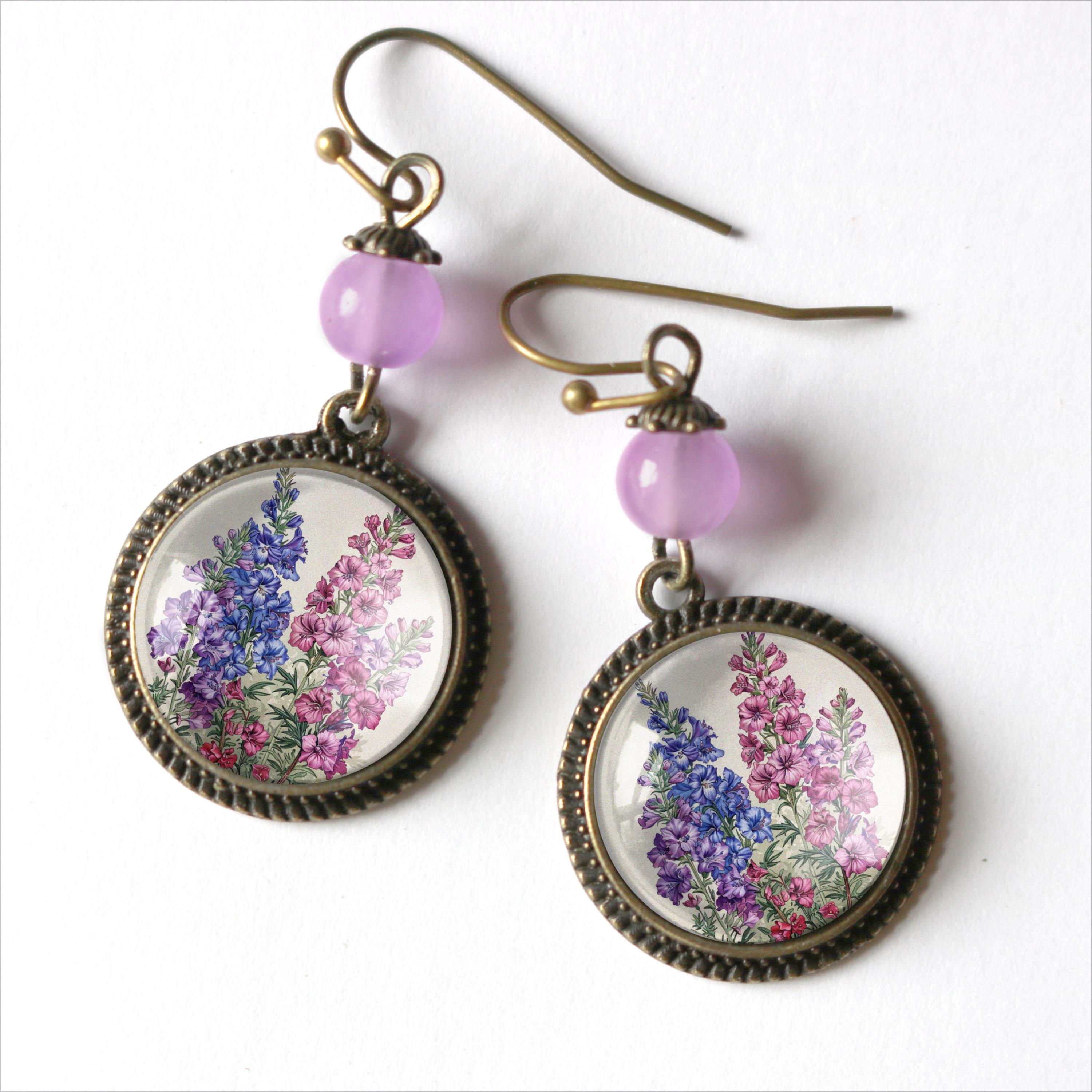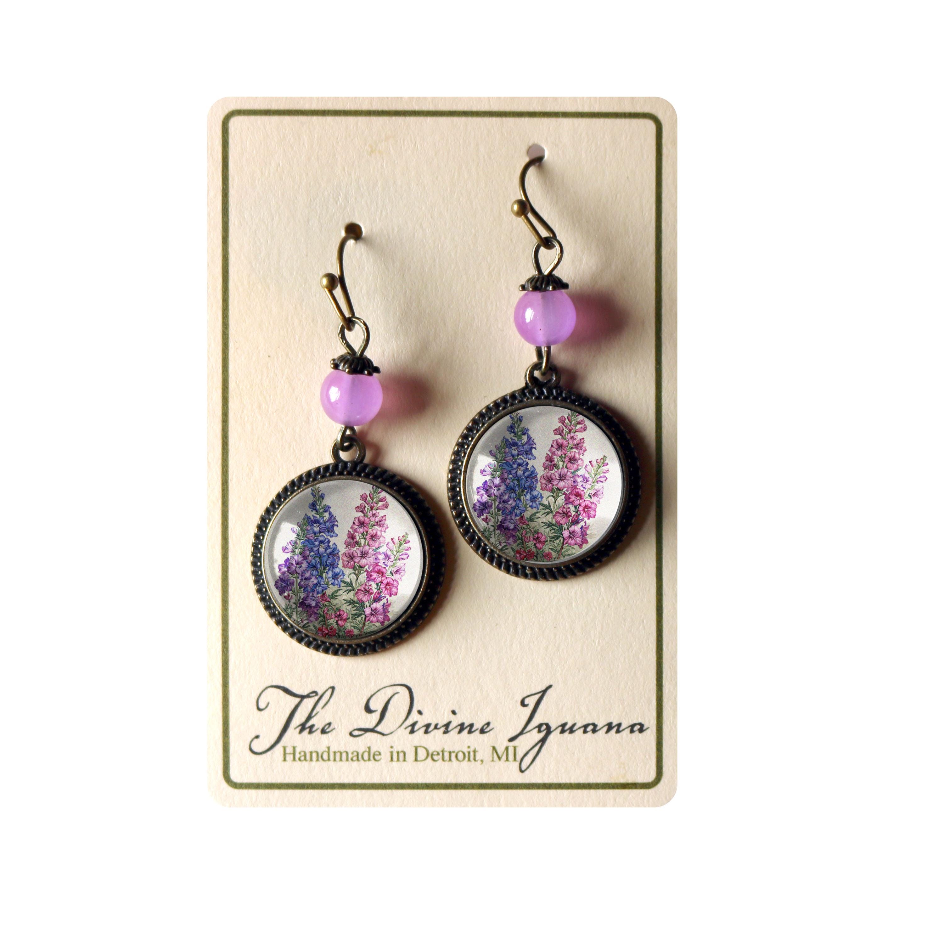 Elevate your style with our handmade Larkspur earrings, meticulously crafted to capture the timeless beauty of a purple aster, also known as a Delphinium. These earrings are made from nickel-free bronze with an antiqued finish, offering a warm, heirloom appearance. Each piece features reverse decoupaged glass cabochons showcasing a delicate illustration of the delphinium flower. A pale purple beaded accent in a bronze bead cap hangs adds a touch of elegance. Lightweight and unique, these earrings are perfect for spring and summer occasions or as a charming gift for gardeners and floral enthusiasts.
