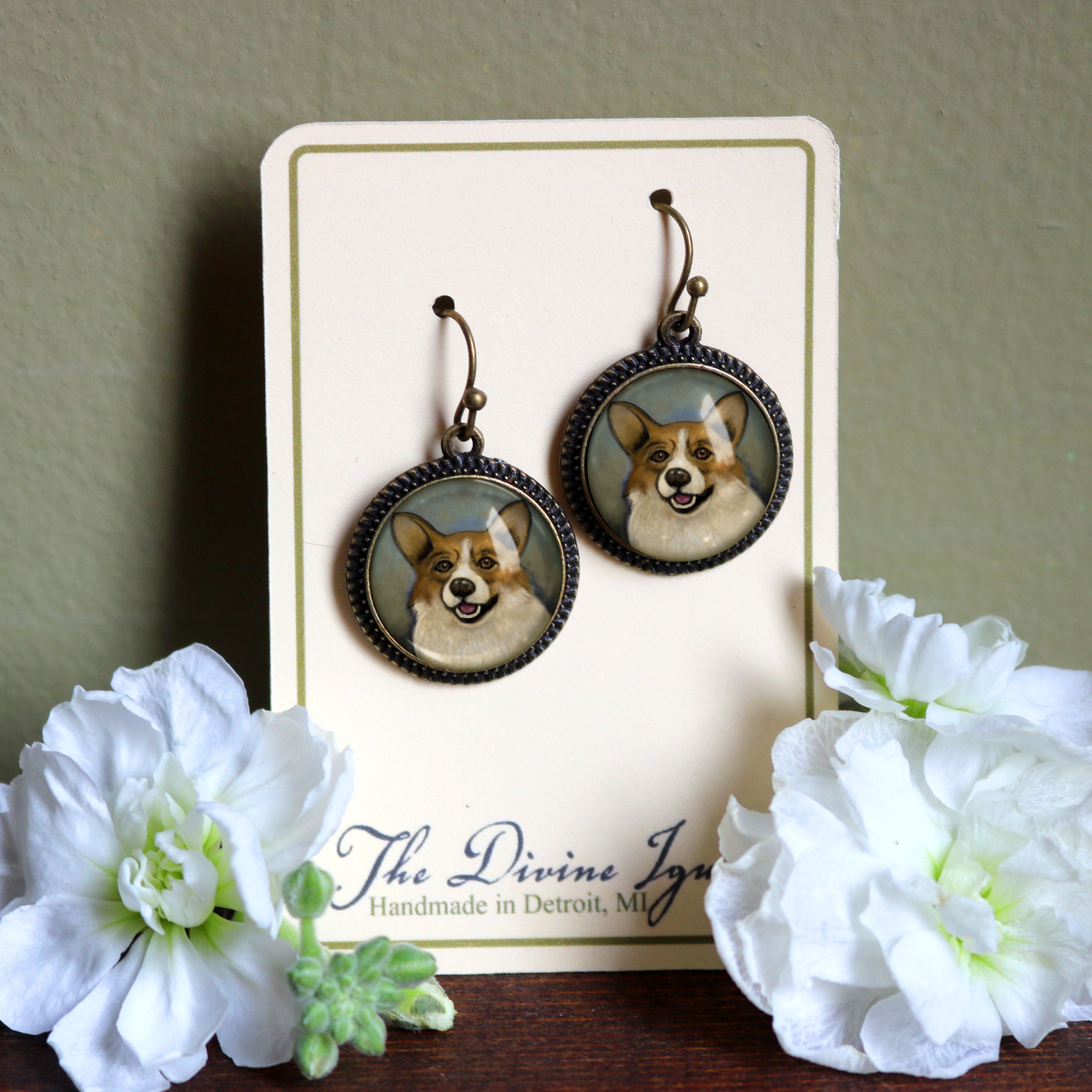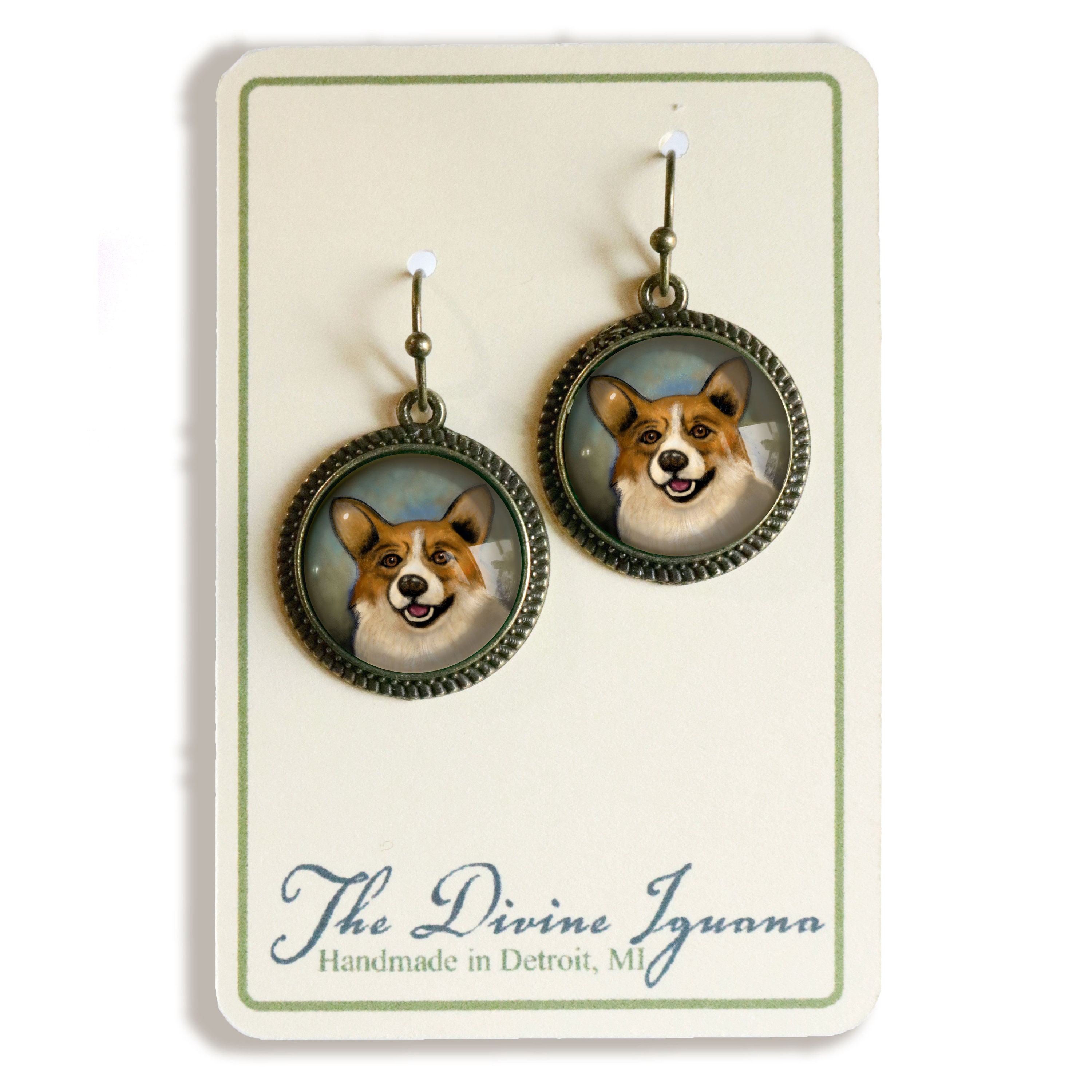 Our reversed decoupage glass cabochons are lovingly hand made in a home studio in Detroit, MI. The cabochons are carefully color matched and set in hand wrapped findings. This handmade process makes each set of Corgi earrings unique; expect subtle variations in color and clarity from pair to pair.
