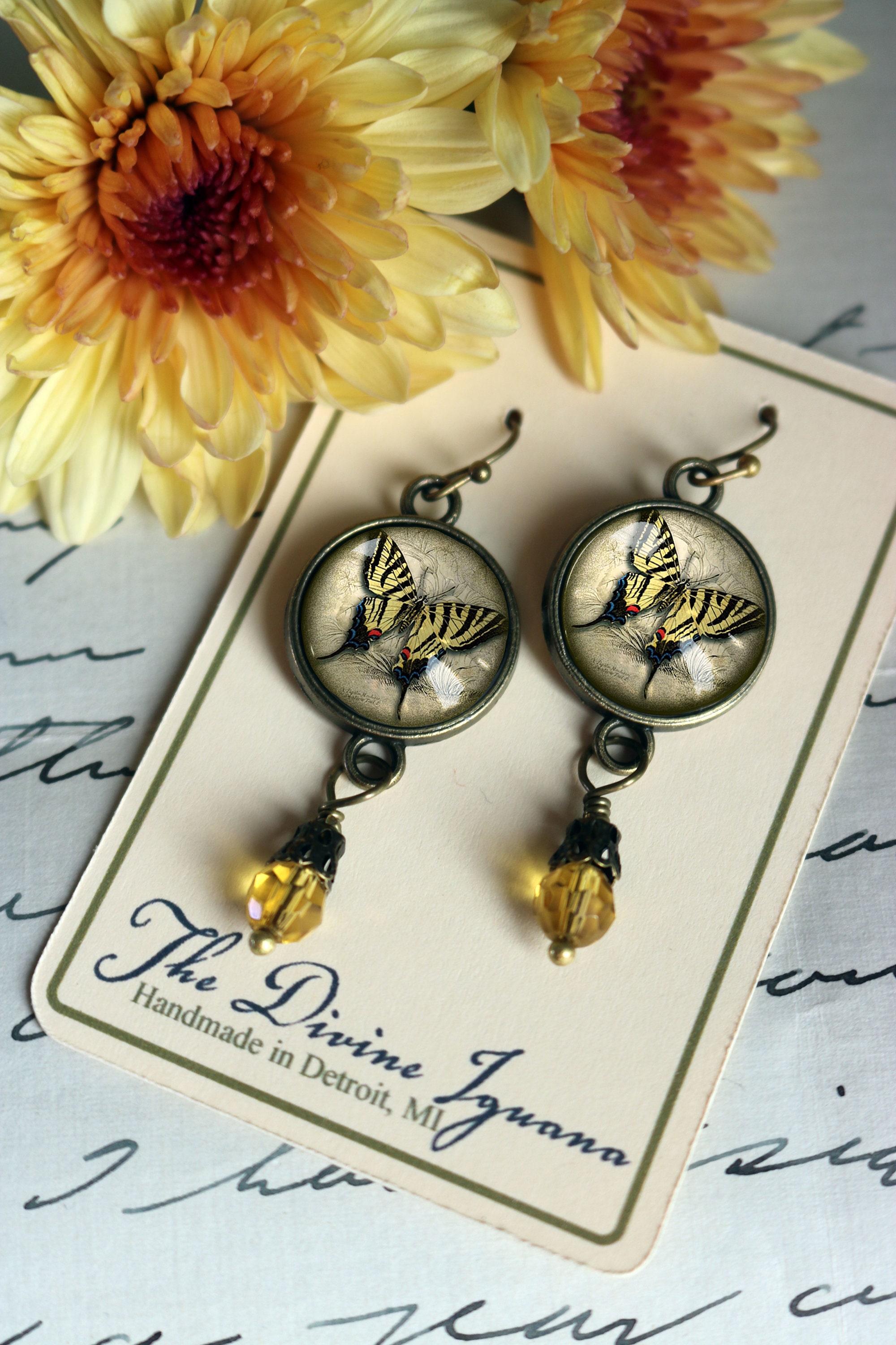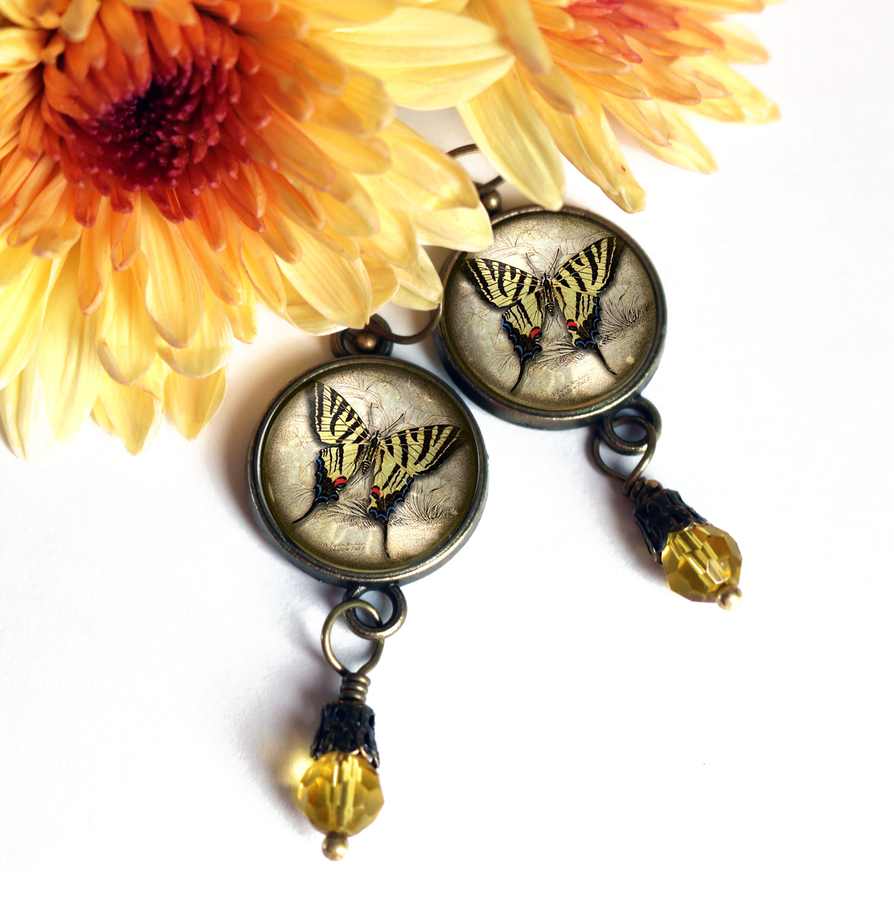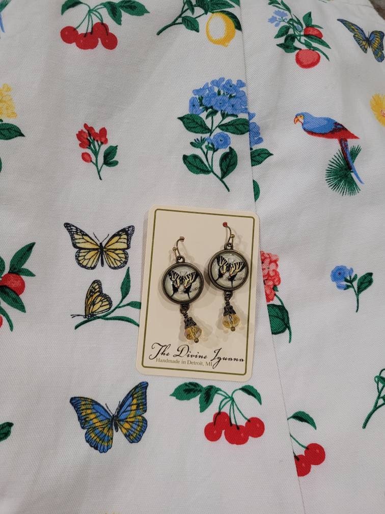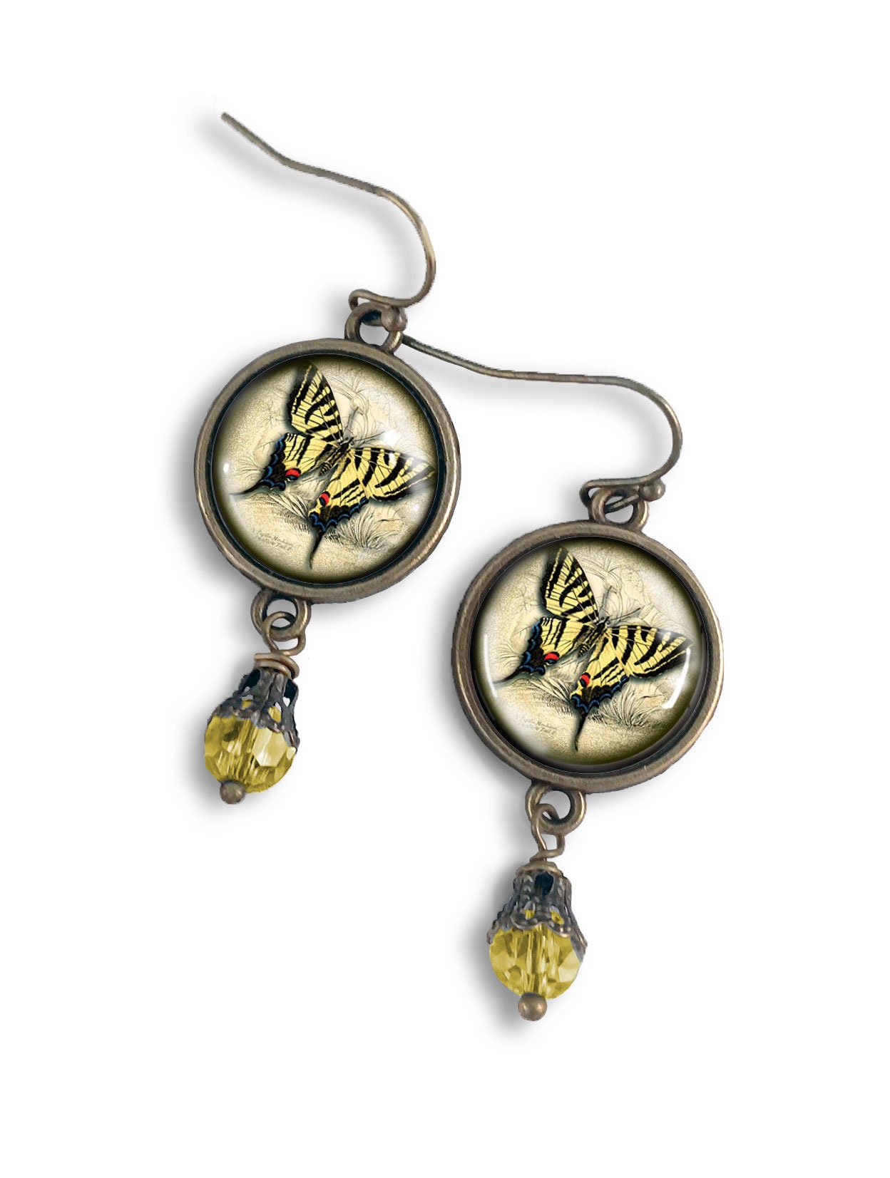 Capture the easy warmth of summer with these lovely swallowtail butterfly earrings. The heart of these pretty earrings is a vintage butterfly illustration painstakingly edited to fit into our sleek brass findings. Each resin filled earring is finished off with a faceted yellow glass bead with an elegant brass filigree bead cap.
