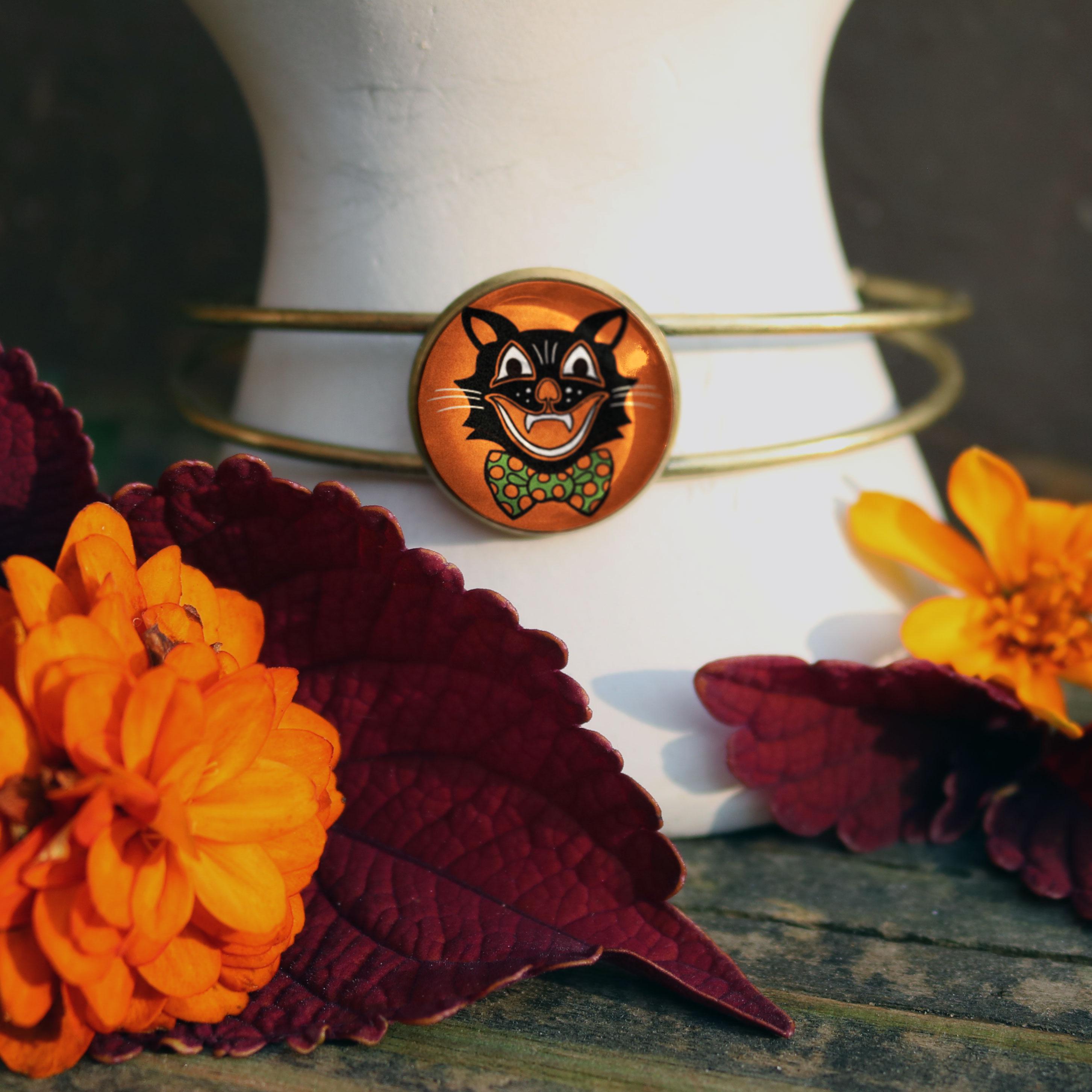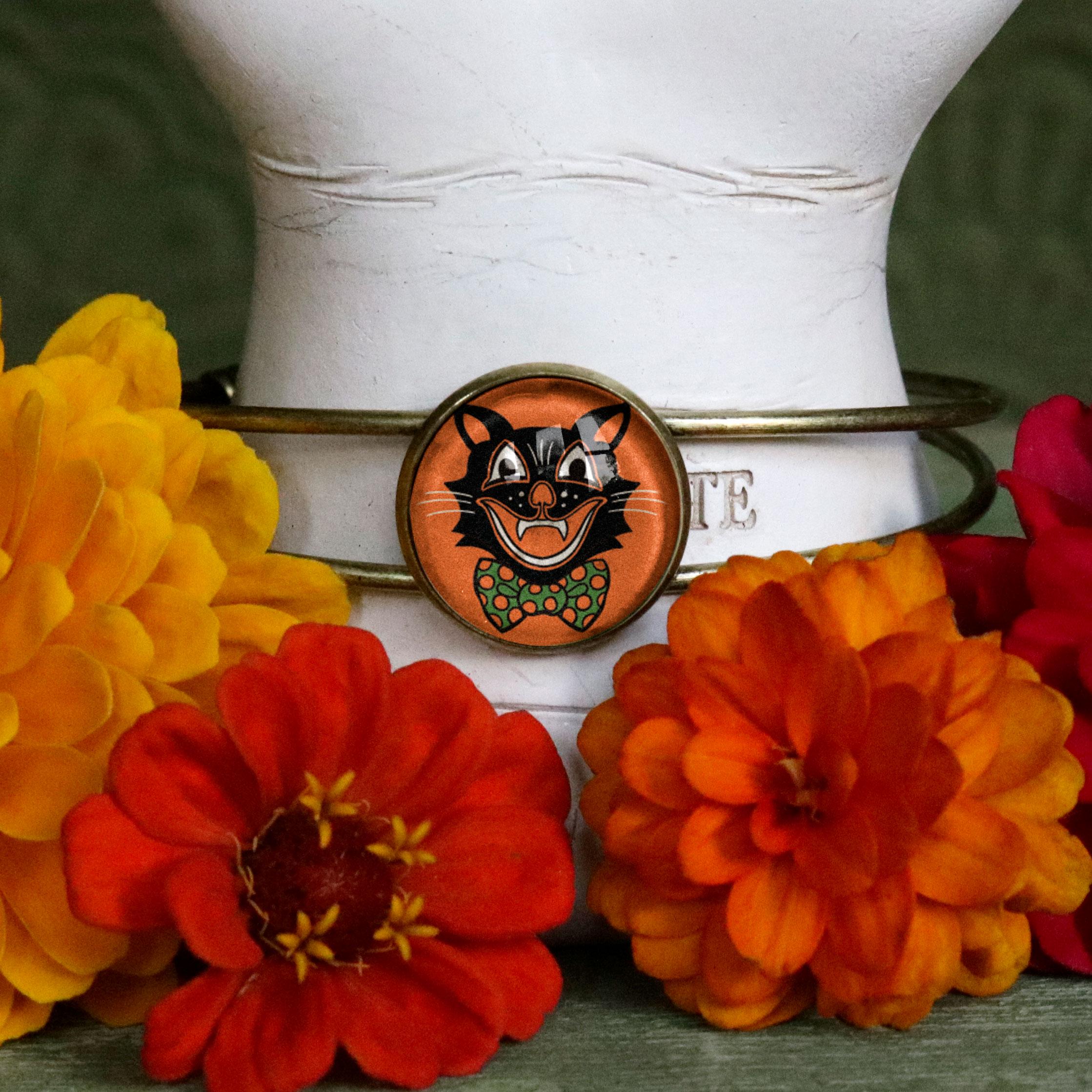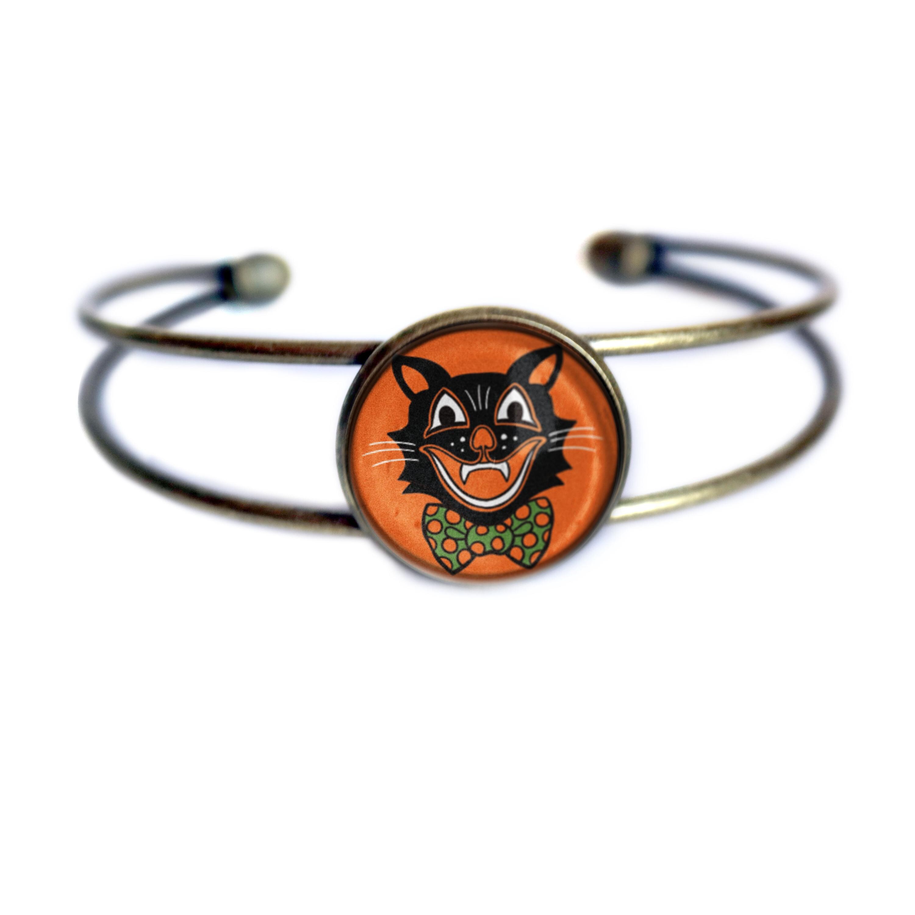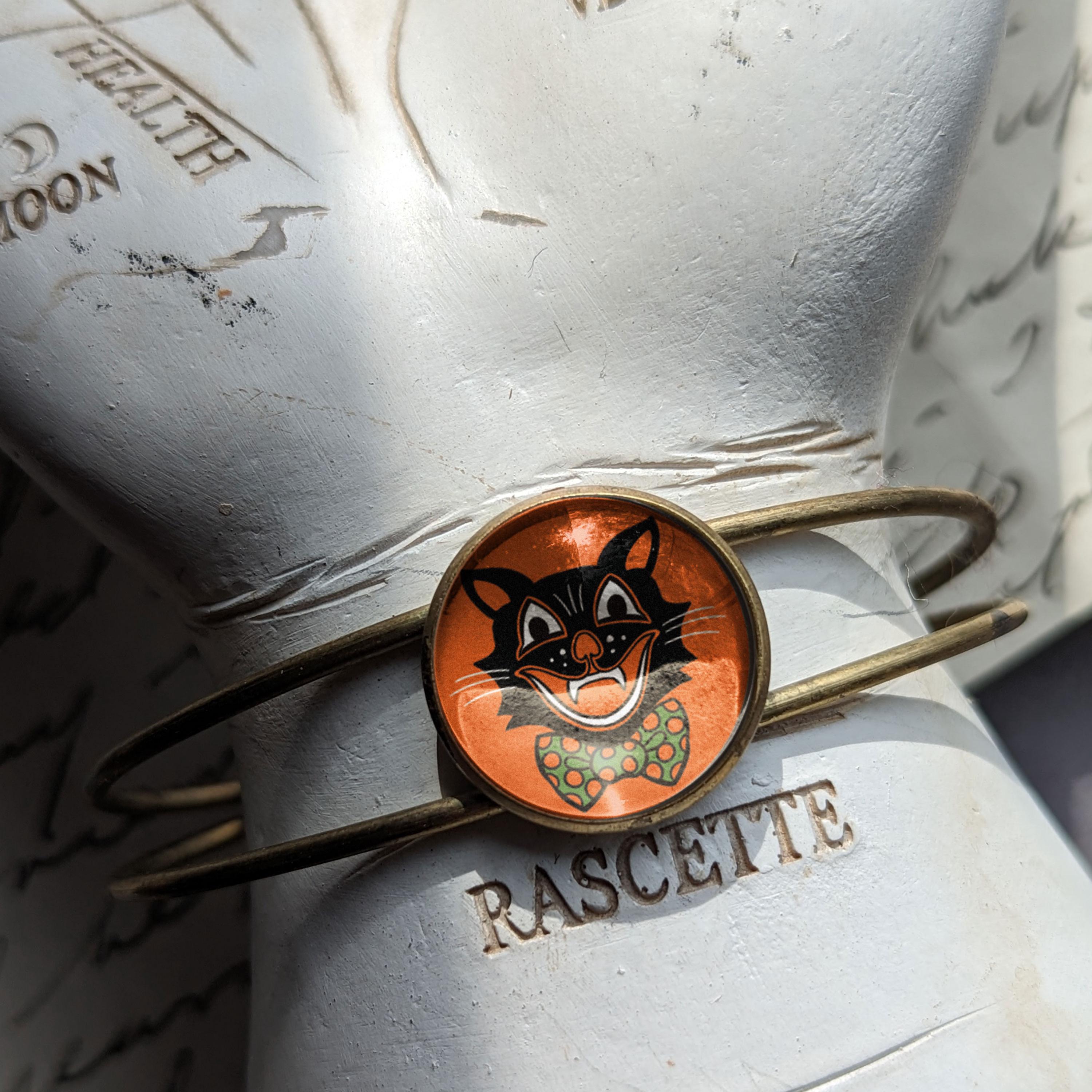 Have a very happy Halloween with our Black Cat bracelet. Our whimsical cat image was inspired by Hallween decorations from the 40's-70's. This fun image is encased behind a dome of glass and then set into simple bronze bezel. Each bracelet is hand made in a home studio.