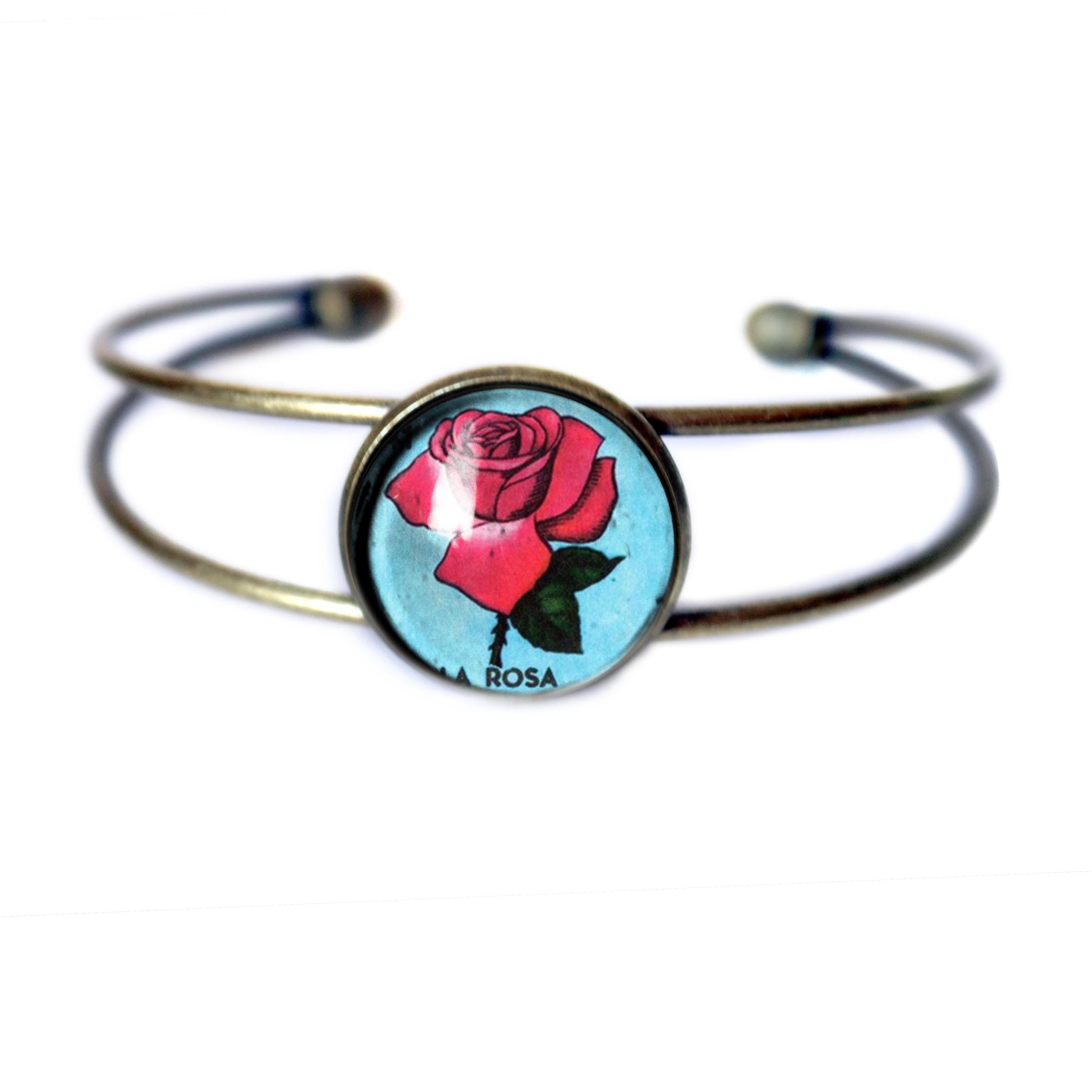 To create your La Rosa bracelet the image was first printed onto archival fine art paper, then cut to size and applied by hand to the back of a glass cabochon. This process makes every piece of Divine Iguana jewelry unique. Expect subtle changes in color and clarity from item to item.
