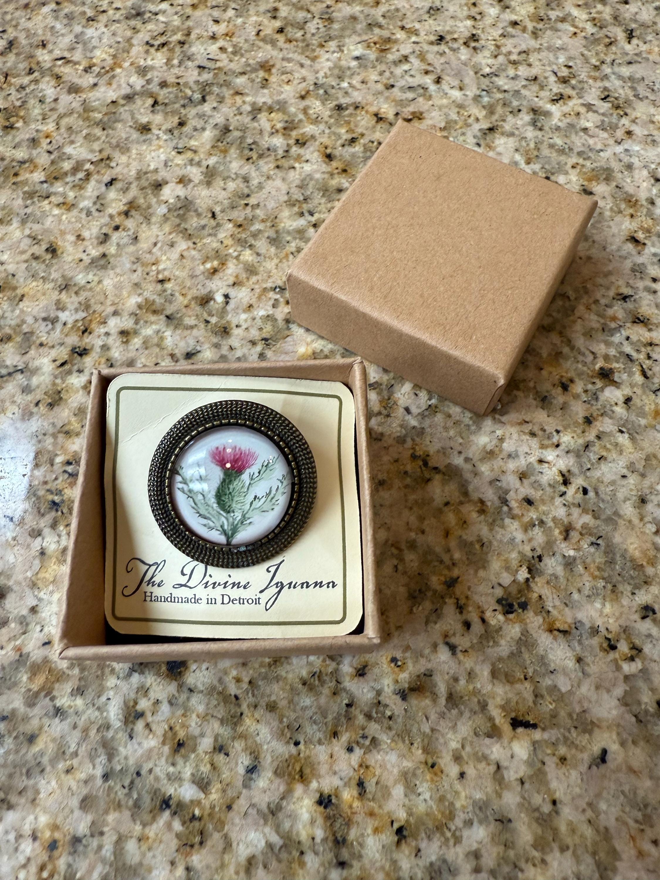 This lovely little brooch capture the stately thistle in all her majesty. A Victorian botanical illustration of a thistle rests under a 20 mm glass cabochon.
