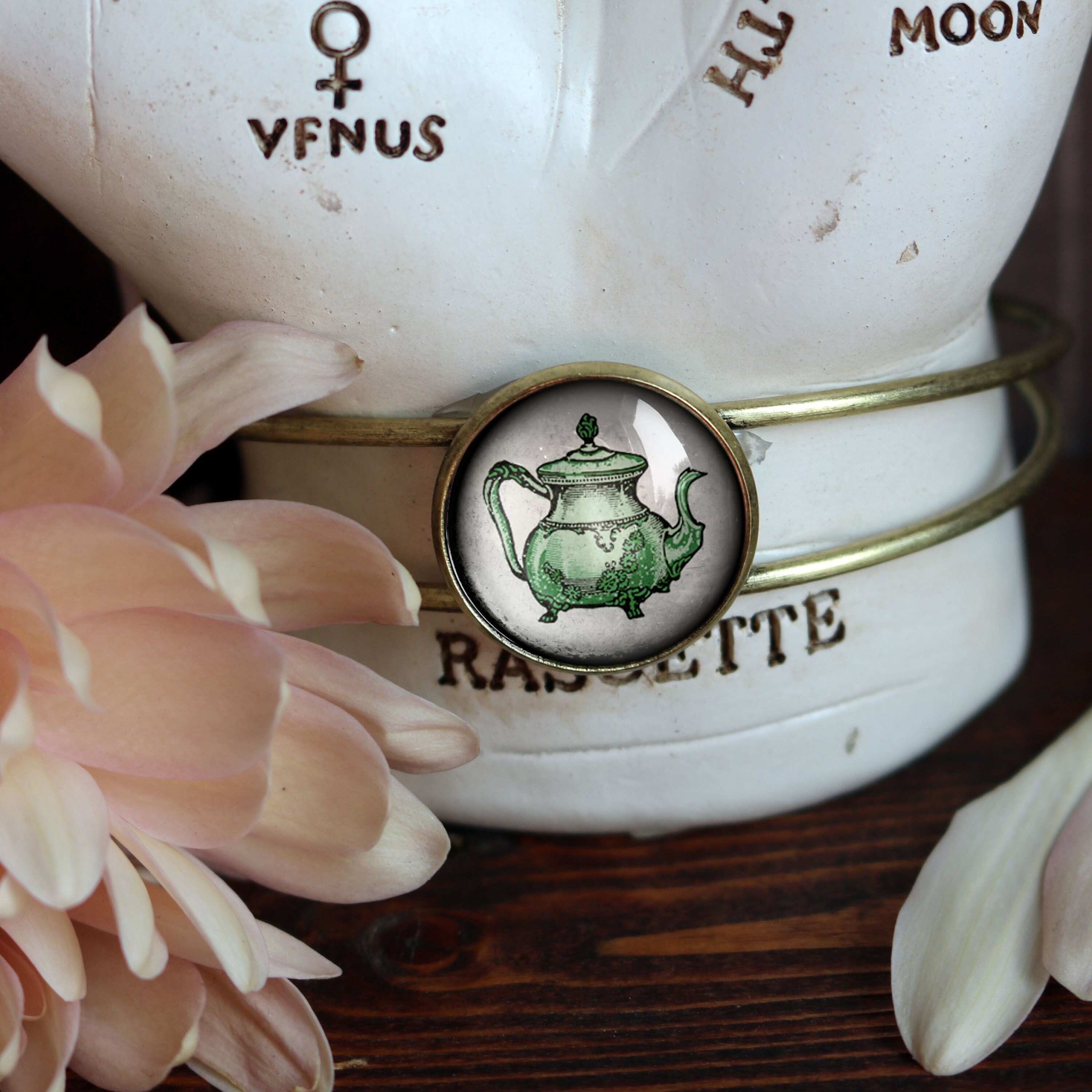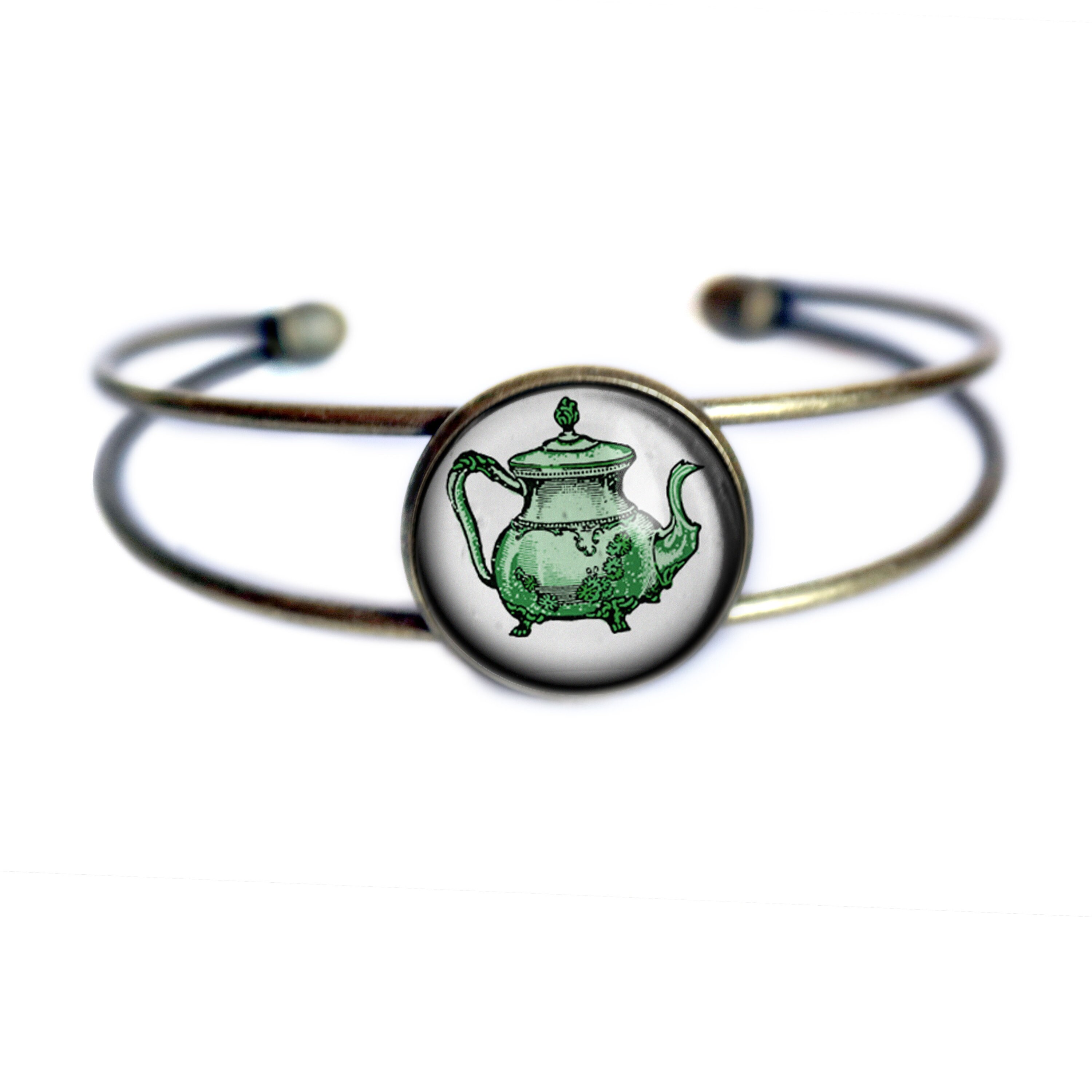 To create your teapot bracelet the image was first printed onto archival fine art paper, then cut to size and applied by hand to the back of a glass cabochon. This process makes every piece of Divine Iguana jewelry unique. Expect subtle changes in color and clarity from item to item.