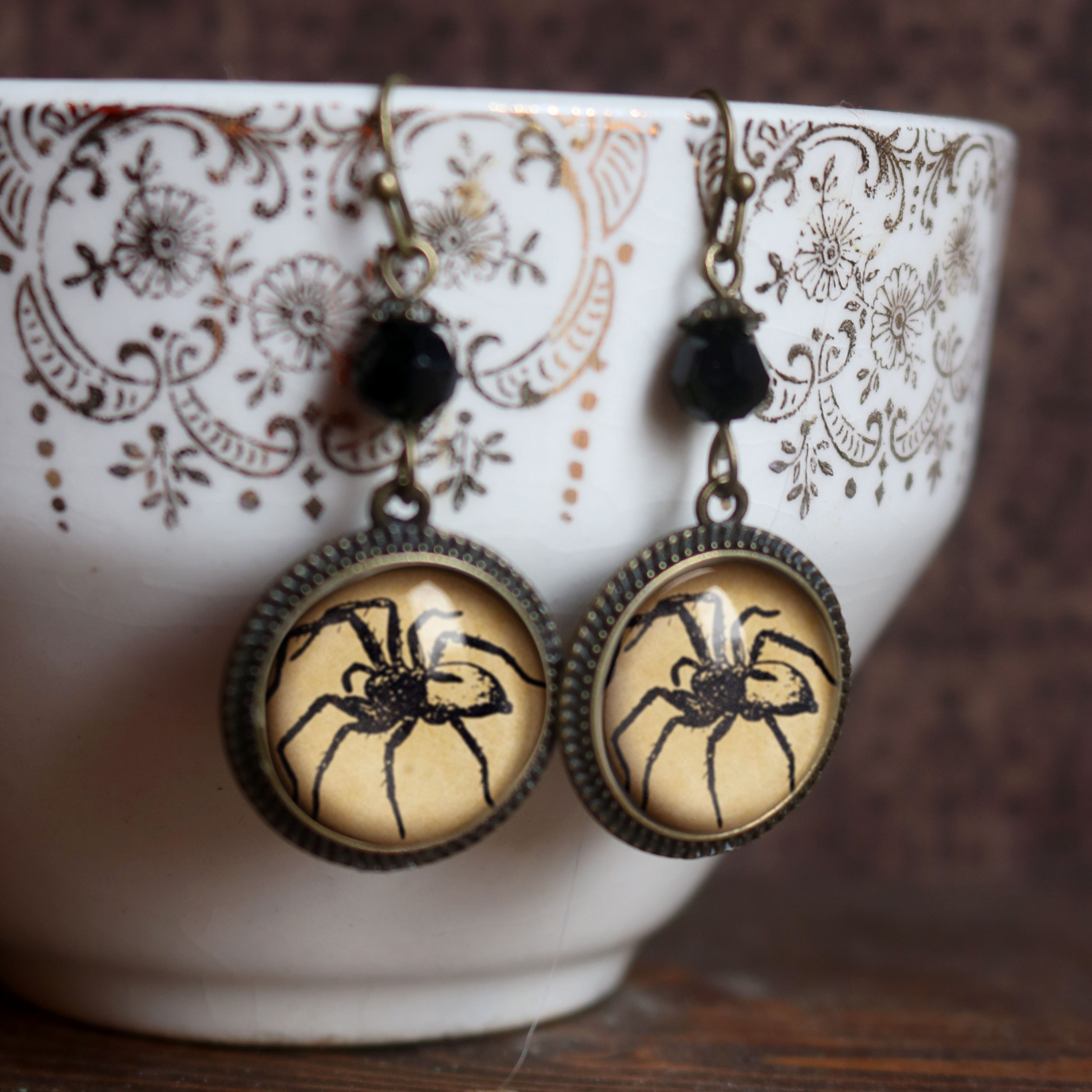 Have a creepy crawly Halloween with our Spooky Spider earrings. Inside each sleek brass finding is a Victorian era illustration of a scary spider. Each earring is finished off with a black glass bead in an elegant brass bead cap.