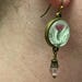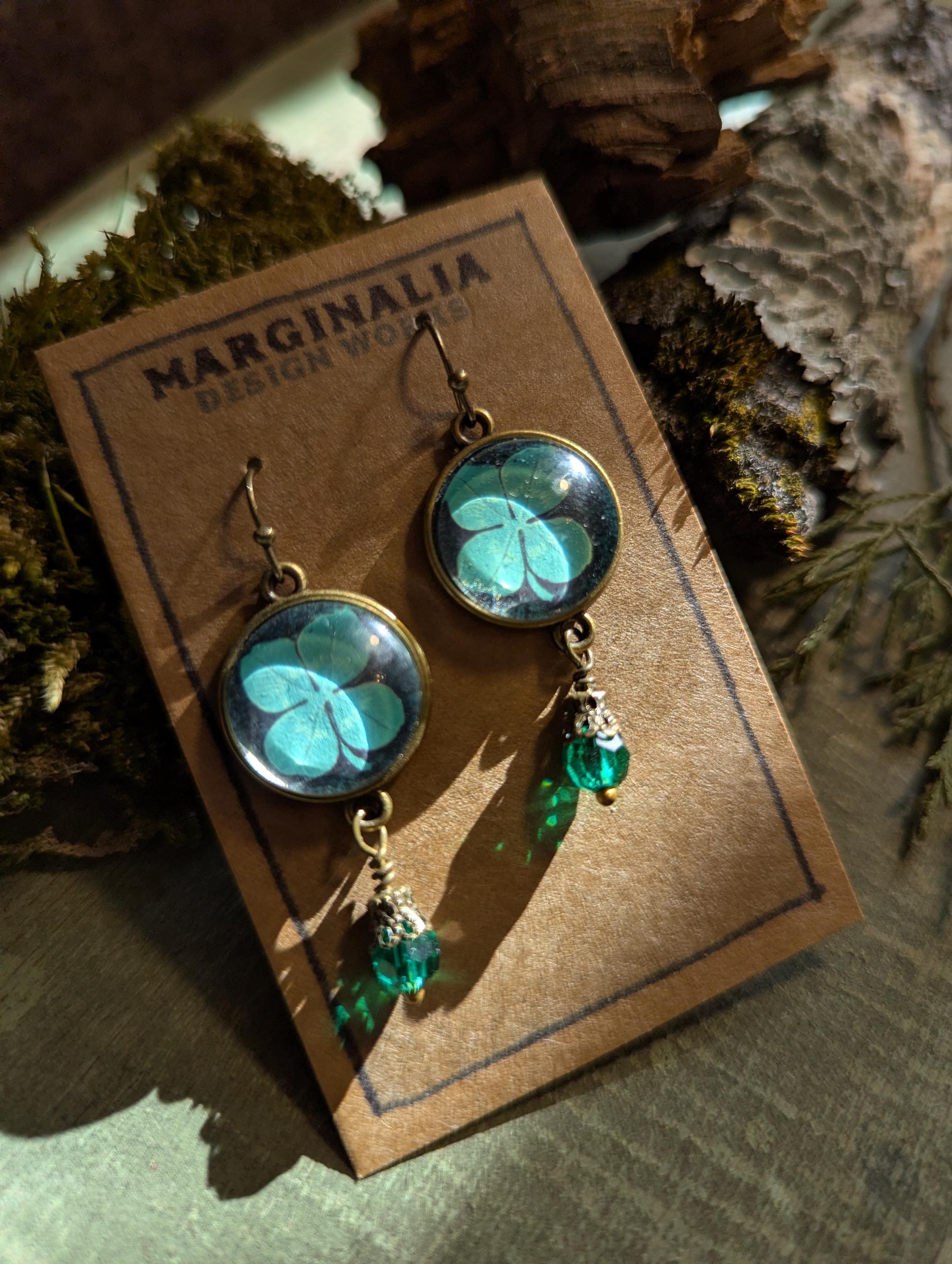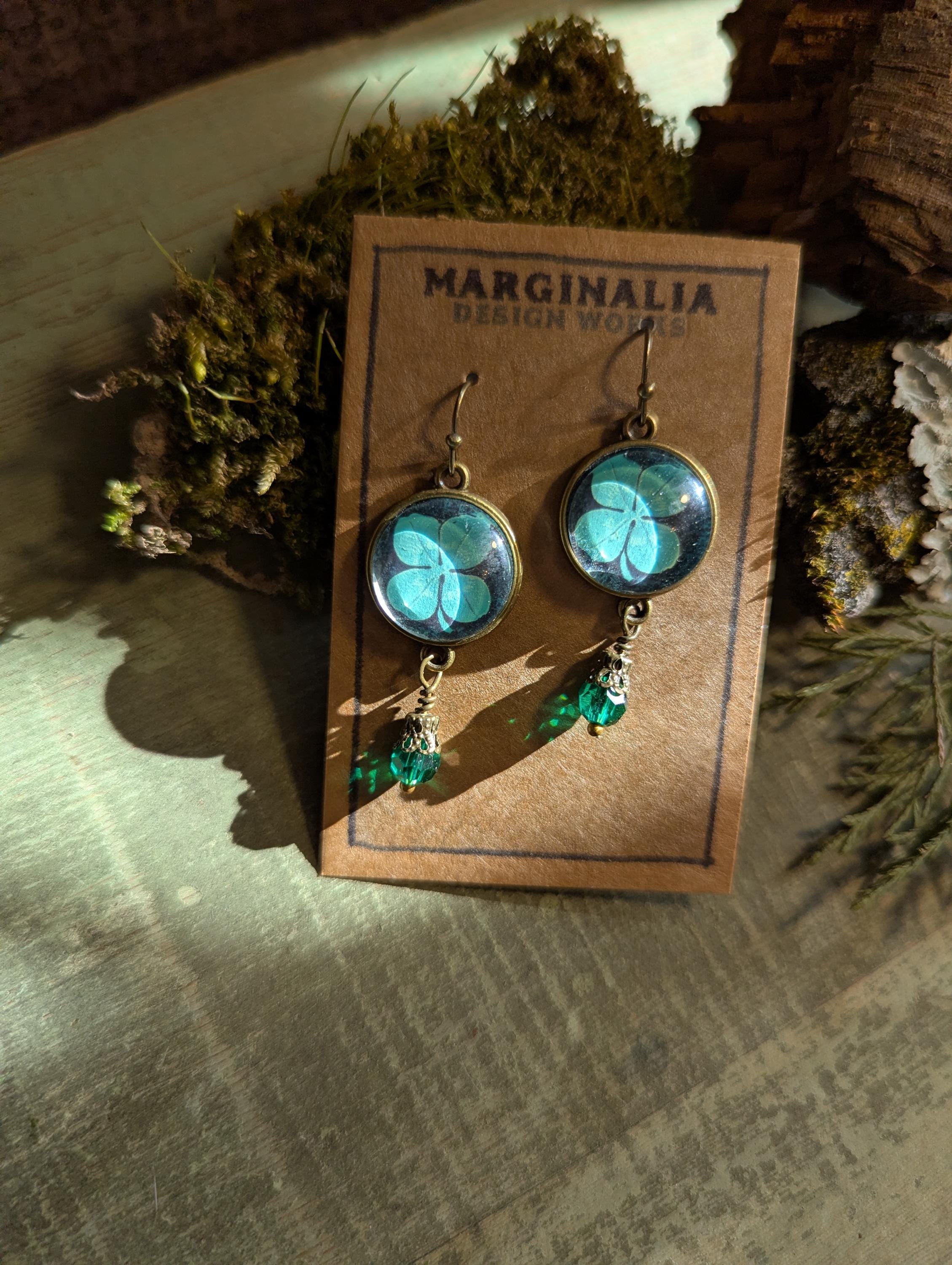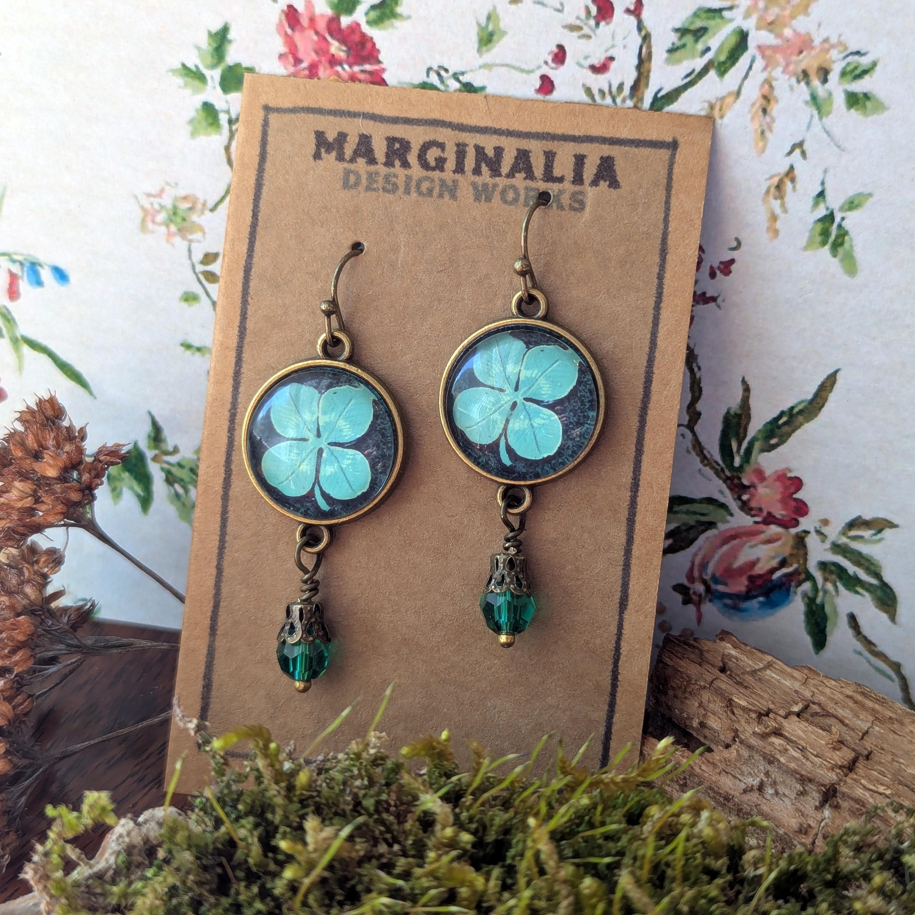 Original clover illustration by Rena Hopkins of Brainmeats Atelier, encapsulated under glass. Beneath is a faceted teal bead in an ornate filigree bead cap.