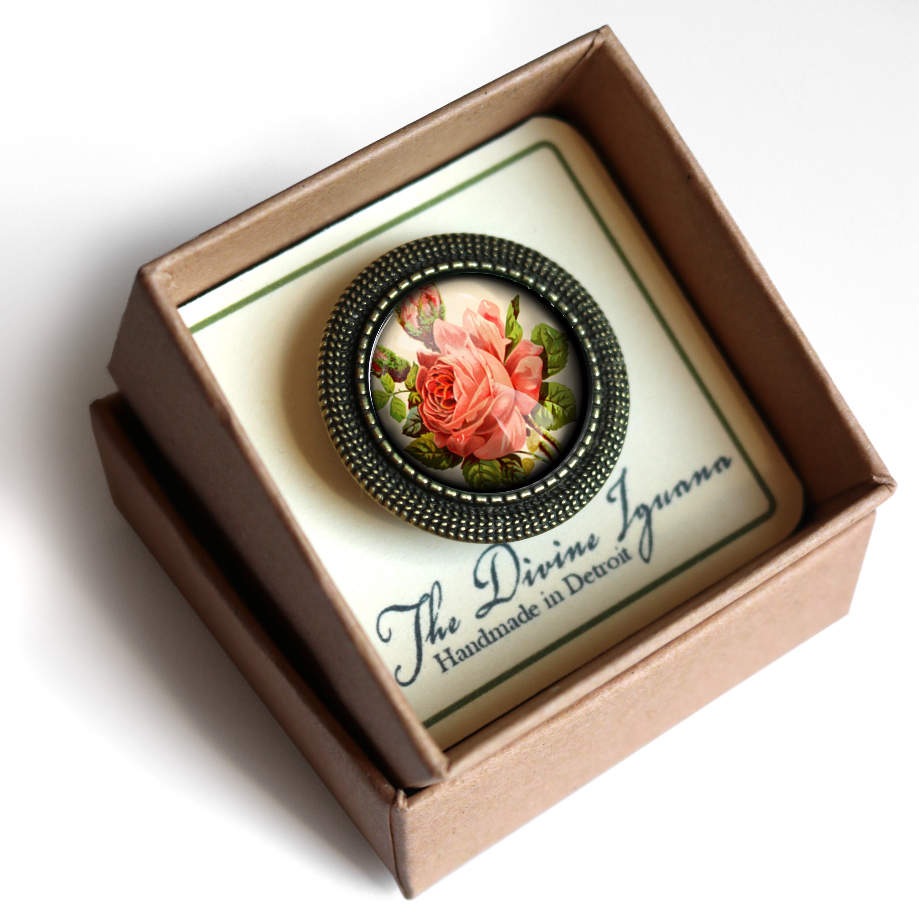 Simple, vintage inspired brooch with brass setting.