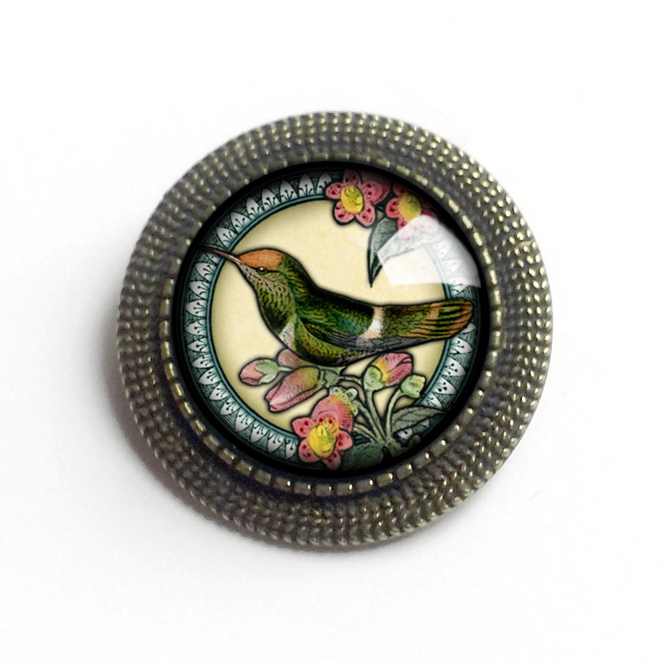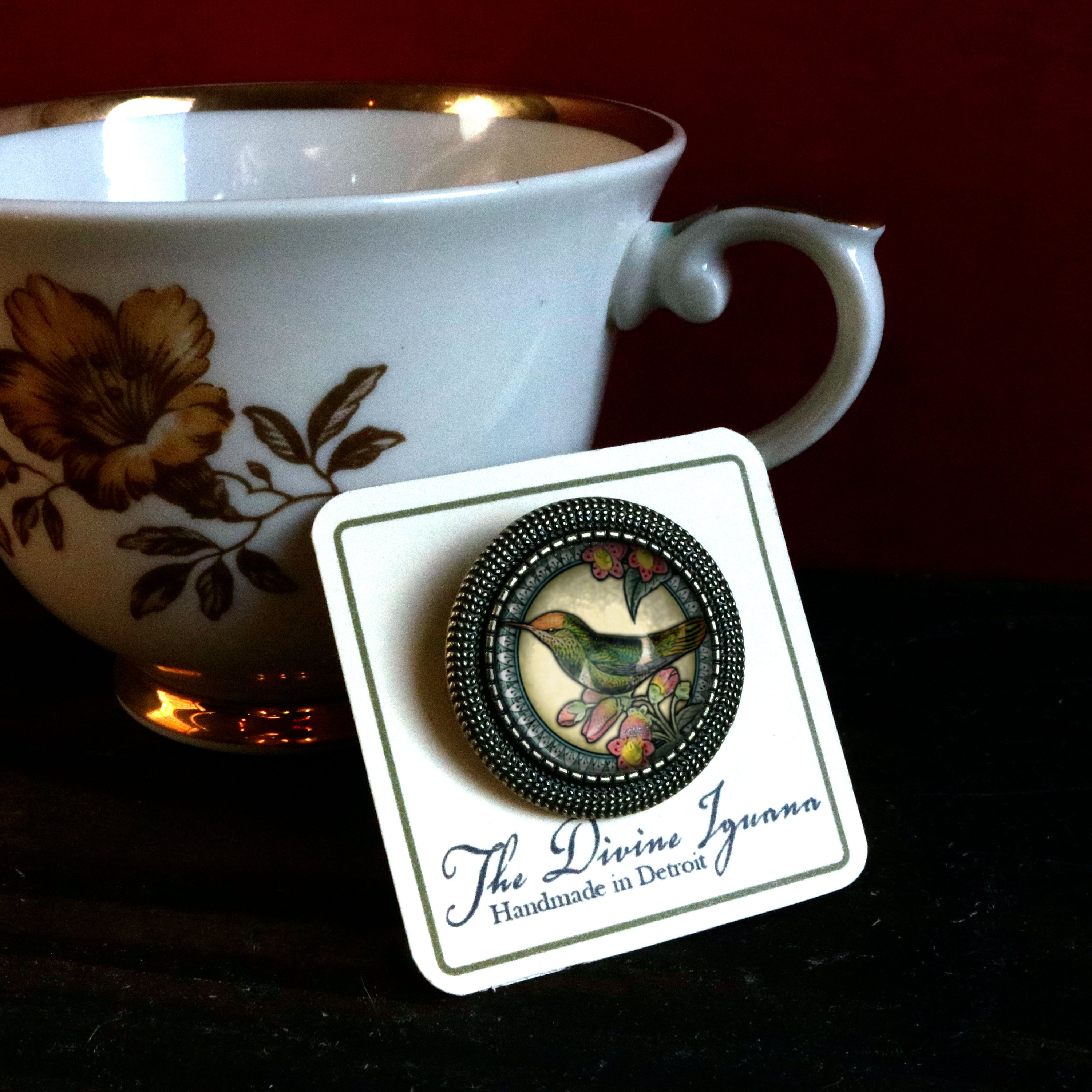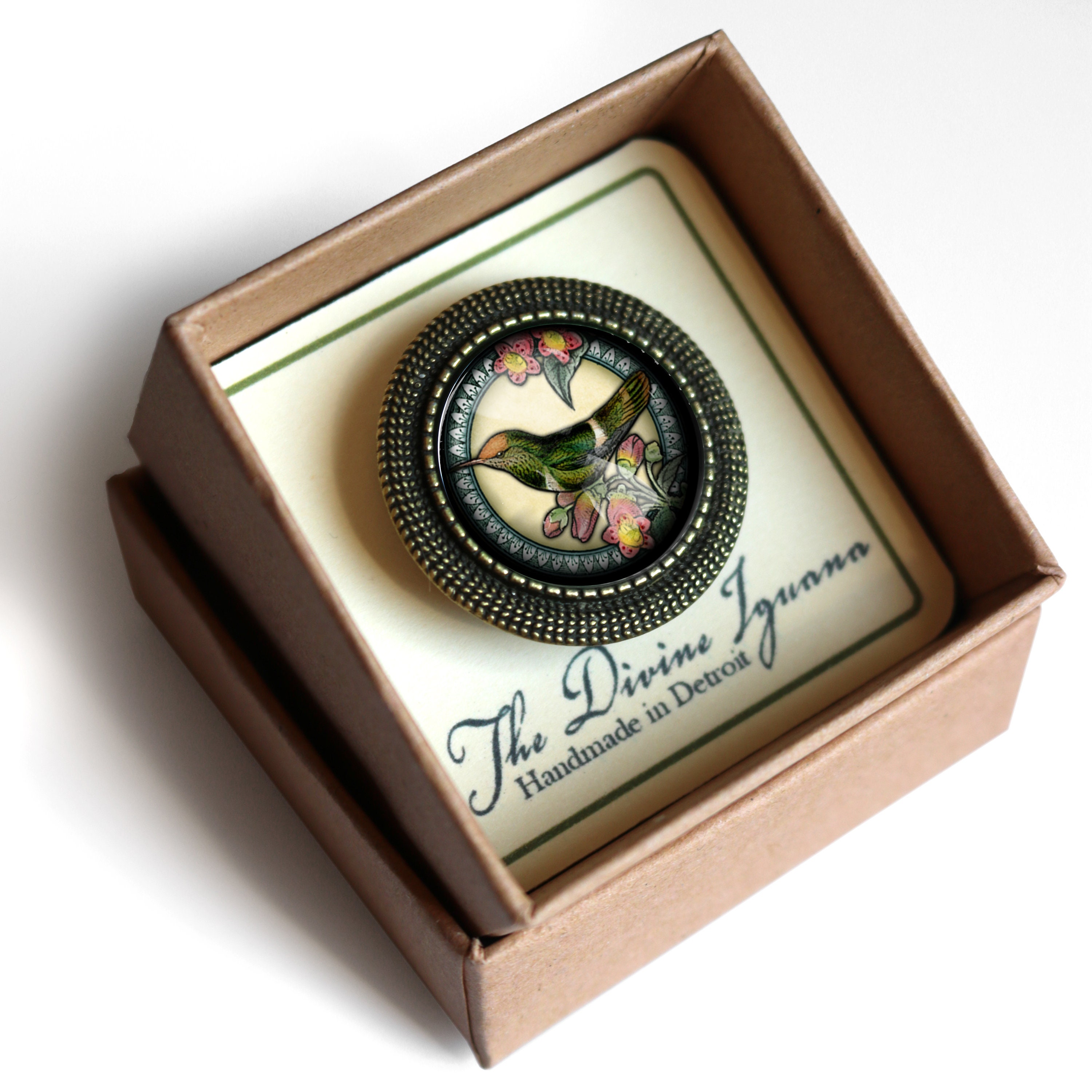 1" brass brooch with 20mm reversed decoupage glass cabochon. Arrives carded inside a chipboard gift box.