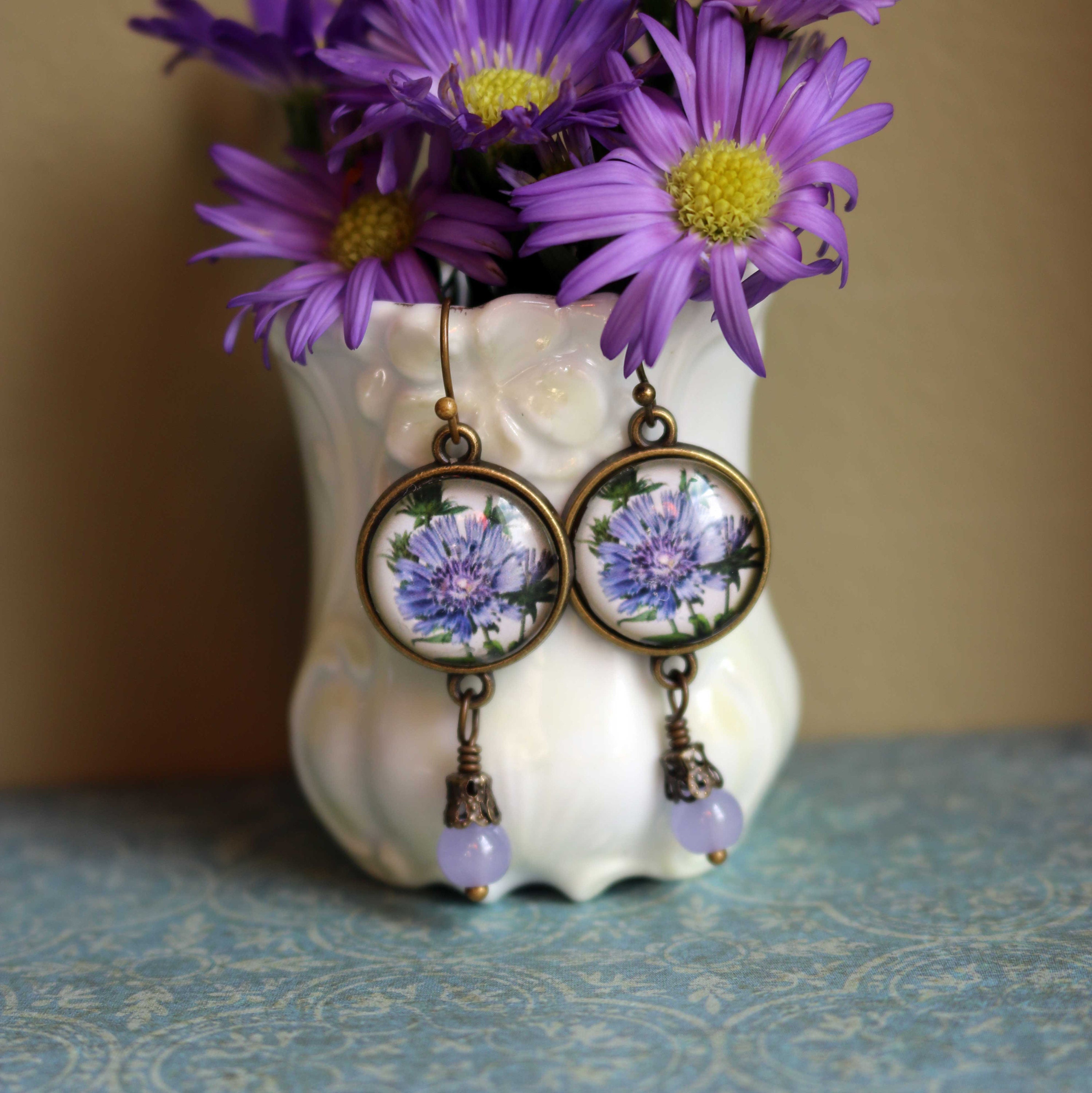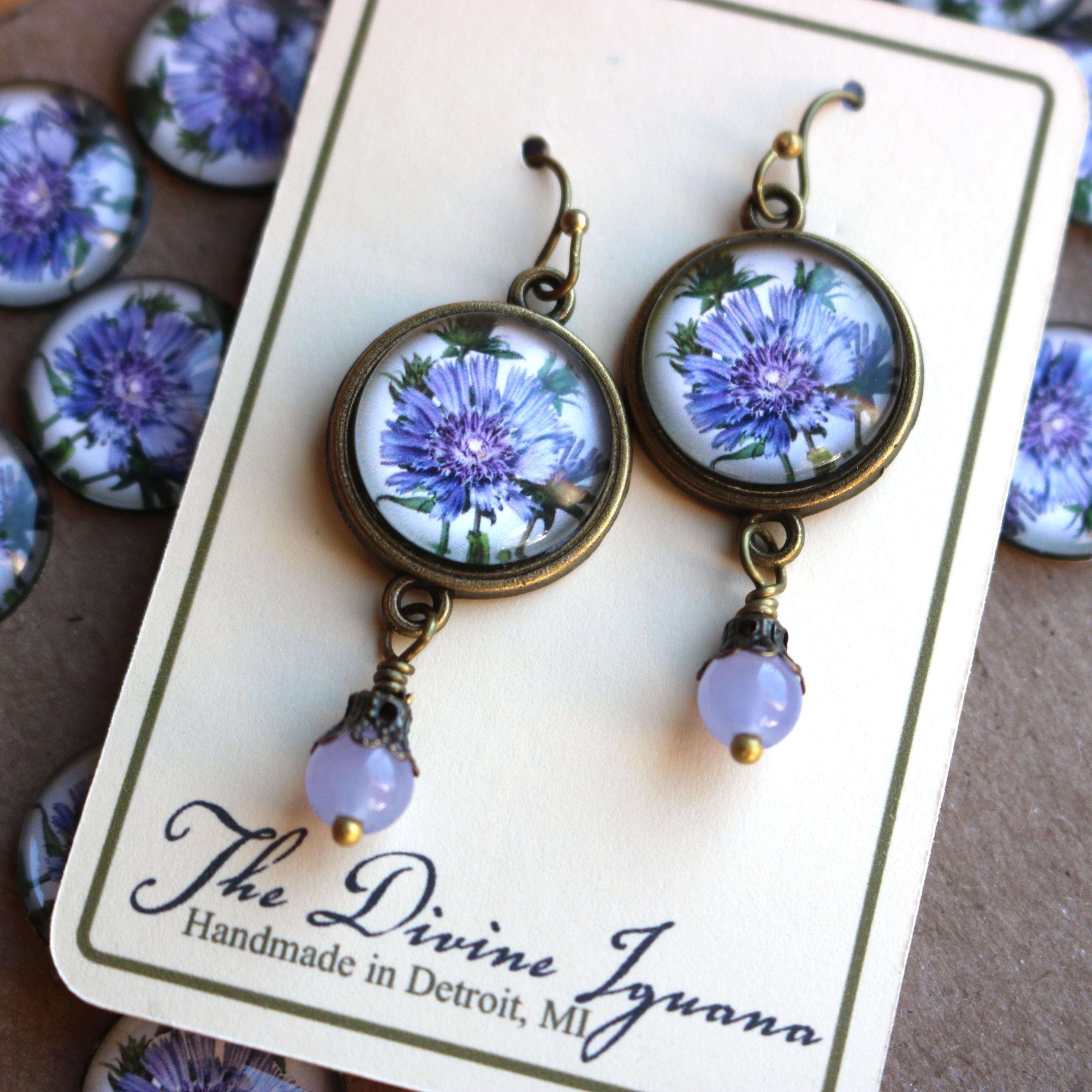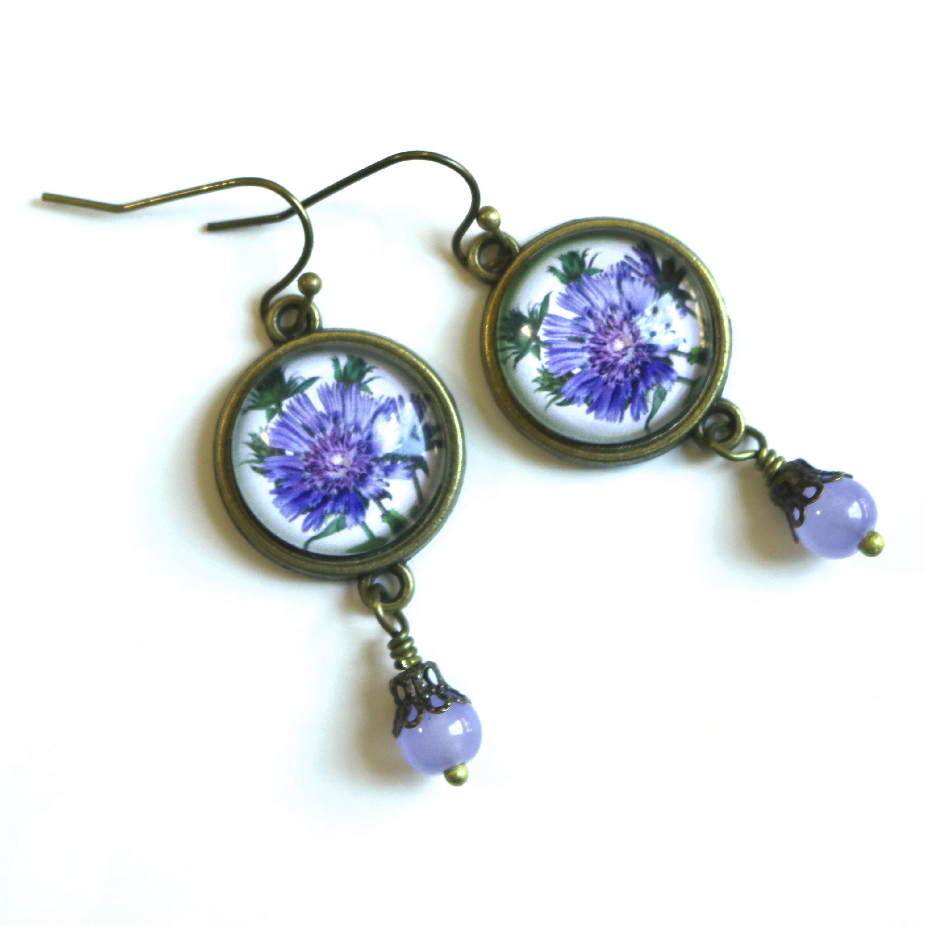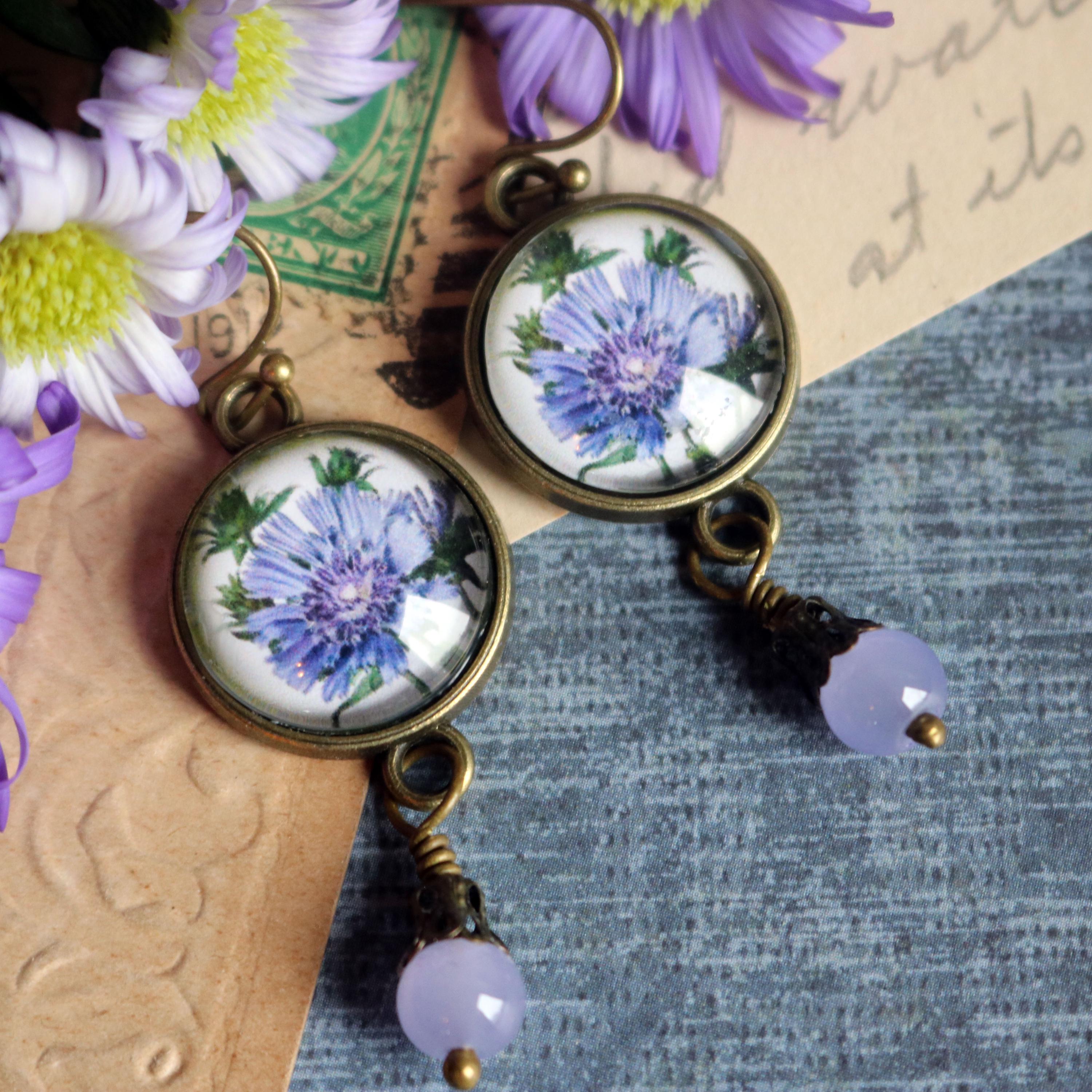 Elevate your style with our Handmade Victorian Aster Earrings, meticulously crafted to capture the timeless beauty of a purple aster, also known as a Bachelor's Button. These earrings are made from nickel-free bronze with an antiqued finish, offering a warm, heirloom appearance. Each piece features reverse decoupaged glass cabochons showcasing a Victorian botanical illustration of the vibrant aster flower. A hand-wrapped pale purple beaded accent in a delicate filigree bead cap hangs gracefully below, adding a touch of elegance. Lightweight and unique, these earrings are perfect for spring and summer occasions or as a charming gift for gardeners and floral enthusiasts.